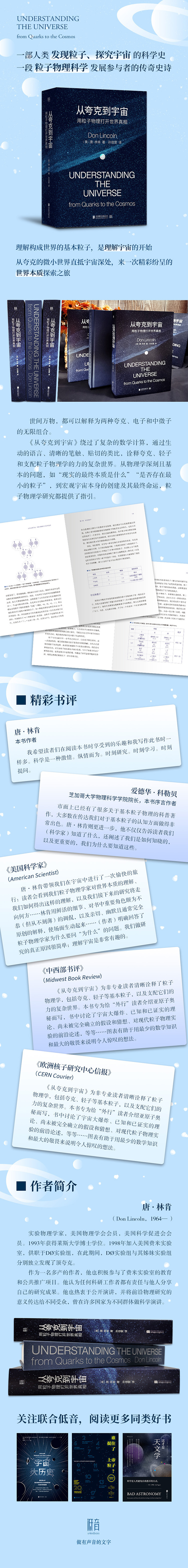 唐·林肯带领我们进行了一次愉快的宇宙旅行:读者会看到我们粒子物理学家对世界本质的理解、我们如何得出这样的理解,以及我们接下来的研究将走向何方……林肯用鲜活的细节、对角色颇为不恭(但从不刻薄)的调侃,以及亲切、幽默且通常完全原创的解释,使场面生动起来……(作者)明确回答了粒子物理学家为什么要问“为什么”的问题。我们做研究的真正原因很简单:理解宇宙是非常有趣的。