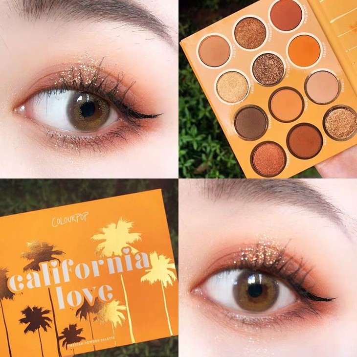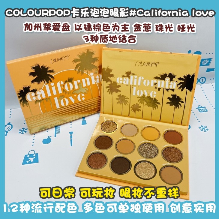 COLOURPOP卡樂泡泡眼影#California love👍加州挚爱盘,以橘棕色为主,金葱、珠光、哑光3️⃣种质地结合,兼顾了美和时尚,温柔又浪漫。🎐粉质细糯丝滑,一抹上色好晕染。贴合眼部肌肤,浓郁可人持久显色,🍭上眼效果是高级的闪亮,使你拥有灵动的双眸👀。12种流行配色,多色可单独使用,创意实用,可日常,可玩妆,眼妆不重样。🍡