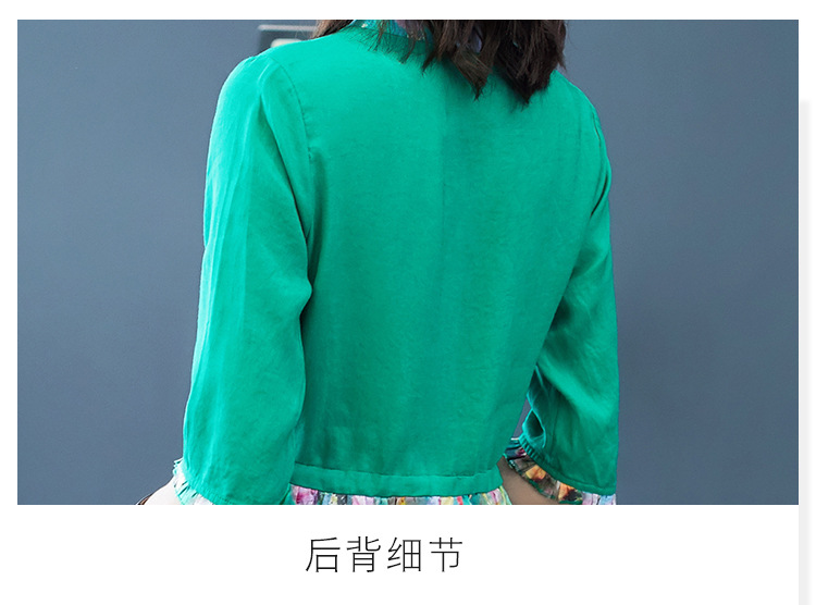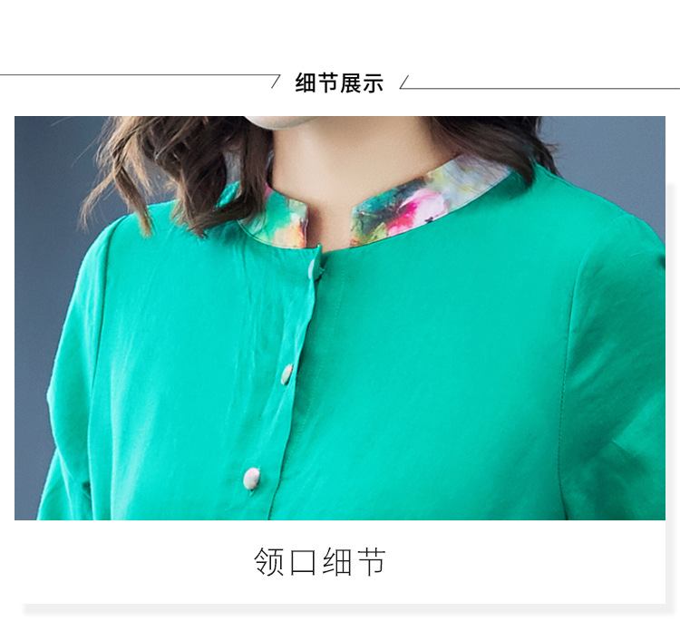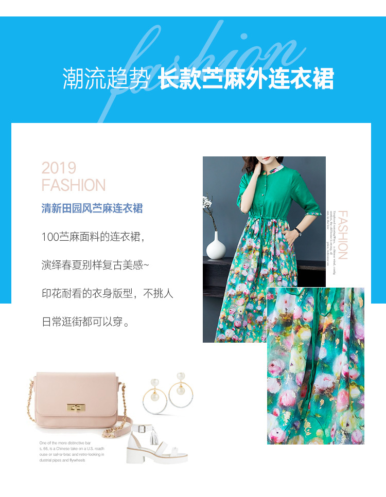 NYT-2026新款气质五分袖立领苎麻连衣裙复古印花显瘦中长裙