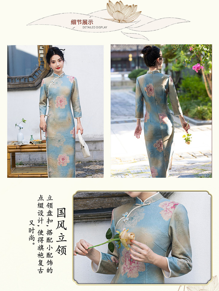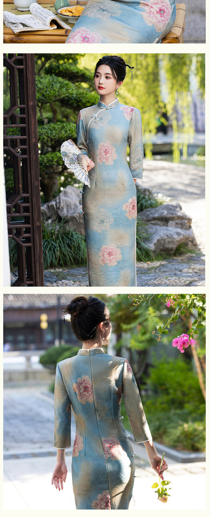 花开富贵晕染修身,云岚绒印花长款旗袍SJT698