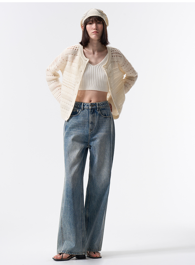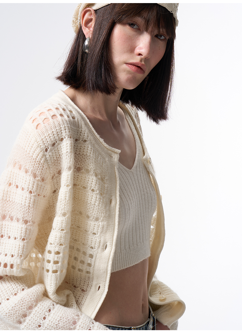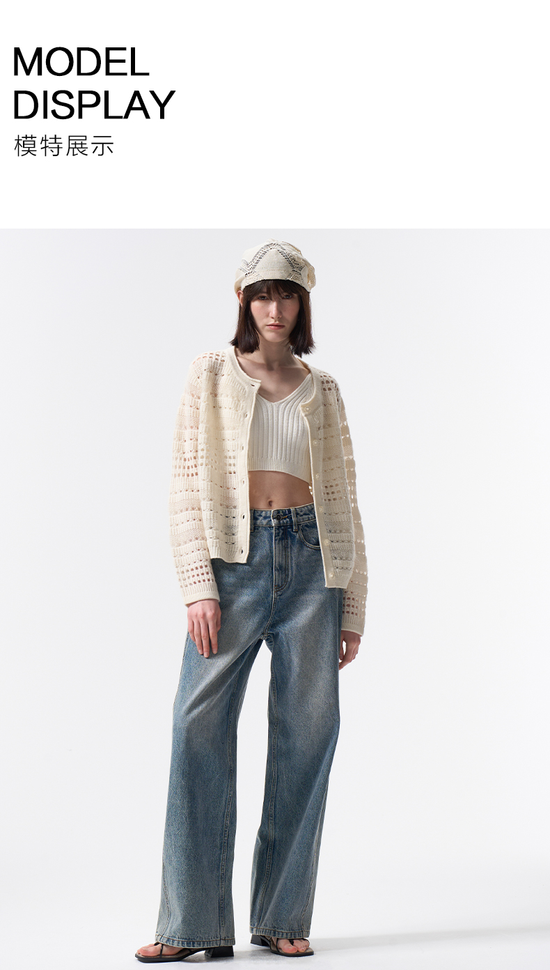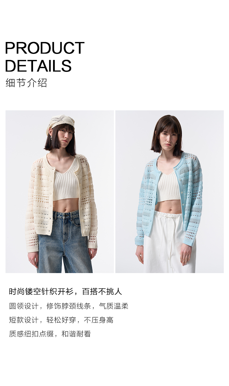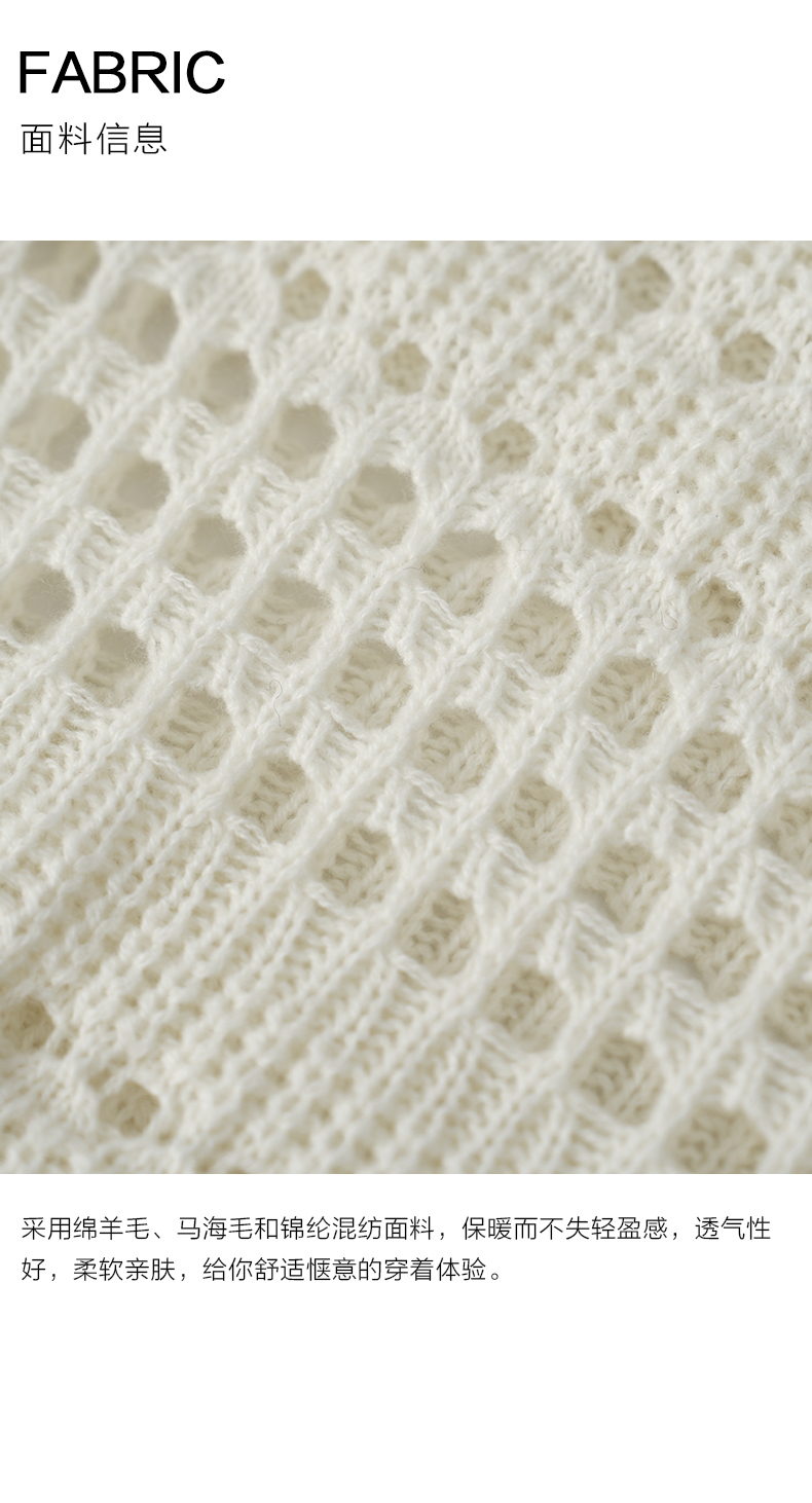 VIMAGE纬漫纪慵懒休闲风圆领镂空肌理绵羊毛针织开衫2026春季新款V2501108