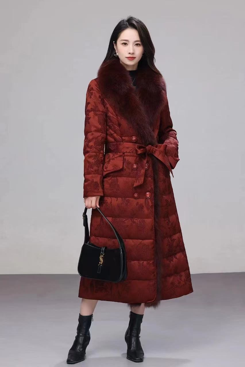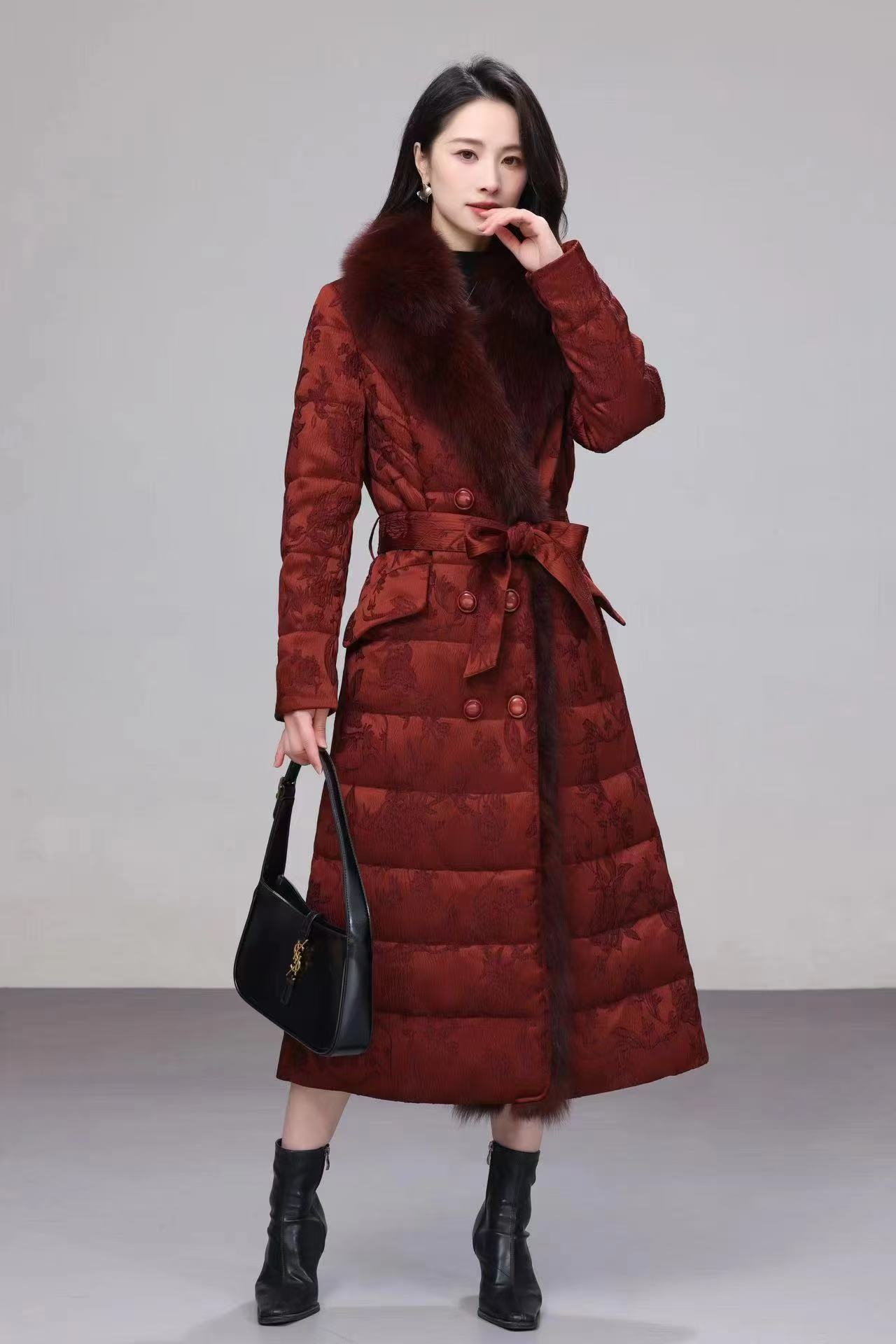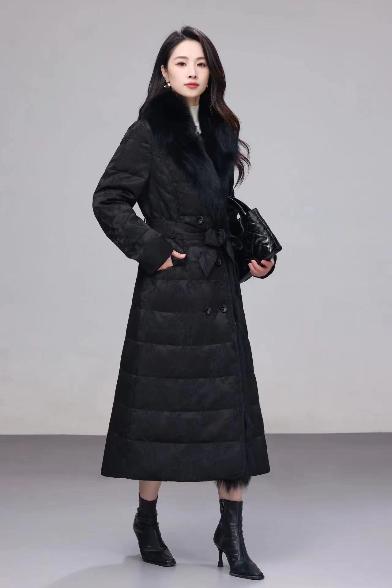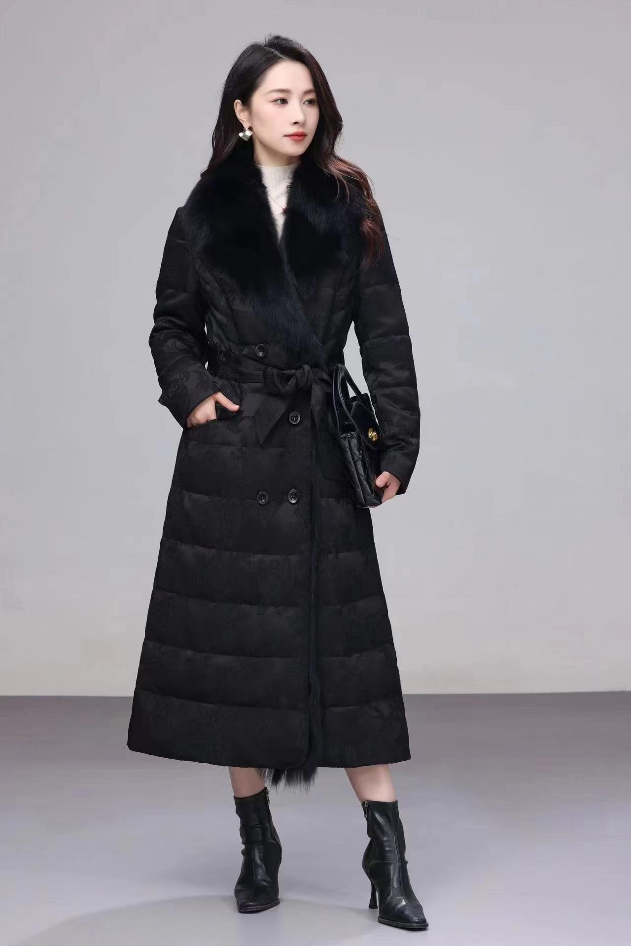 丁摩 大狐狸毛领加厚鹅绒服长款冬新款提花奢华潮版香云纱厚羽绒服5ZF-7099