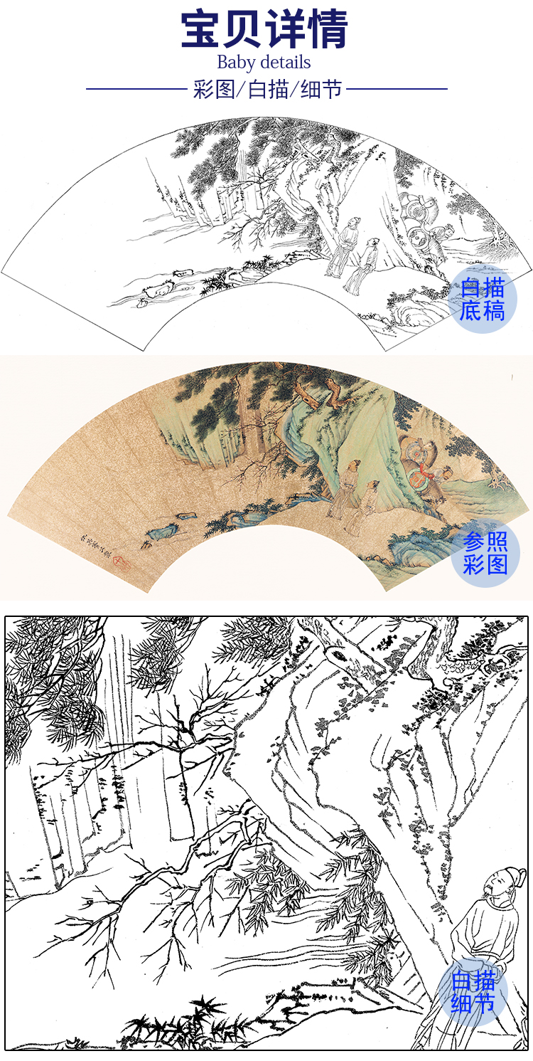 工笔画白描底稿 山水扇面小品 明 仇英-《花岩游骑图》-多种白描尺寸可选-SR05