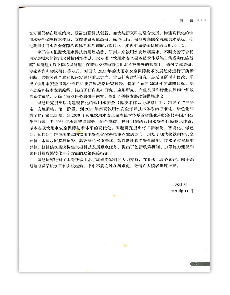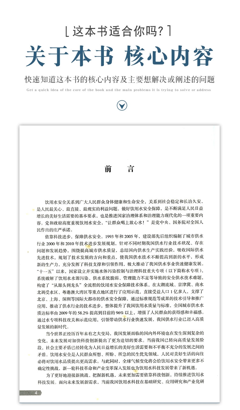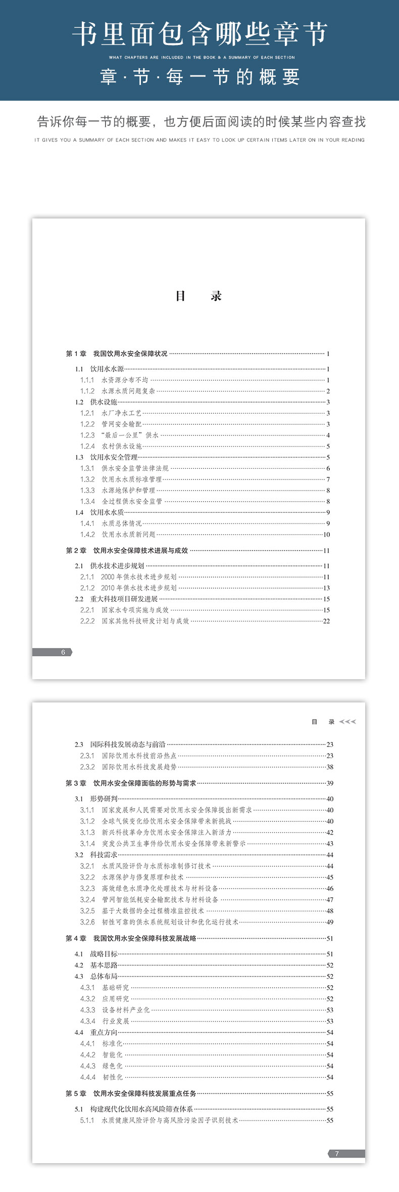 本书以水专项饮用水主题研究成果为基础,总结我国饮用水安全保障状况,分析存在主要问题,梳理国内外饮用水安全保障理论与技术进展,在对饮用水安全保障未来面临形势进行研判的基础上介绍了涵盖设施、技术、管理等方面的饮用水安全保障科技需求。本书明确了构建智能高效、绿色低碳、韧性可靠的饮用水安全保障技术体系等我国饮用水安全保障中长期发展目标,并介绍了“三步走”战略。介绍了构建现代化饮用水评价指标体系、建立智能化水源水质监测预警调控修复技术体系、研发高效绿色水质净化处理技术与材料设备以及研发智能低耗管网安全输配技术与材料设备等多项引领未来饮用水安全保障的重点任务。本书对指导我国饮用水安全保障科技发展具有重要指导意义。