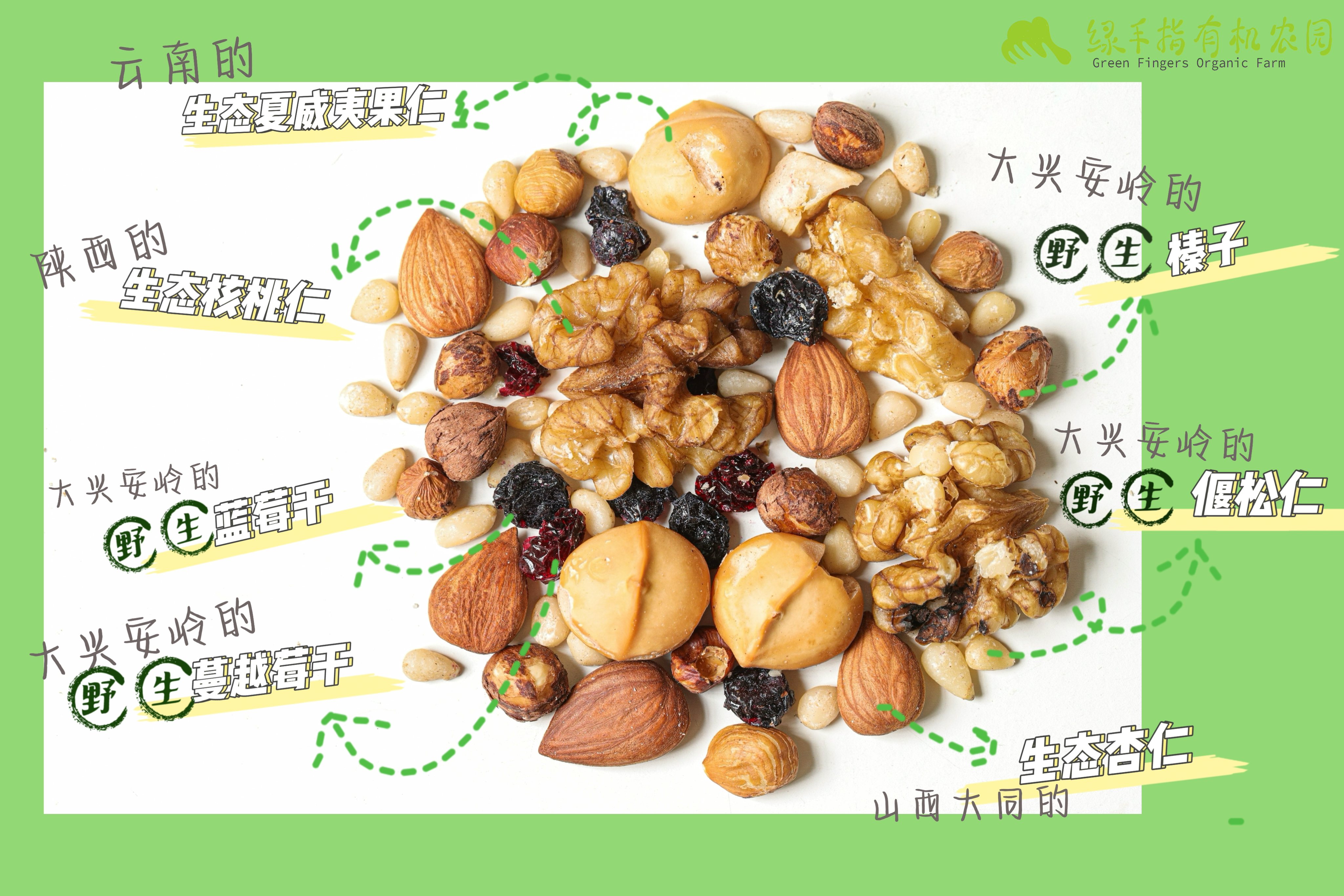 而榛子、松仁、蓝莓干和蔓越莓干则是野生的,由东北大兴安岭的农友金鹏带领当地居民一起采集