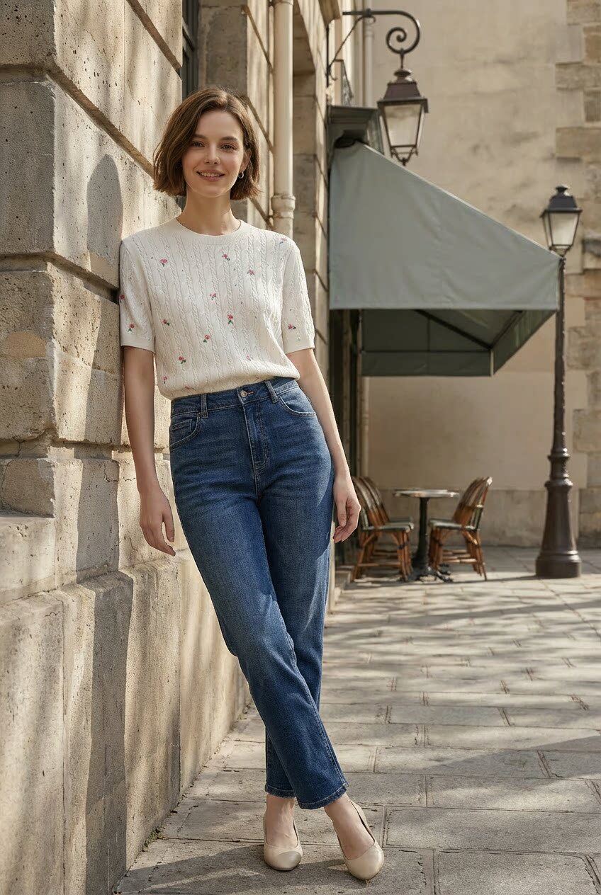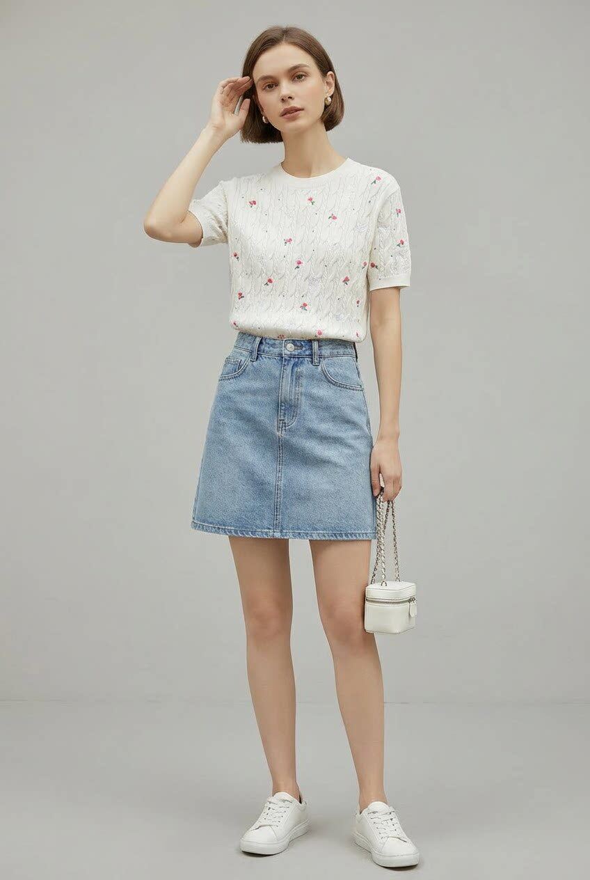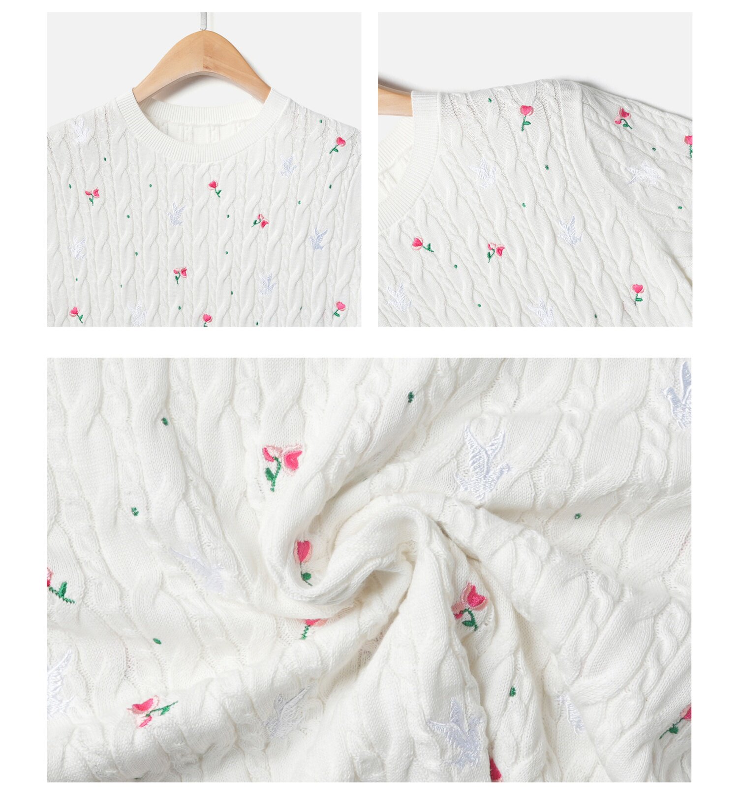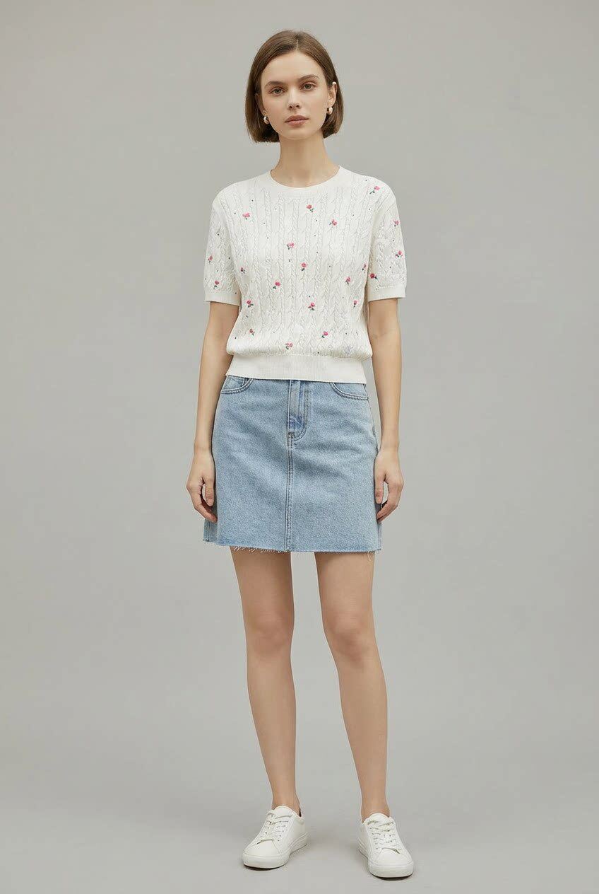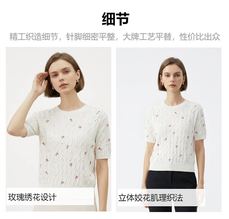 「自」全新升级【铂金会员174/天猫229/差价55】(11416)洛诗琳玫瑰绣花针织短袖2026新款圆领显瘦绞花针织上衣