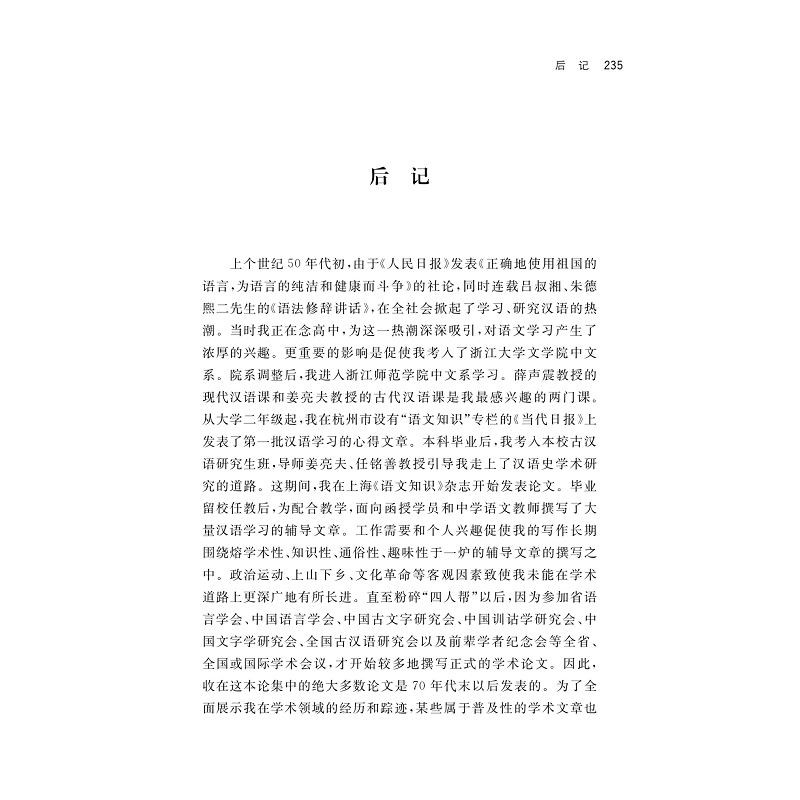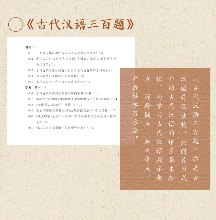 本书为《浙大学派语言学丛书》之一,包括《祝鸿熹汉语论集》、《古汉语常用字词新解百题》、《古代汉语三百题》三种。其中《祝鸿熹汉语论集》为语言文字学方面有重要影响的论文结集,主要收录祝鸿熹先生1970年代末以后发表的论文,酌收若干篇普及性学术文章;《古汉语常用字词新解百题》是古汉语普及读物,从古汉语常用语词的辨识、解析入手,联系文字、音韵、训诂、语法、修辞、古代文化常识等内容,熔学术性、通俗性、趣味性于一炉;《古代汉语三百题》亦是古汉语普及读物,以问答形式介绍古代汉语的诸多基本知识,为学习古代汉语提示要点、解释疑点、辨析难点,并提供学习方法。
