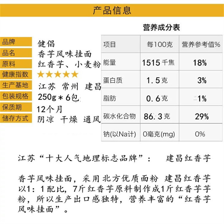 【常州馆】建昌红香芋风味挂面细面条营养早餐圆面条汤面凉面耐煮1.5kg礼盒