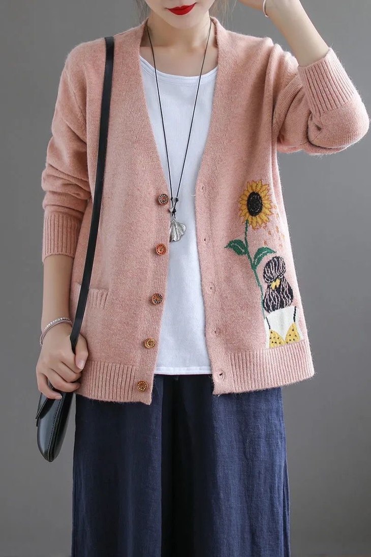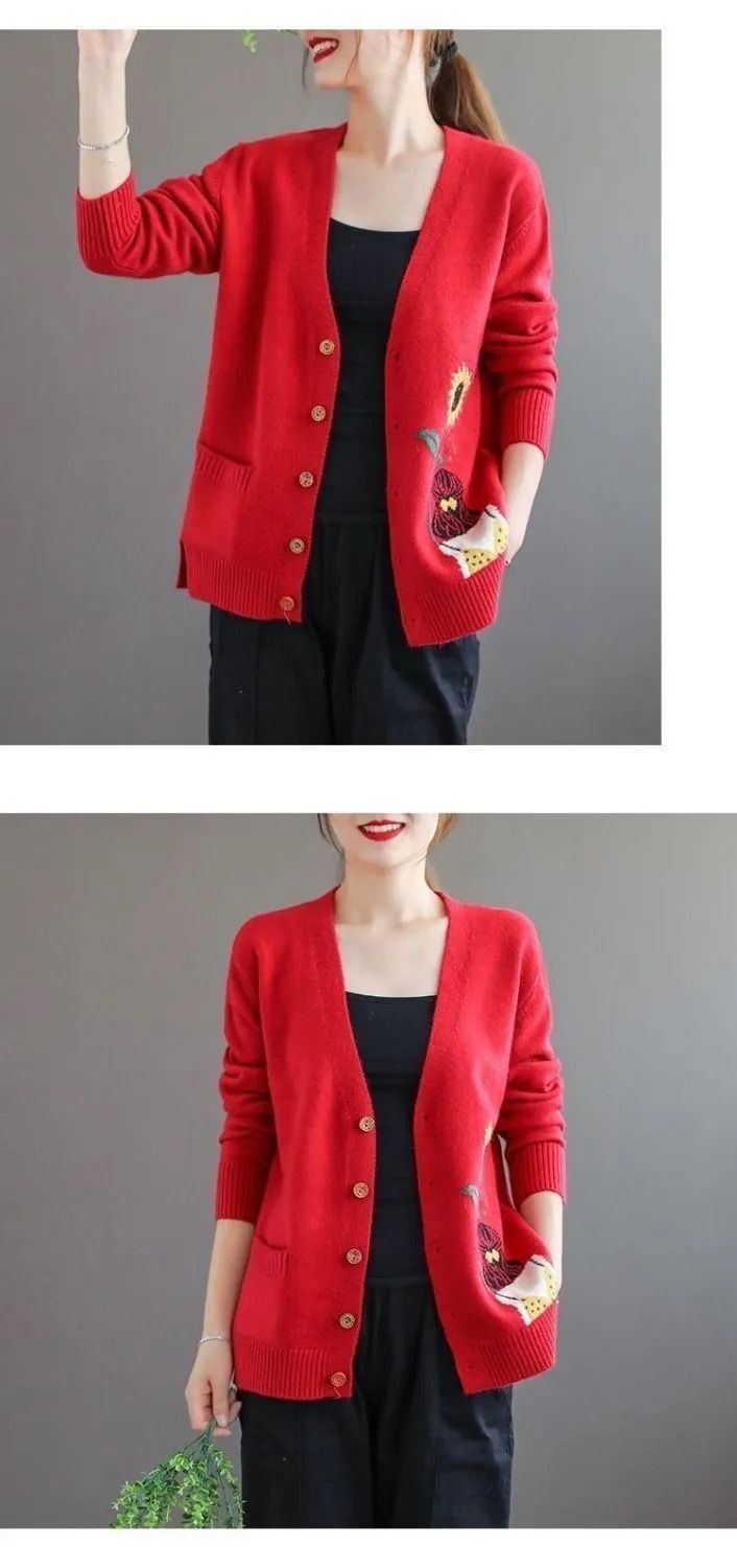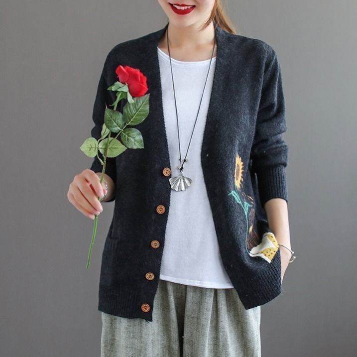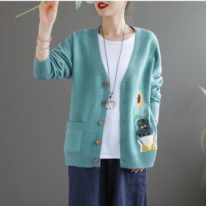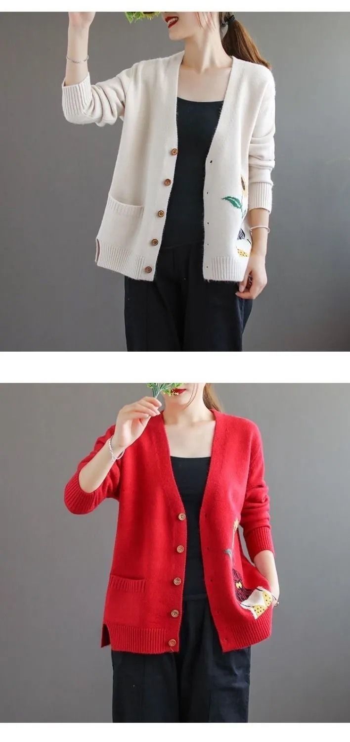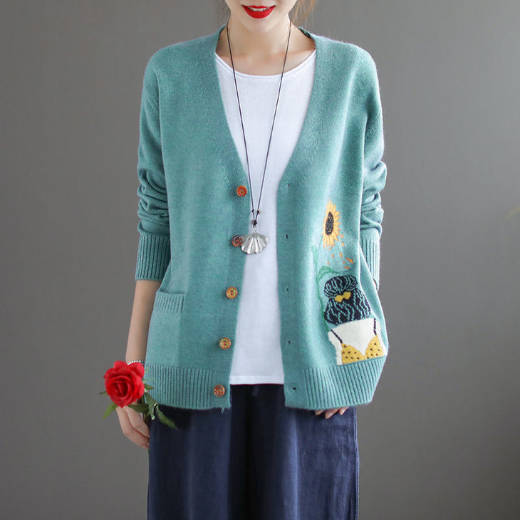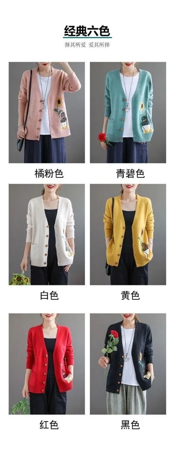 TZW-新款民族风复古提花v领宽松春秋针织开衫外套女