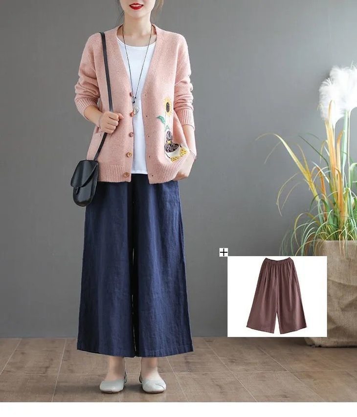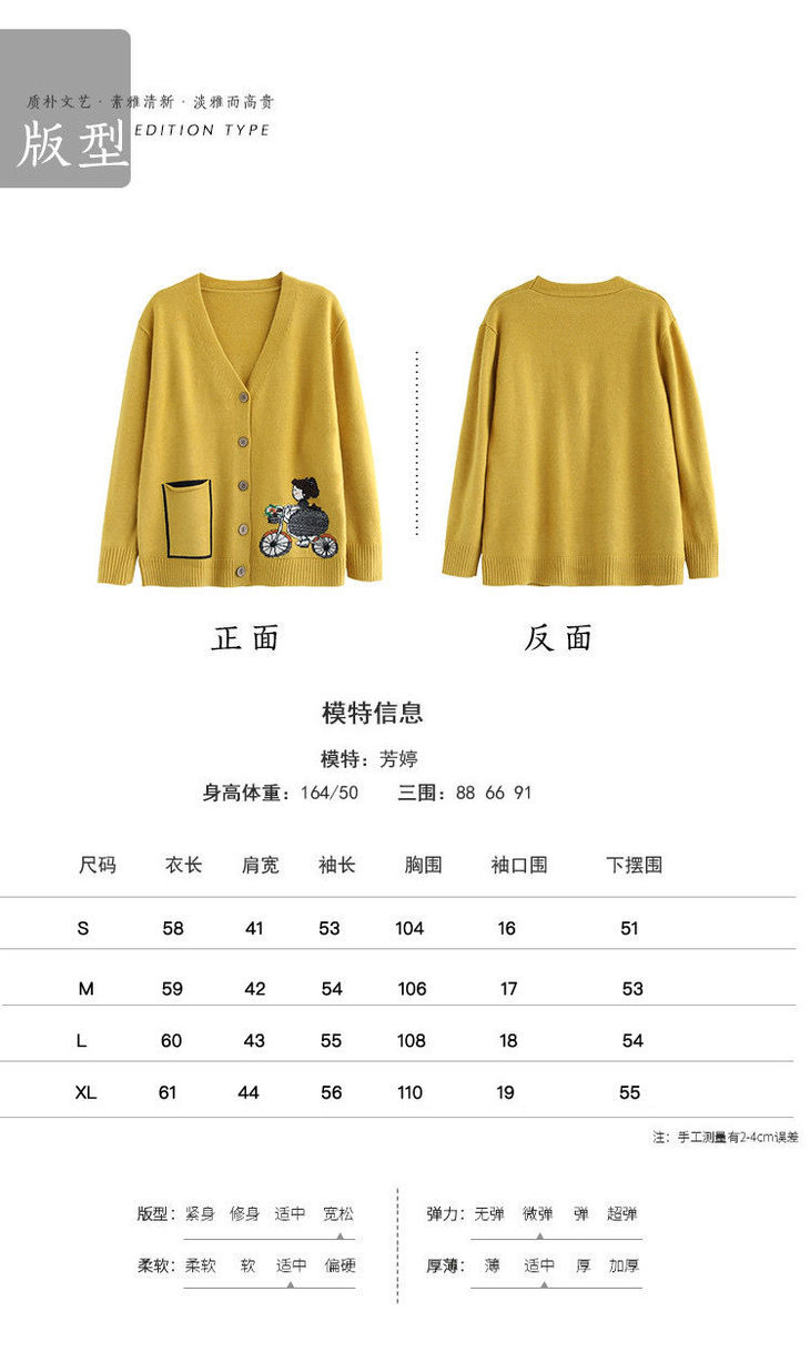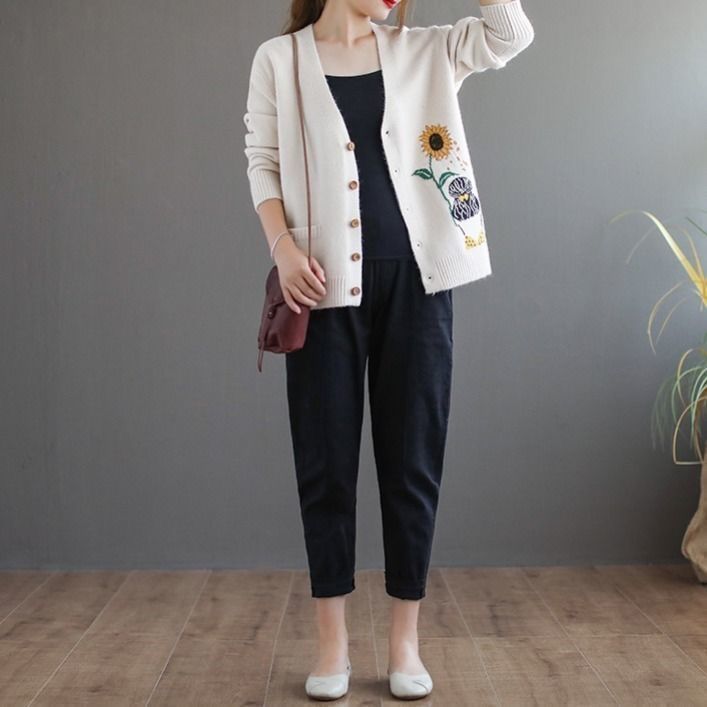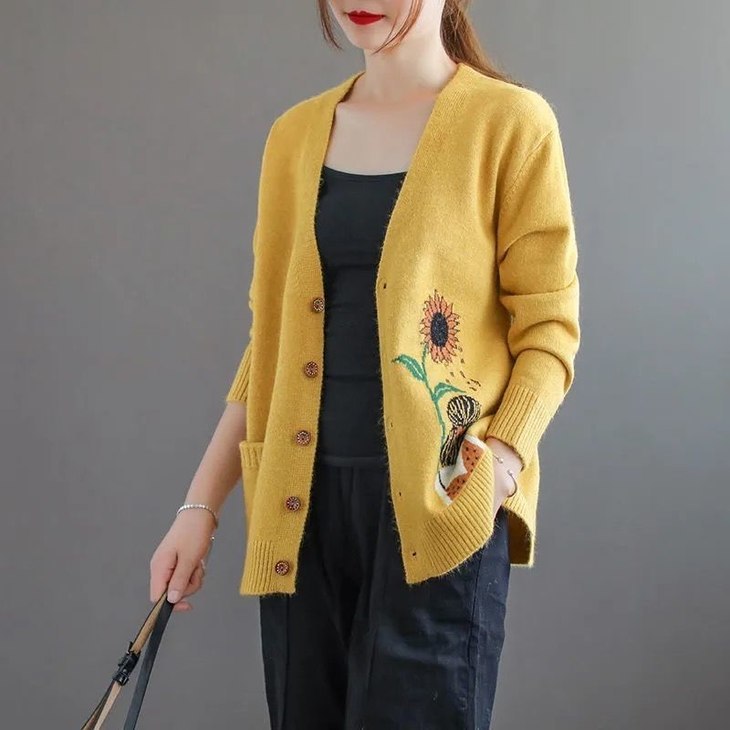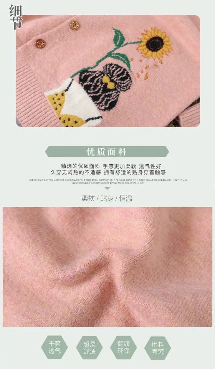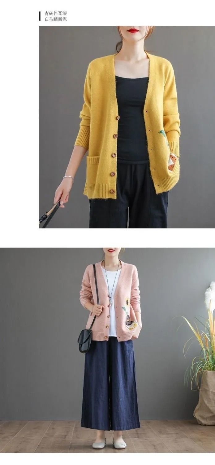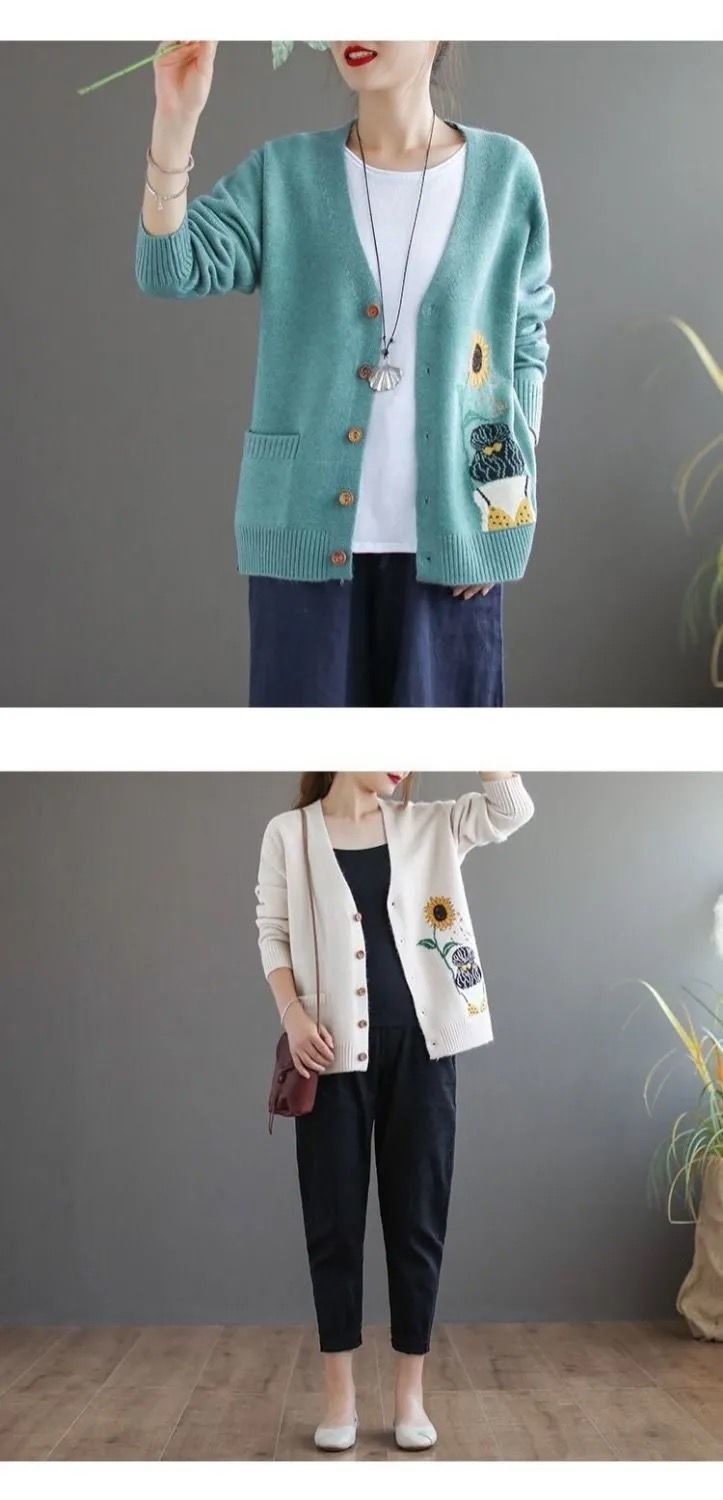 TZW-新款民族风复古提花v领宽松春秋针织开衫外套女