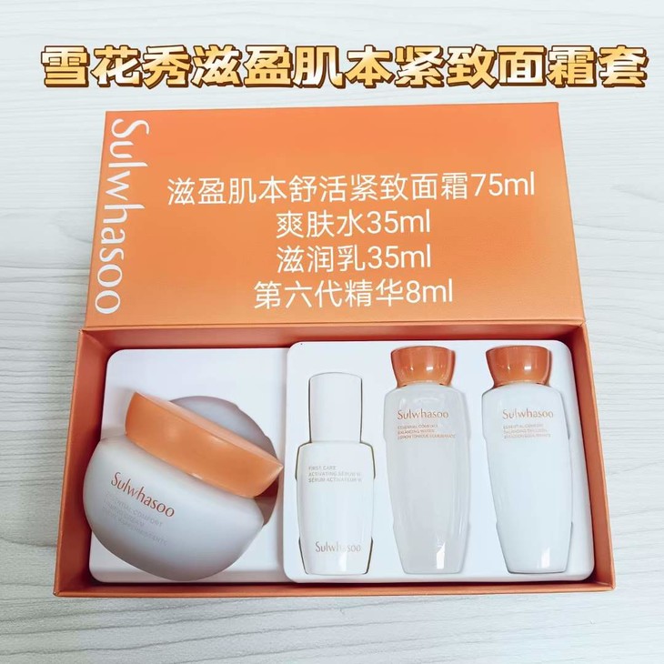 👑雪花秀滋盈肌本护肤4件套 👍新版雪花秀套装,解决你的肌肤问题 💋新升级配方,含有两倍的天然植萃成分,强化肌肤弹性与紧致度,预防初老 ✨水乳:含有多种珍贵成分,有效补水的同时,让肌肤更加紧致,更有弹性 🍀面霜:低致敏的保湿紧致,能增强肌肤弹性、变得光滑和紧致 🎏精华:全新添加【黑参精粹】,能修护+提亮,打开肌肤通道滋润皮肤 💎适用于:所有肤质 【套盒包括】:面霜75ml+水35ml+乳35ml+精华8ml