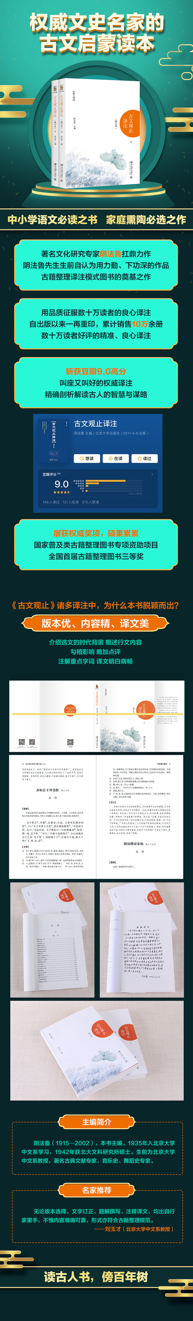 《古文观止》在清代是一种畅销的普及读物,因为广泛流传,版本较多,导致今天市场上的版本也是良莠不齐。本书在版本和内容上都是精中做精。本书采用的中华的排印本,同时参照清乾隆年间映雪堂刻本加以比勘。题解交代选文背景、中心内容,并对选文作简单评价;注释言简意赅;译文文笔优美,便于今天的读者学习、欣赏。