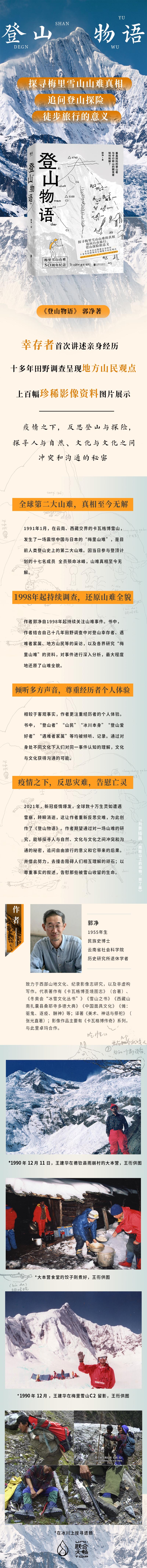 幸存者首次讲述亲身经历,十多年田野调查呈现地方山民观点,上百幅珍稀影像资料图片首次披露。疫情之下,反思登山与探险,探寻人与自然、文化与文化之间冲突和沟通的秘密 。