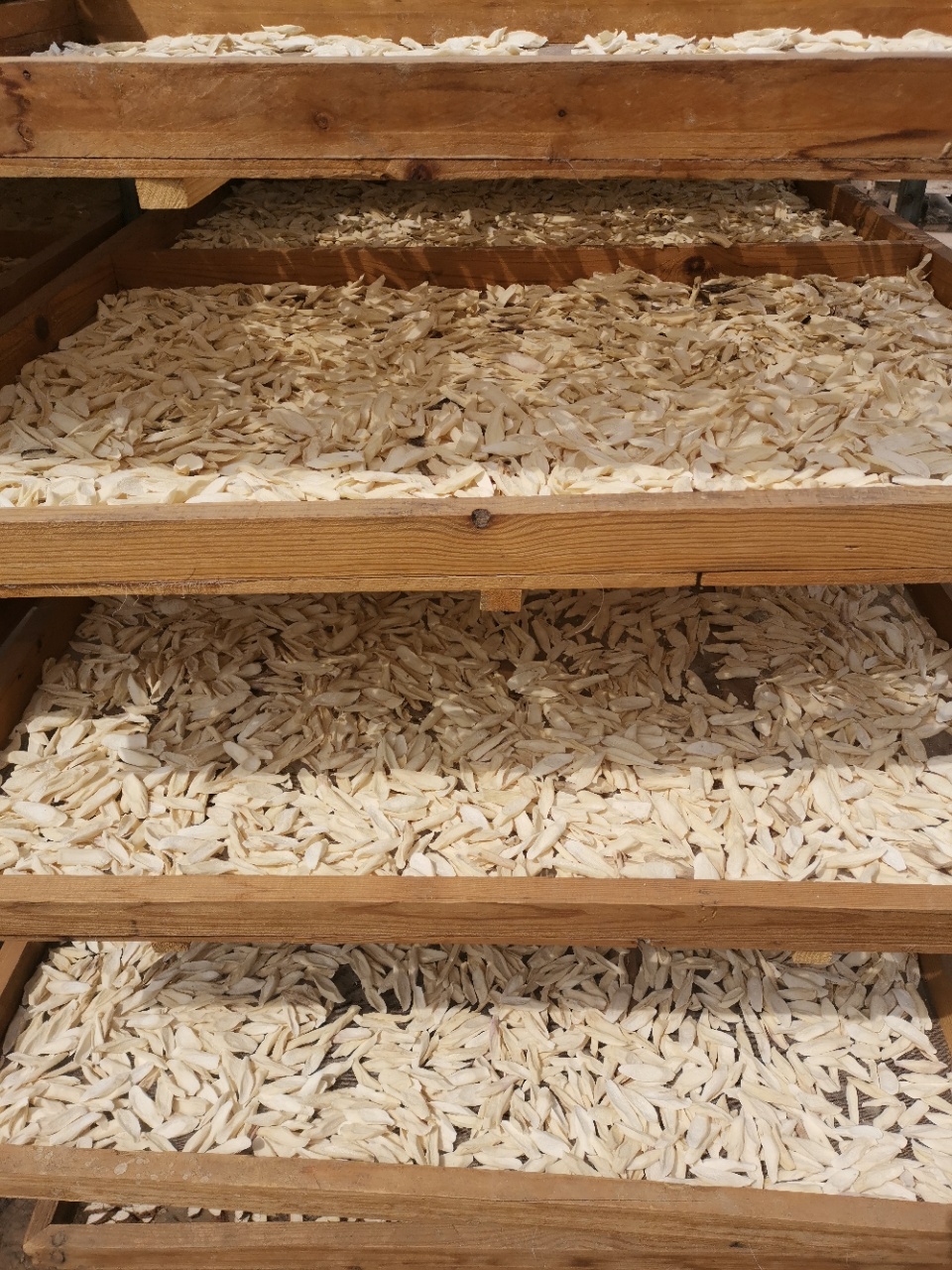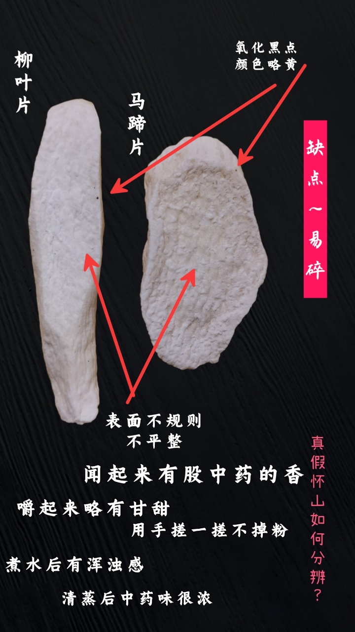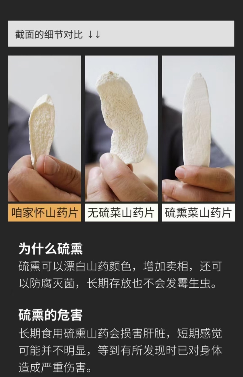 因为我们的山药片是手工切片,无硫风干,这个过程中会有氧化的现象,当山药去皮后与空气接触,会有氧化现象,氧化之后会有颜色发黄或者是有黑点,这个就是手工物流风干片中的缺点