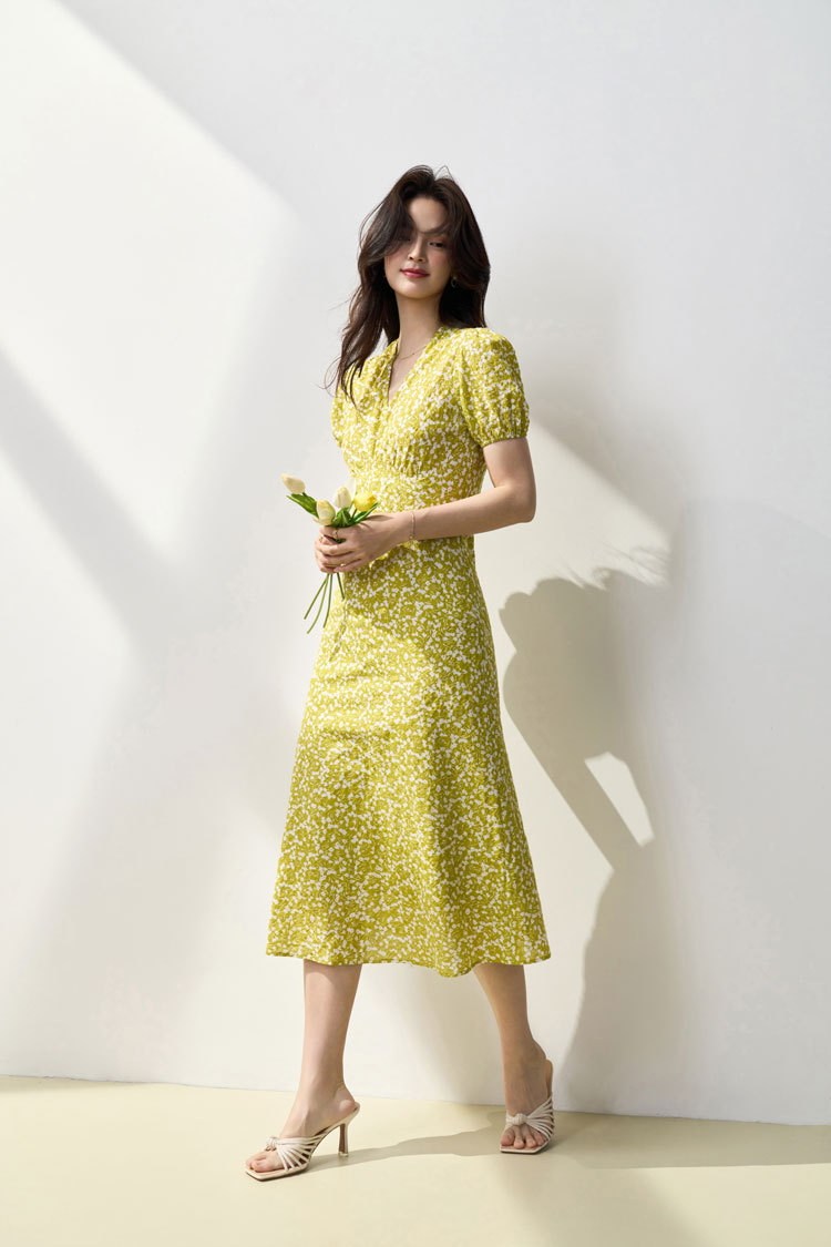 丁摩 连衣裙夏季女严选棉盐缩褶皱肌理小碎花高腰V领显瘦中长裙5ZF-13930