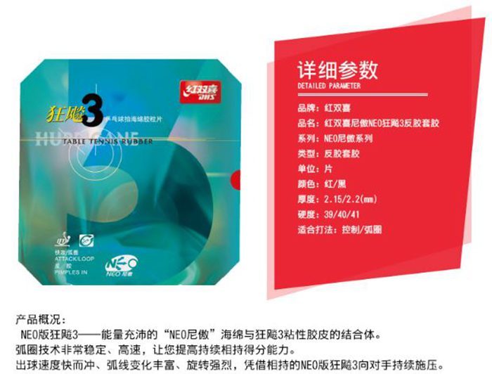 红双喜 无机尼奥狂飚三 NEO狂飙3 粘性乒乓球反胶套胶皮 橙海棉