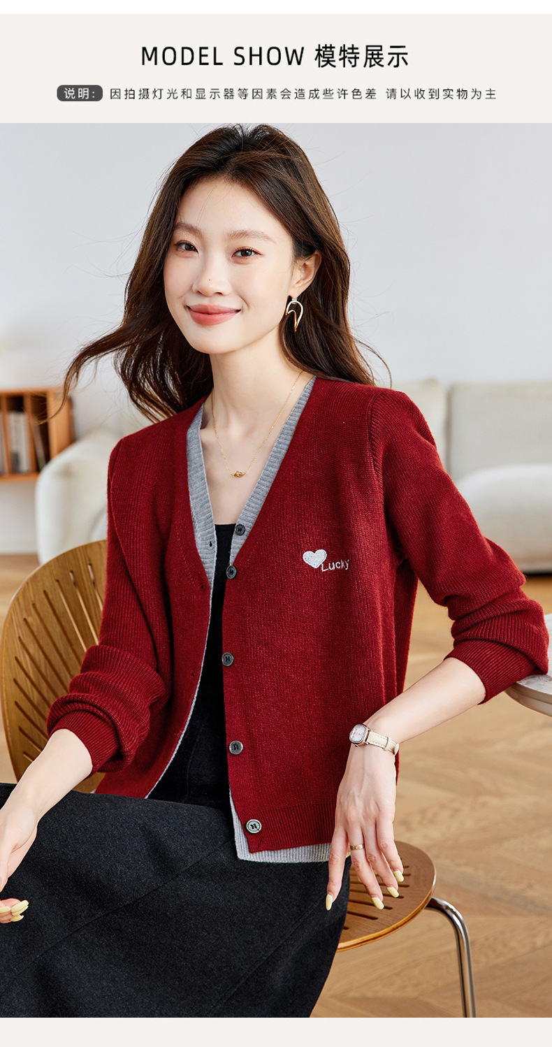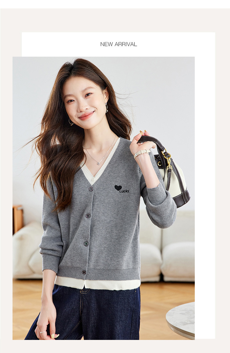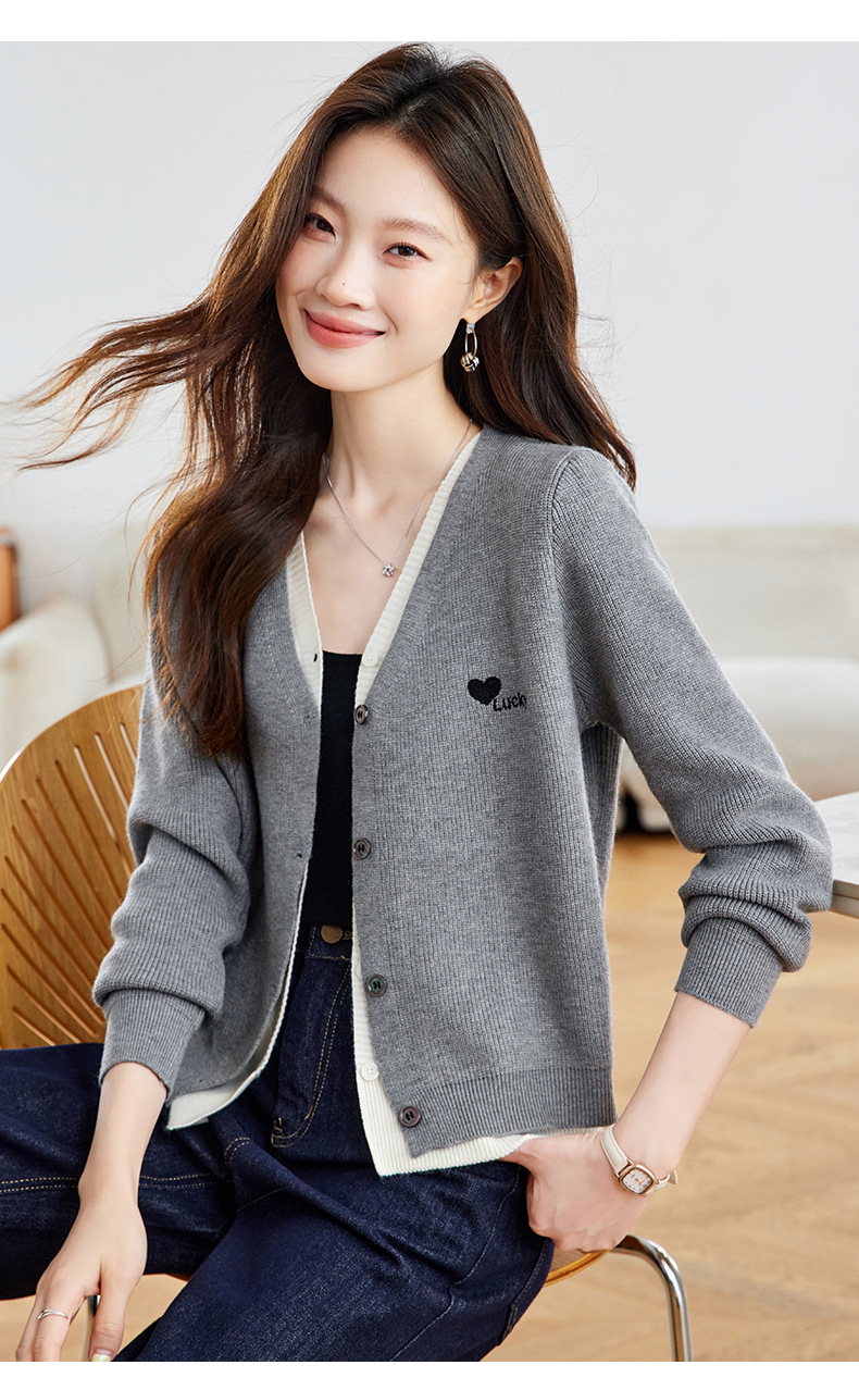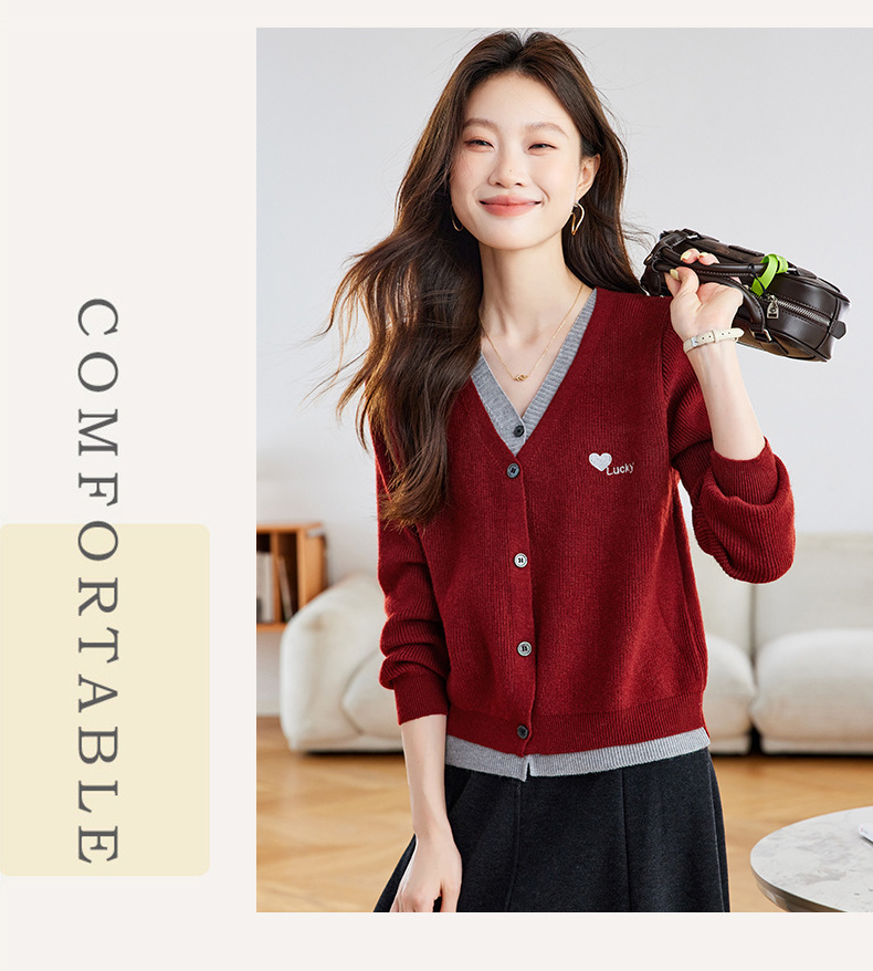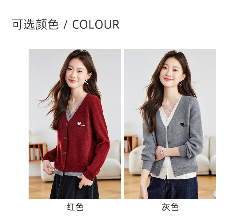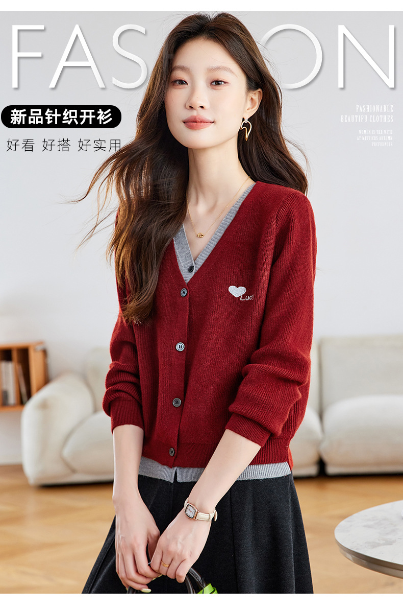CC设计感拼色假两件毛衣开衫女2025春秋羊毛针织外套洋气外搭上衣