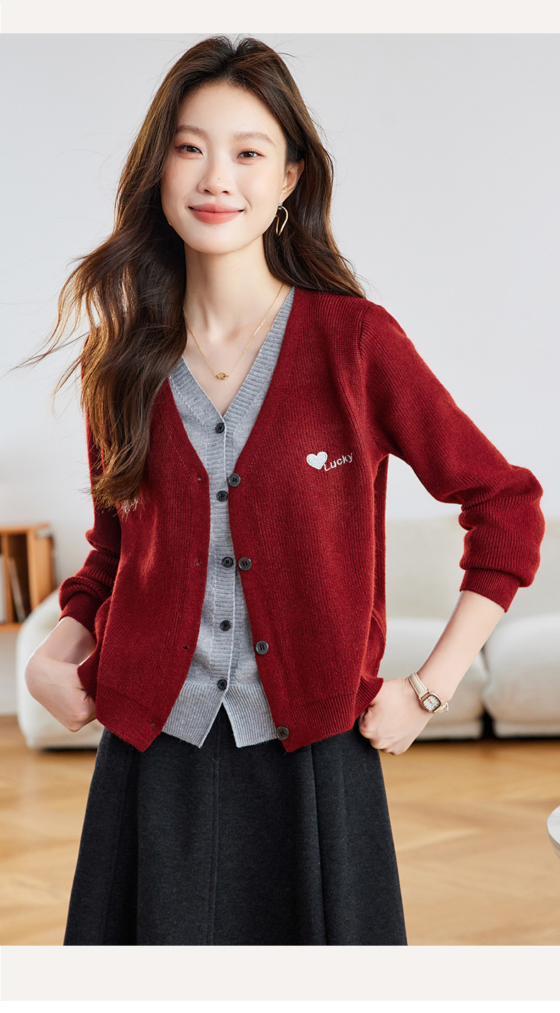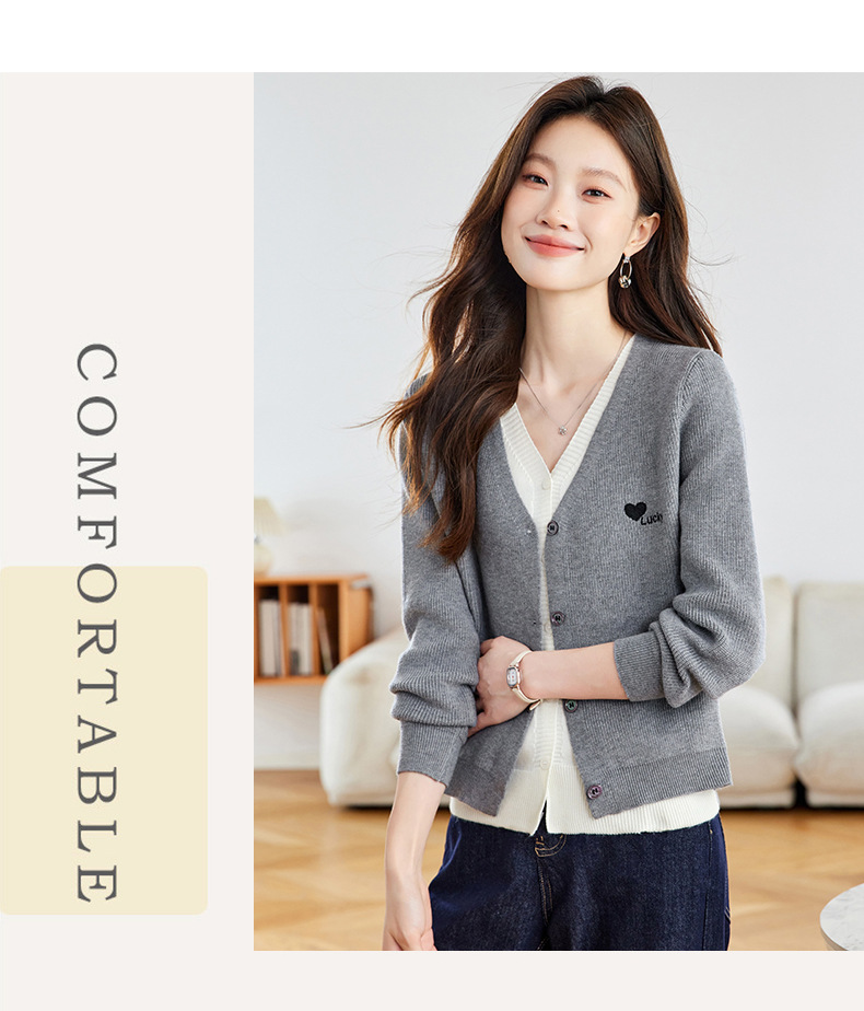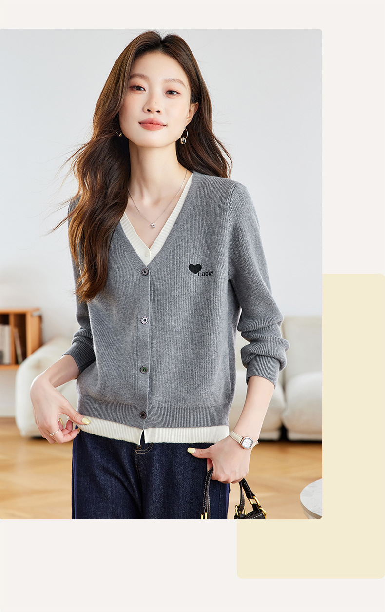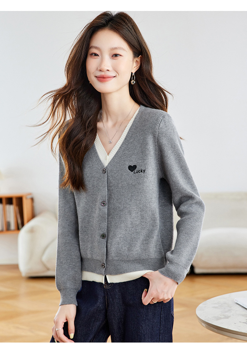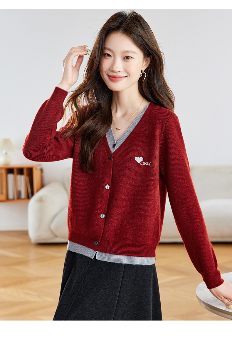 CC设计感拼色假两件毛衣开衫女2025春秋羊毛针织外套洋气外搭上衣