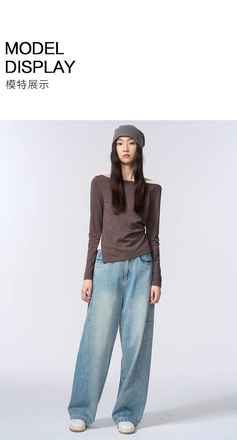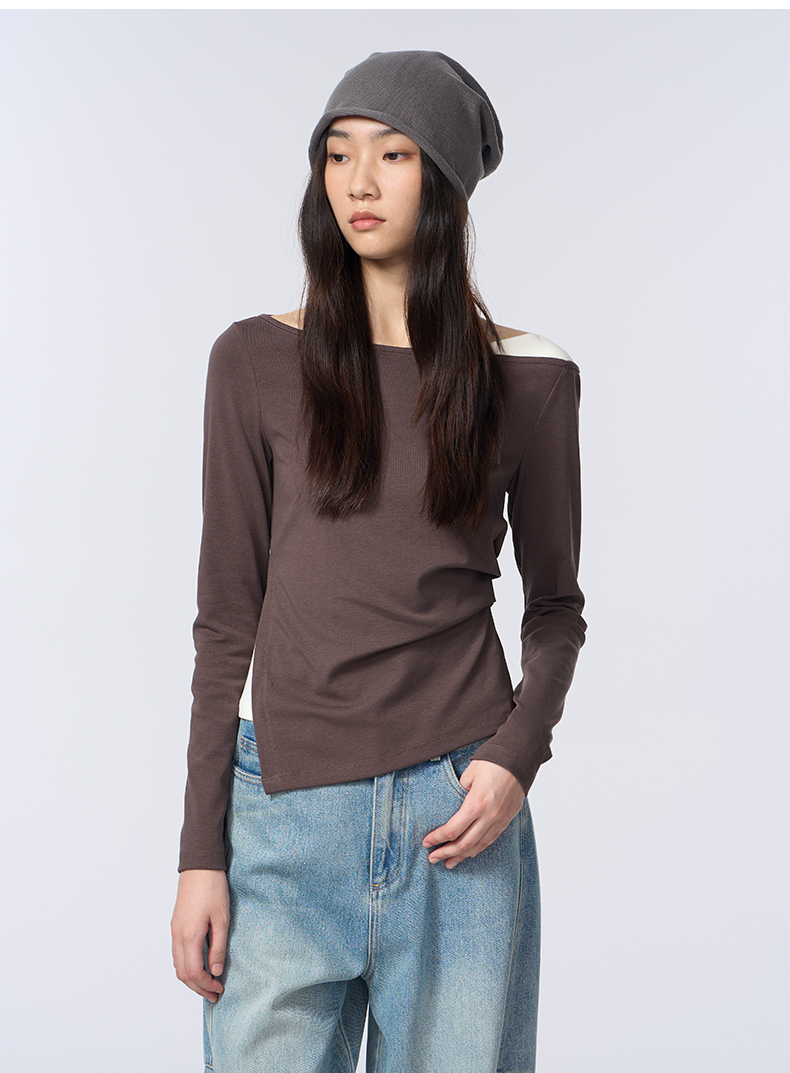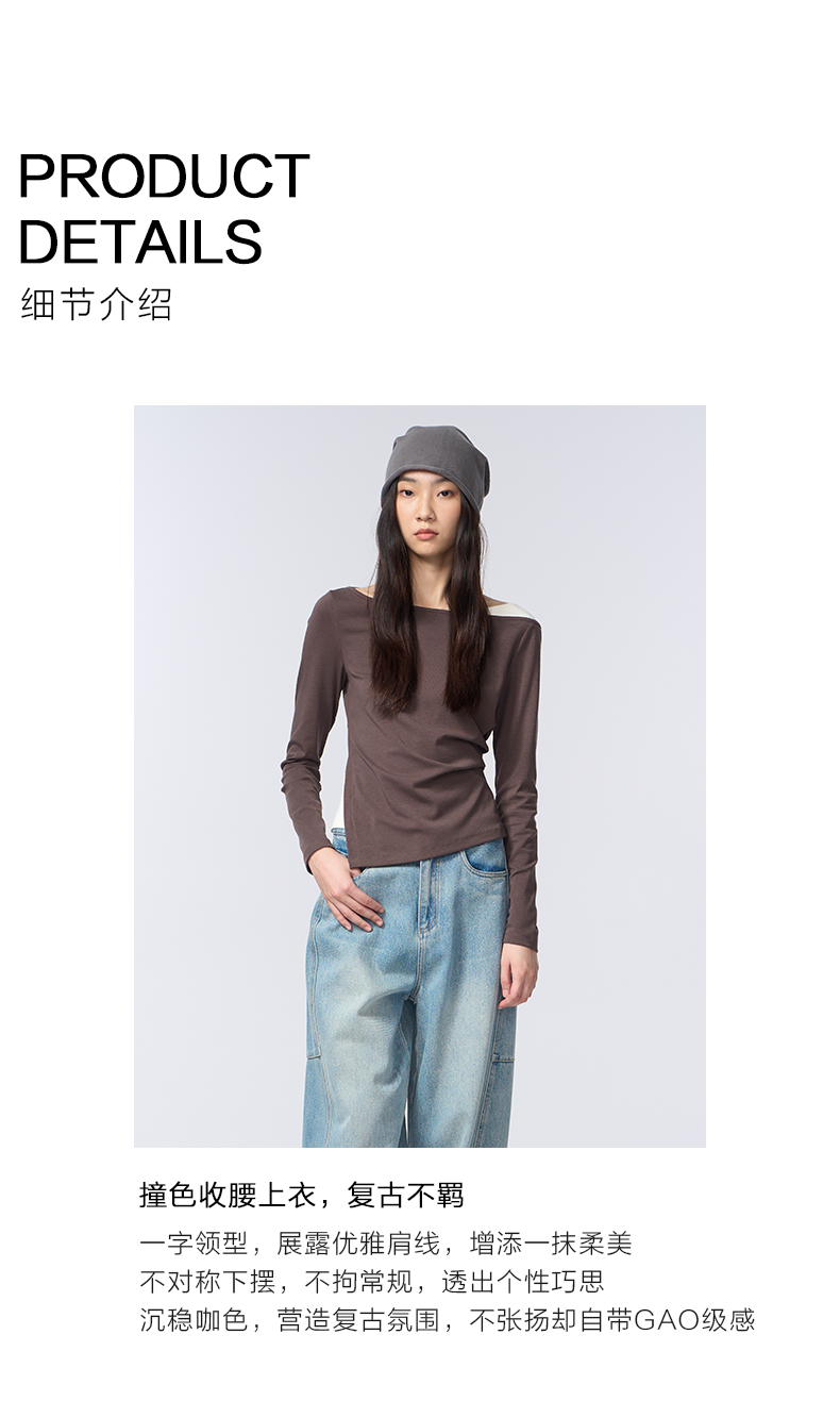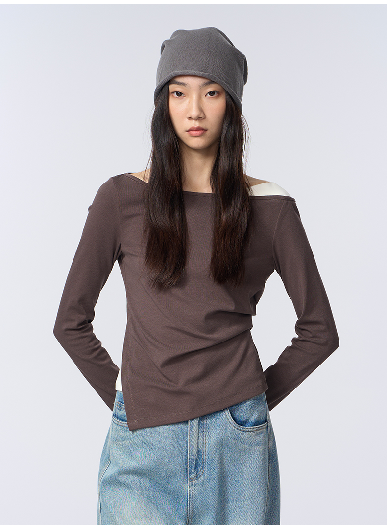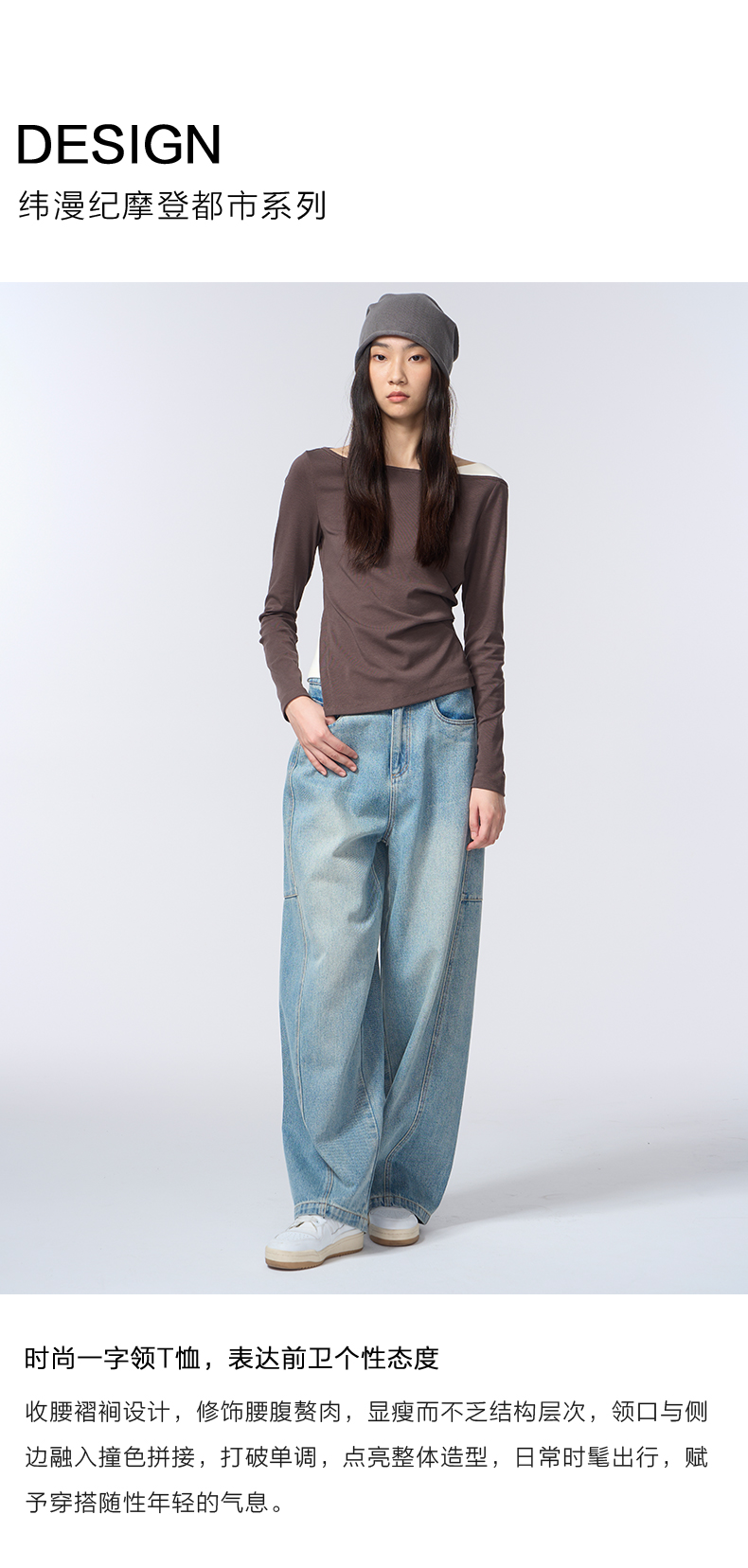 VIMAGE纬漫纪一字领休闲通勤简约T恤不对称长袖上衣2025秋季新款T恤V2402103