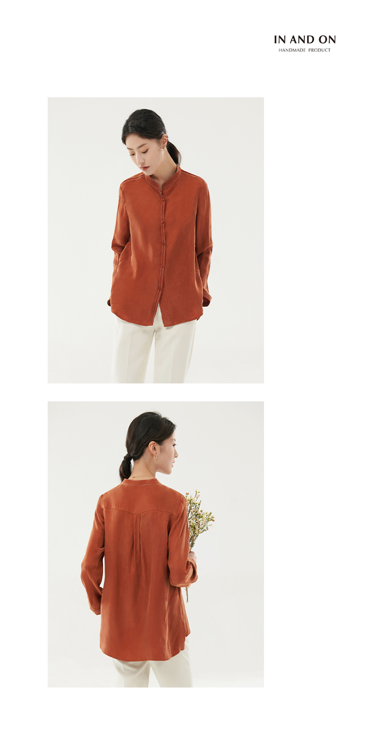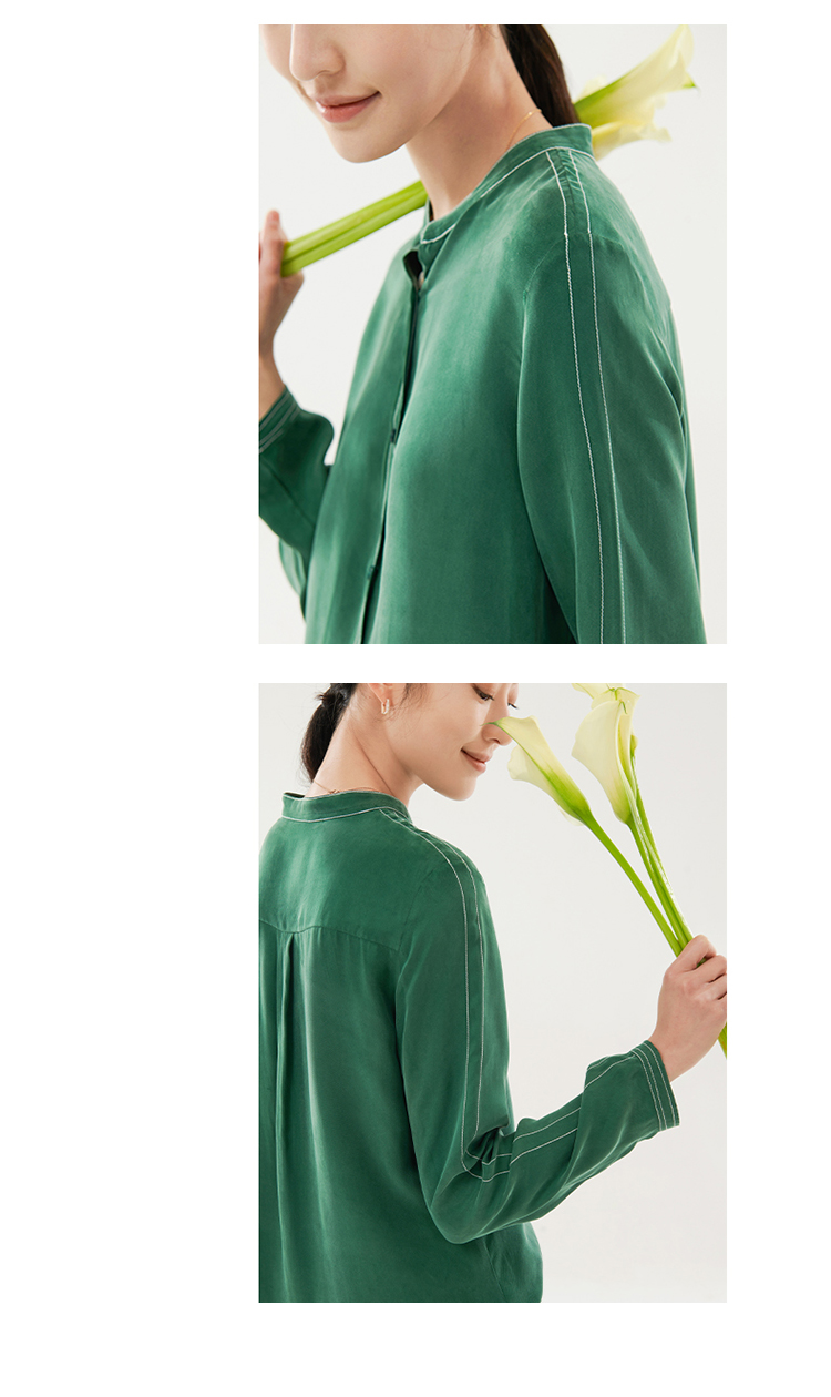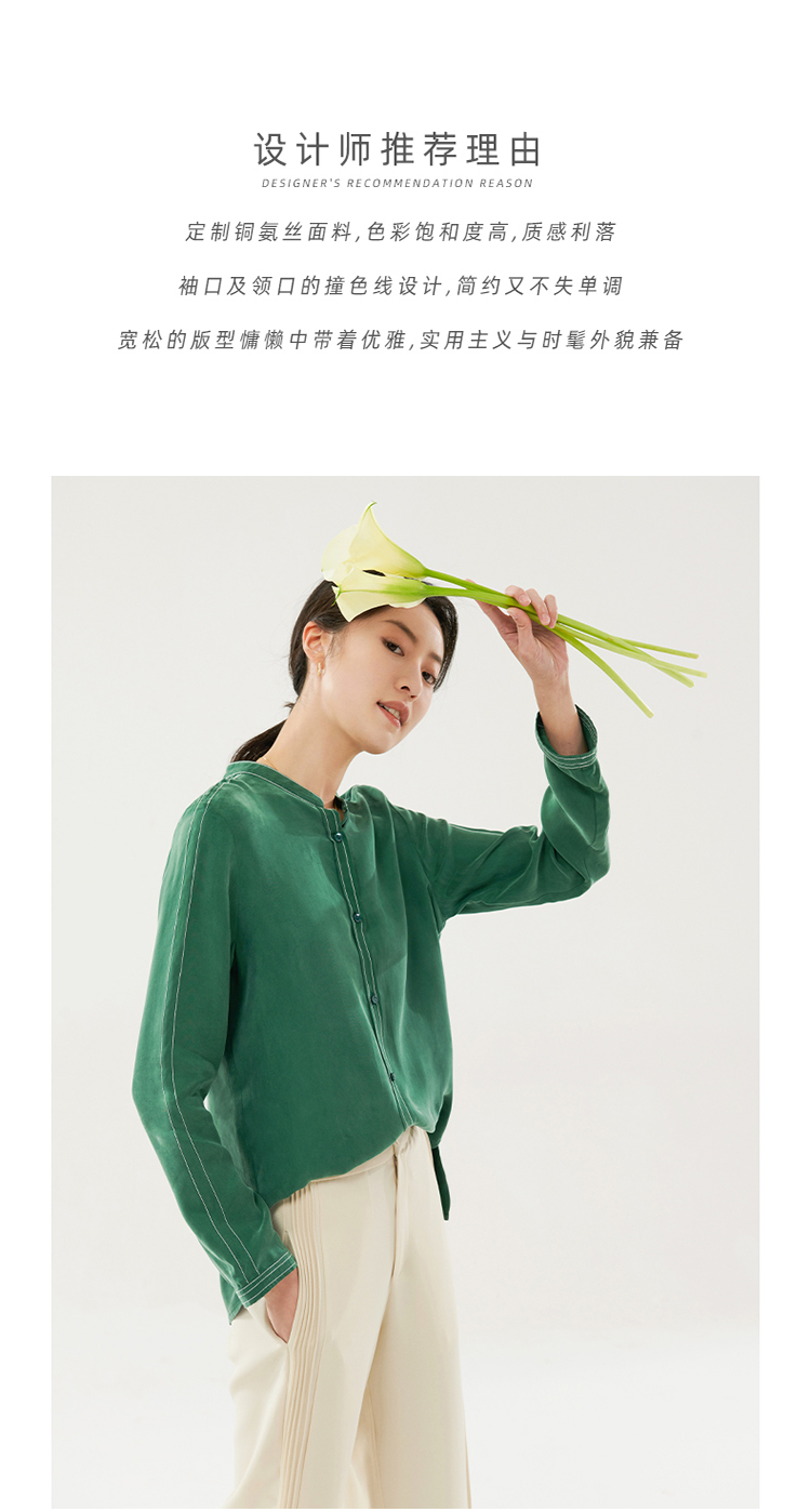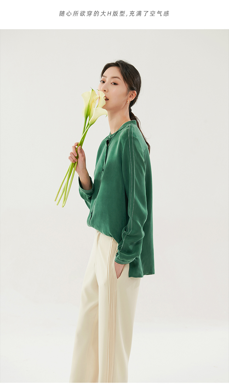 IN AND ON女装设计感撞色衬衫女绿色立领宽松时尚短款通勤上衣21779