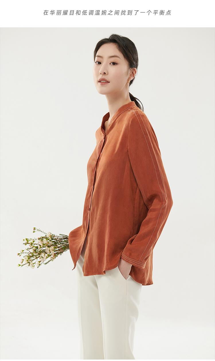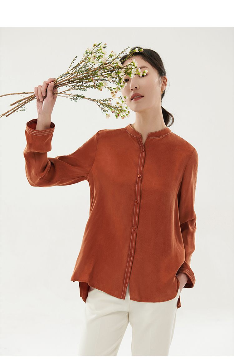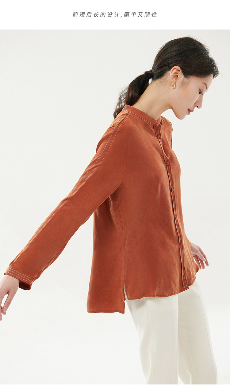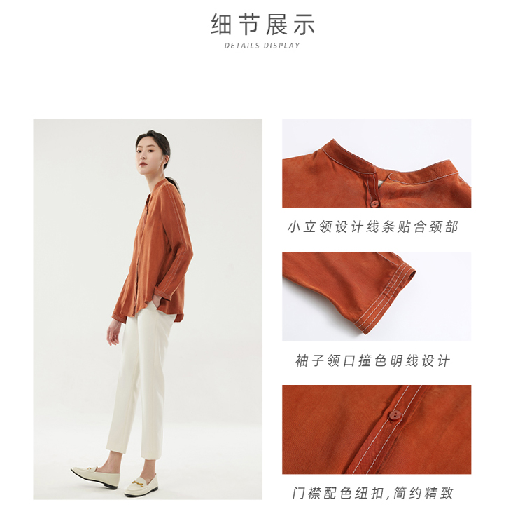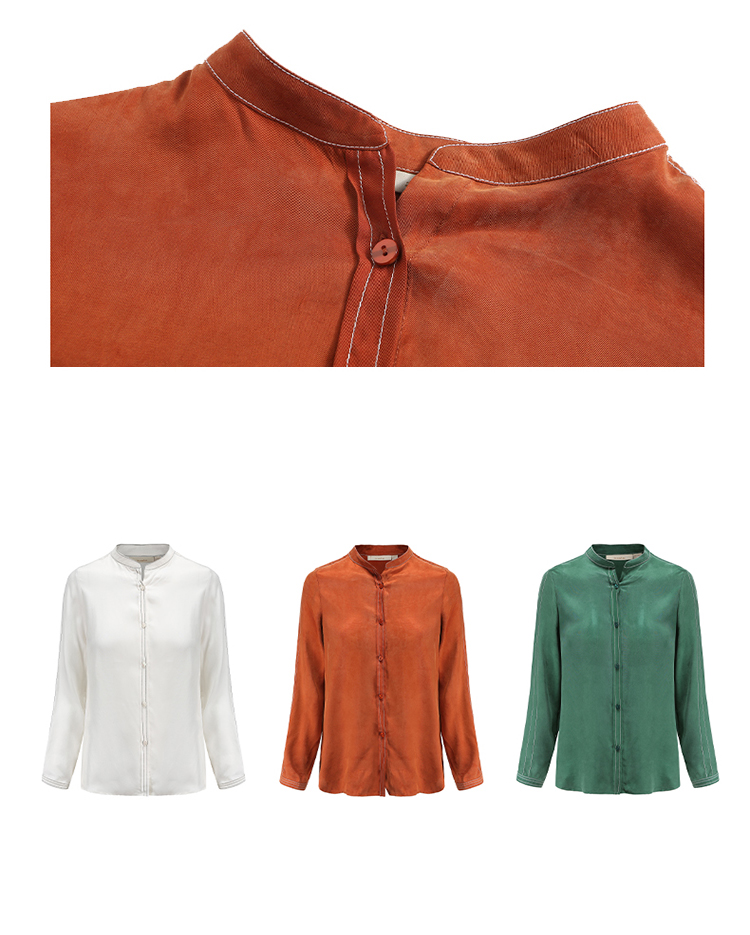 IN AND ON女装设计感撞色衬衫女绿色立领宽松时尚短款通勤上衣21779