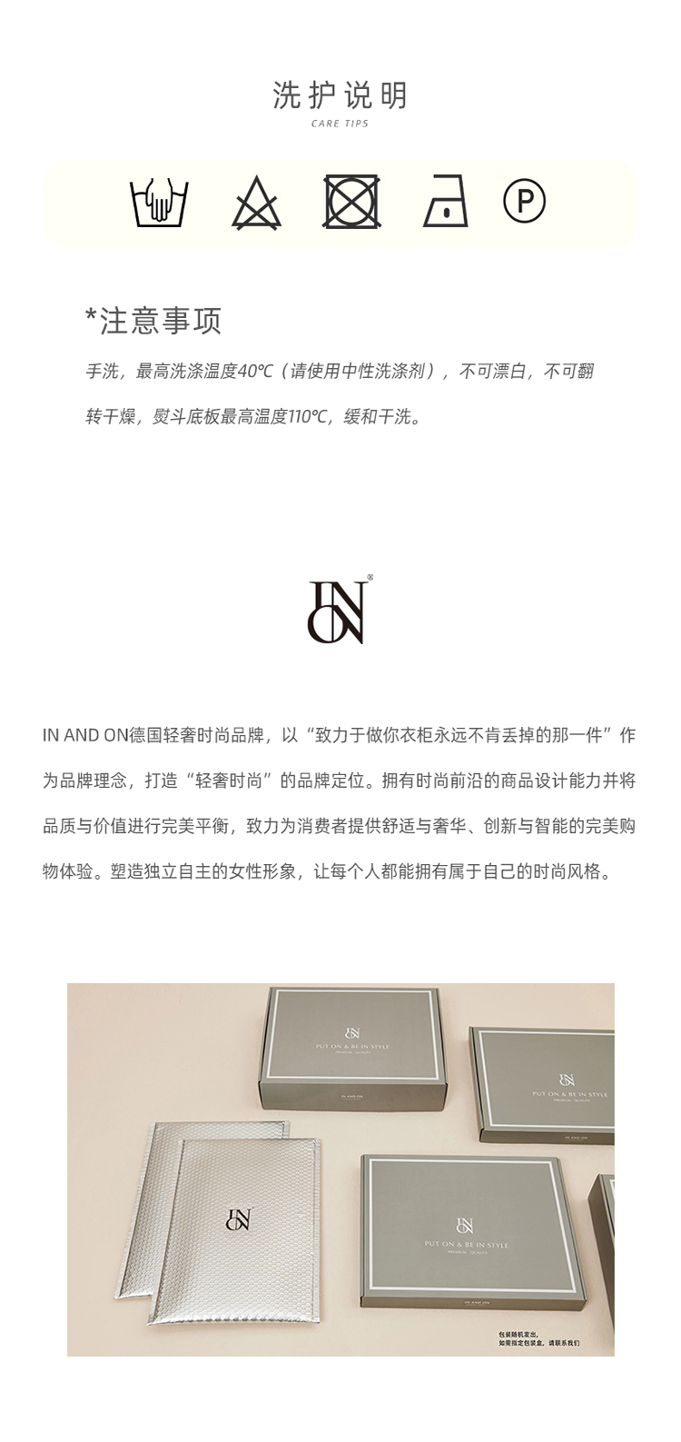 IN AND ON—轻奢时尚品牌,以“致力于做你衣柜永远不肯丢掉的那一件”作为品牌理念,打造“轻奢时尚”的品牌定位。拥有时尚前沿的商品设计能力并将品质与价值进行完美平衡,致力为消费者提供舒适与奢华、创新与智能的完美购物体验。塑造独立自主的女性形象,让每个人都能拥有属于自己的时尚风格。