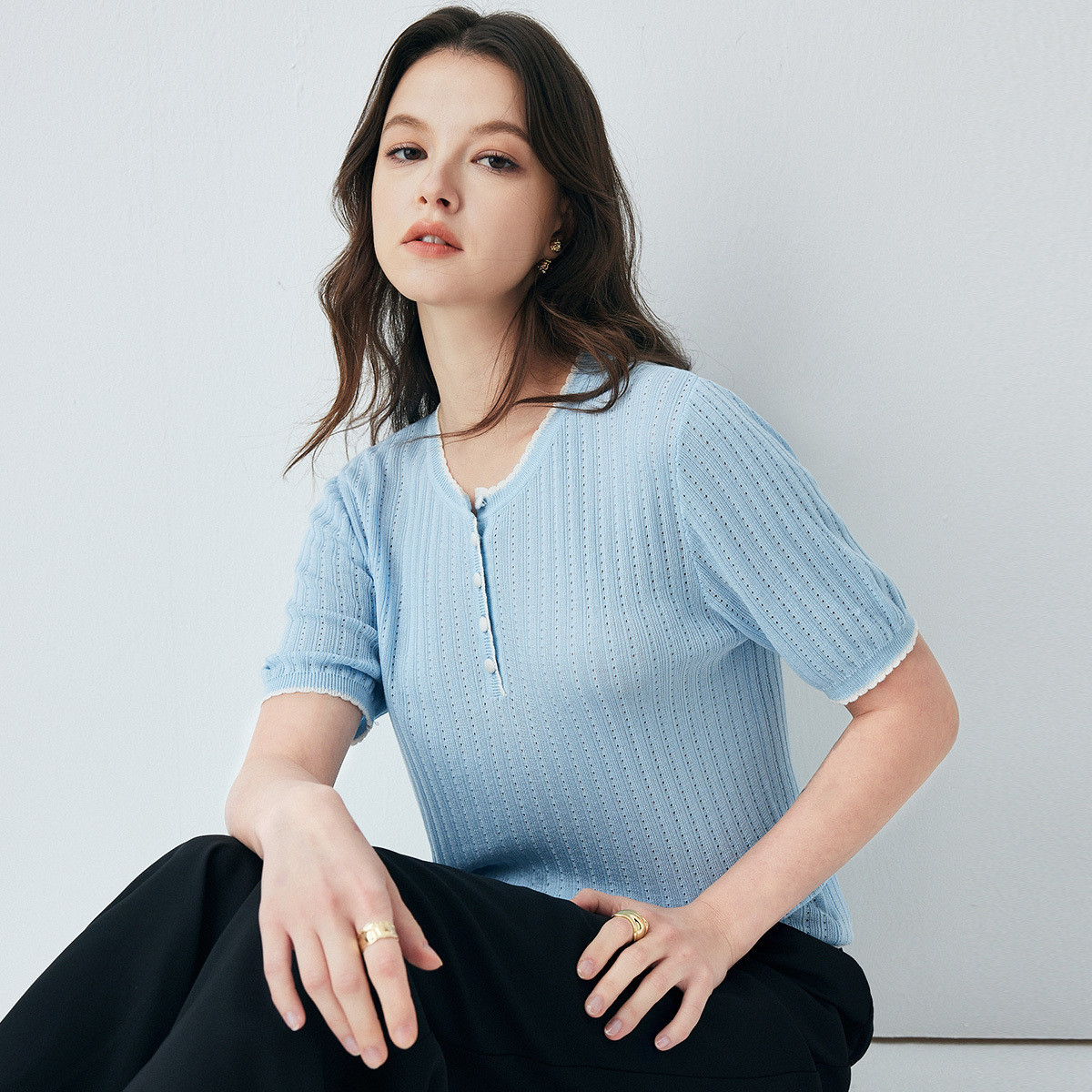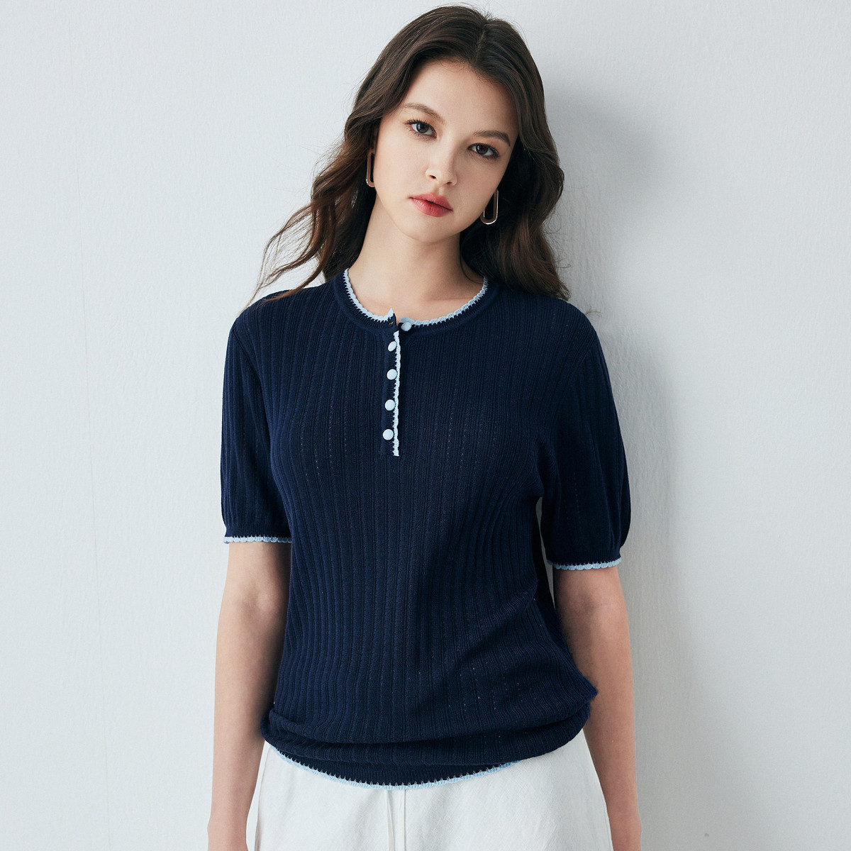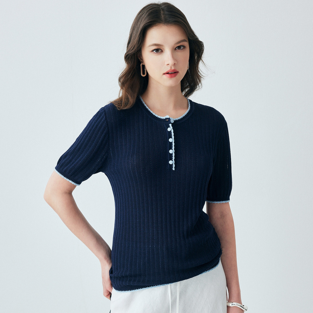 PALUOPO/PL含桑蚕丝圆领时尚撞色短袖减龄舒适百搭针织T恤ES251151Z