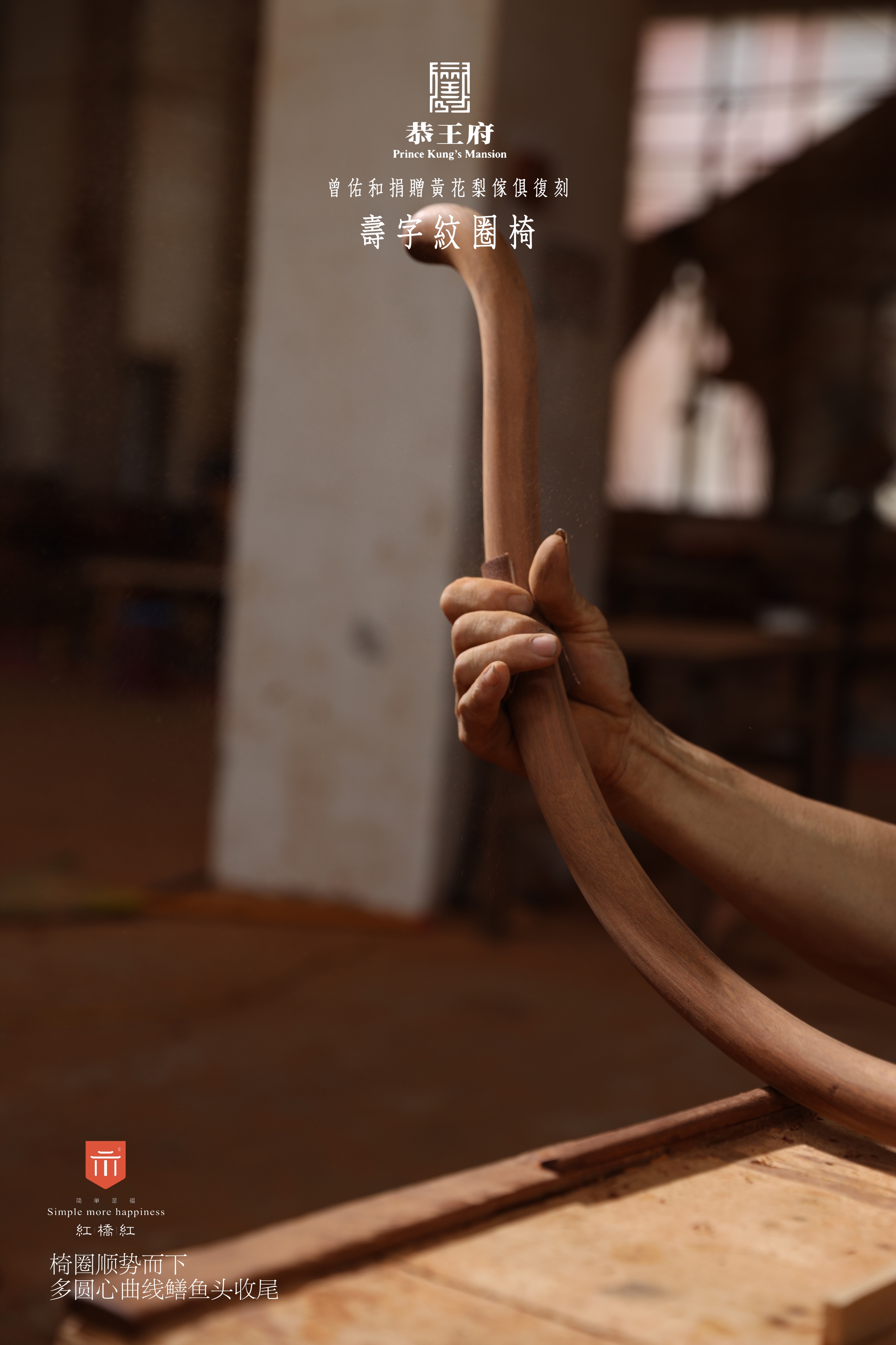 这件享誉业界的恭王府寿字纹圈椅,椅圈由搭脑顺势而下,与扶手融合成多圆心曲线,并且与鳝鱼头欲收缓延,其靠背与脊柱结合为100°的倾角,可使韧带和肌肉得到充分的休息与放松。