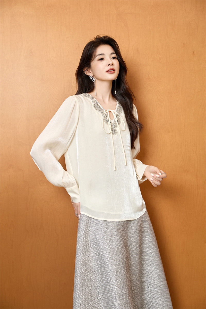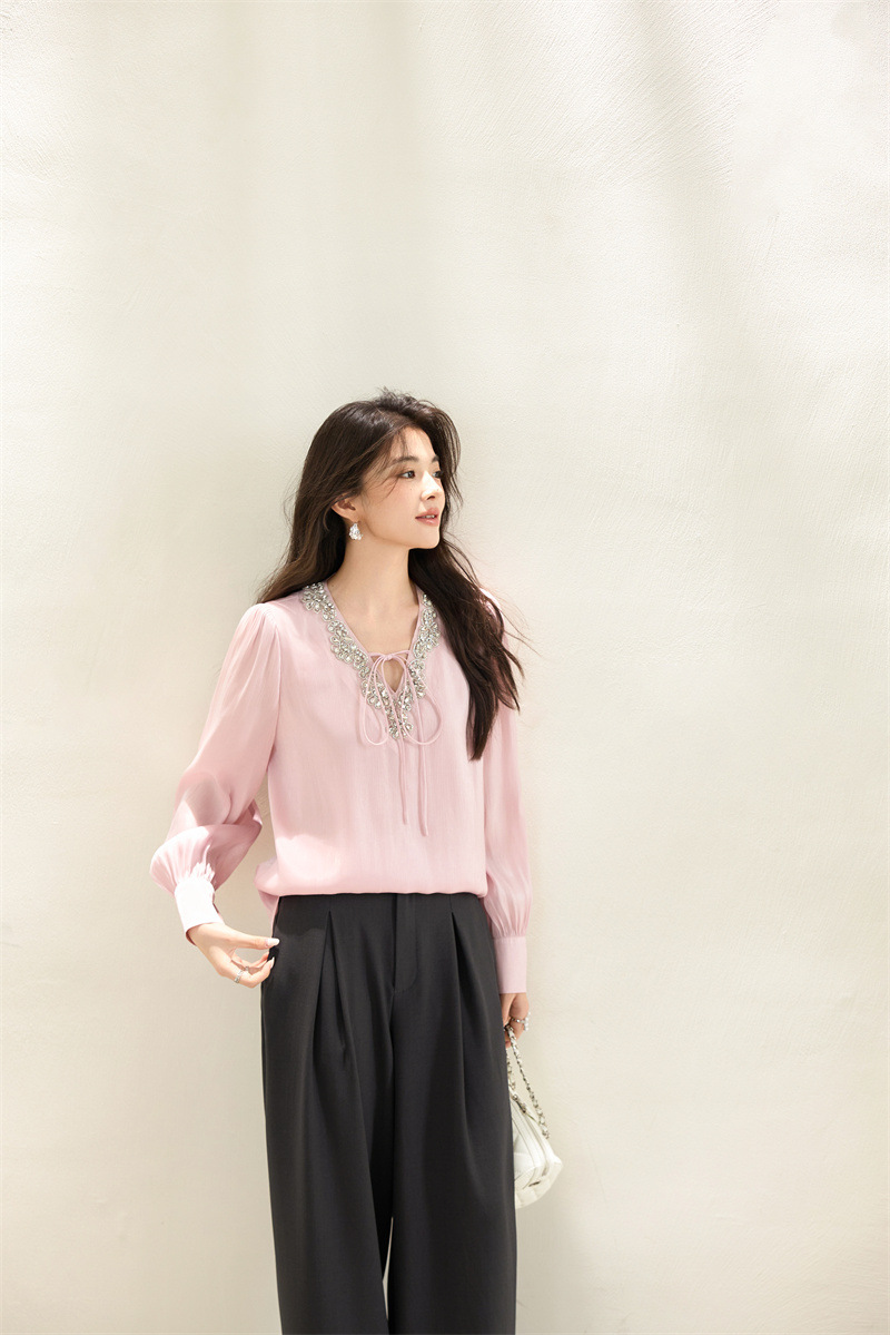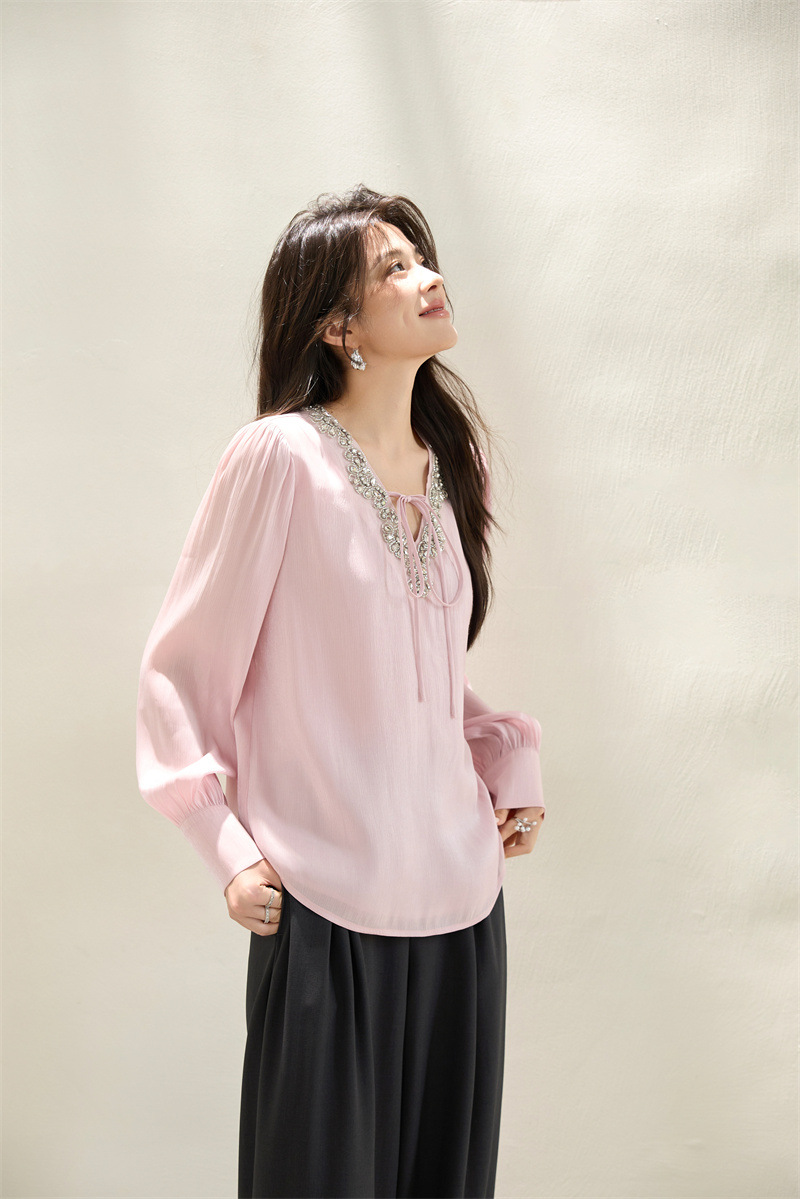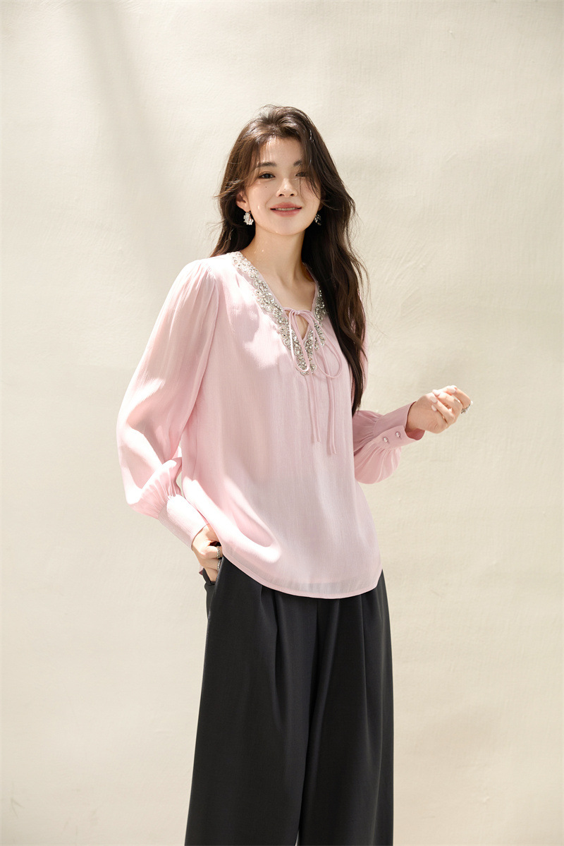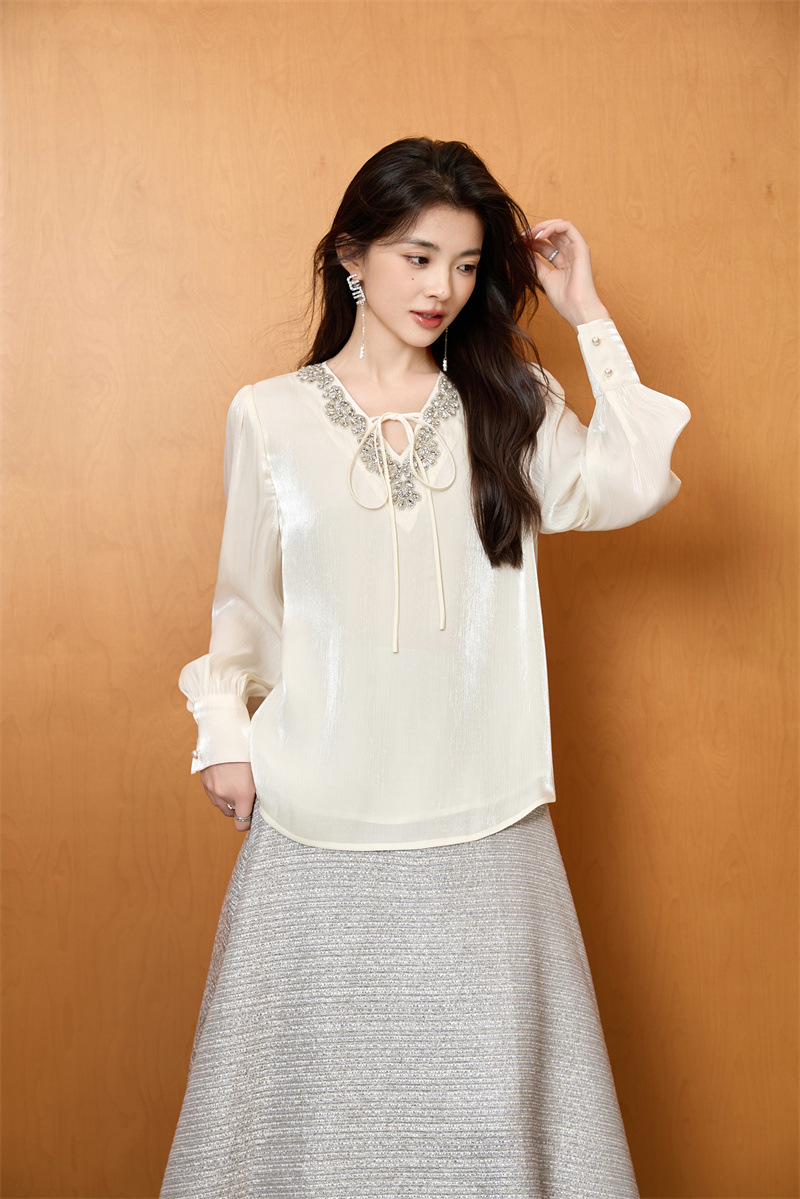 「自」全新升级【铂金会员165/天猫219/差价54】(21337)洛诗琳法式温柔重工水钻衬衫2025秋季气质V领显瘦雪纺上衣女