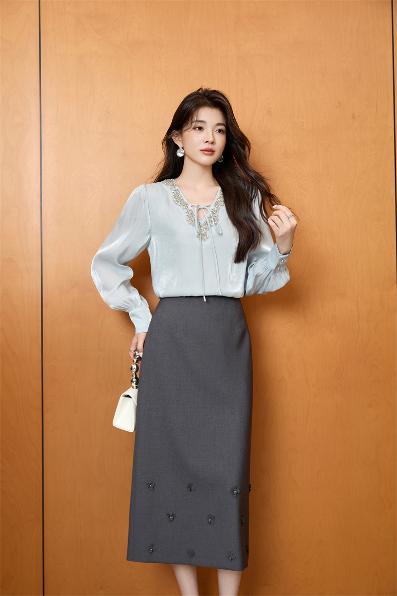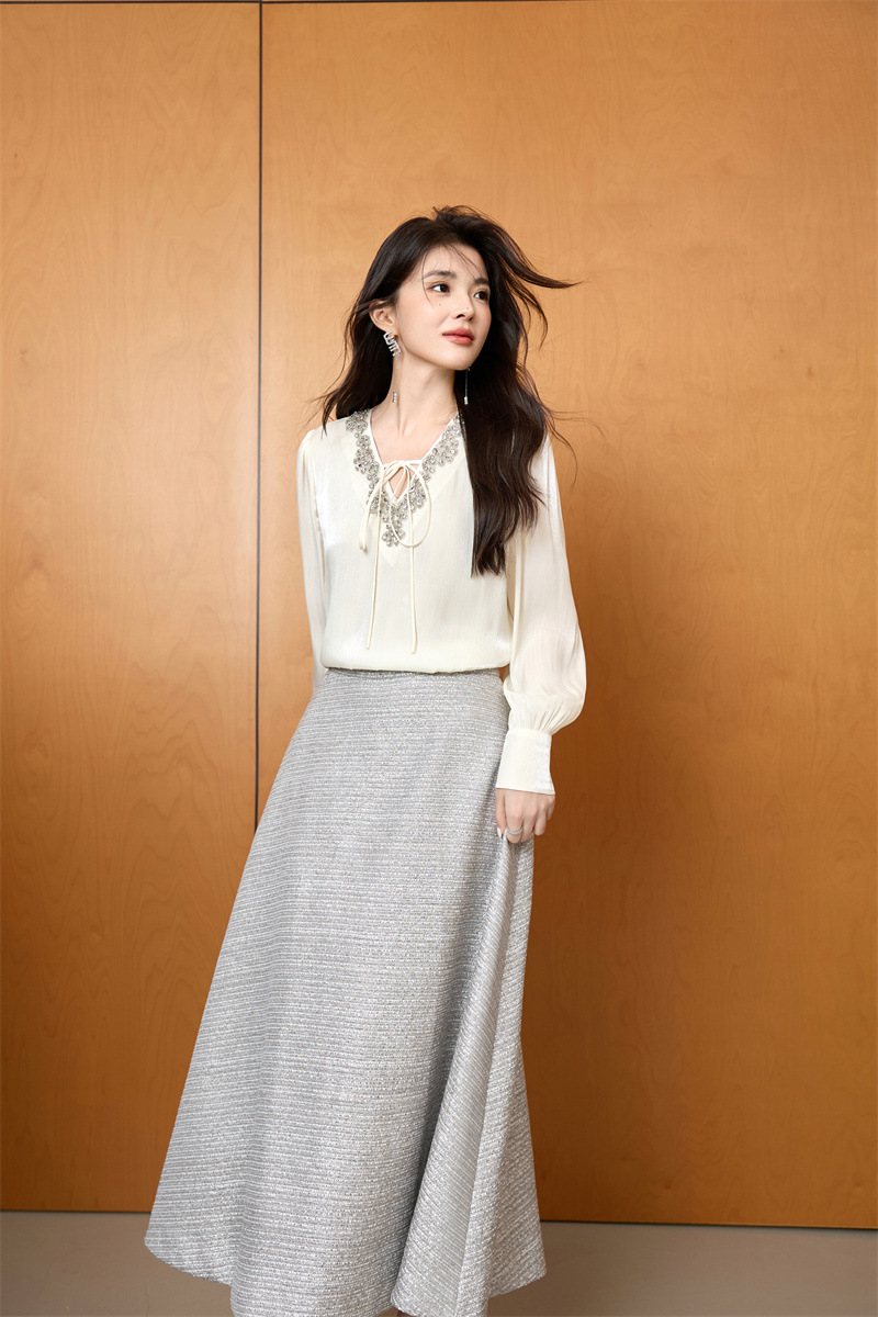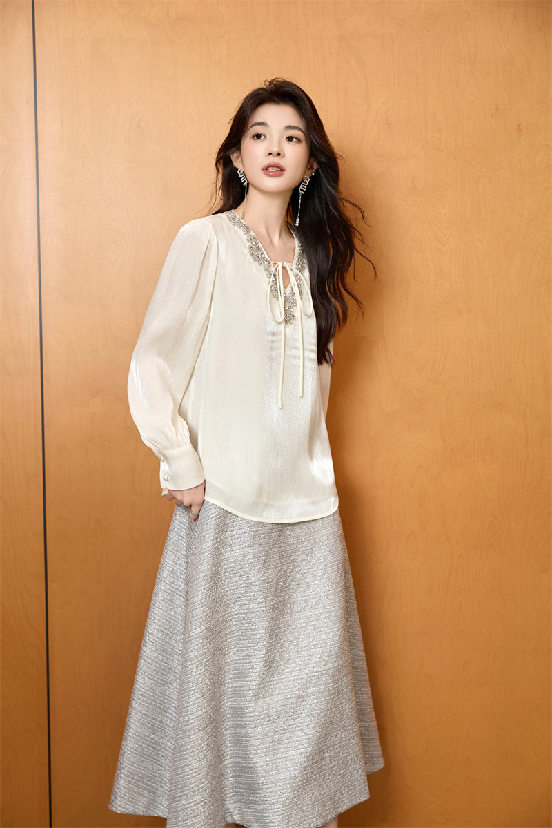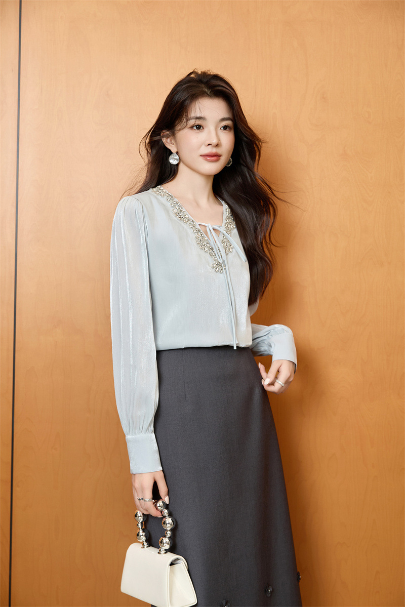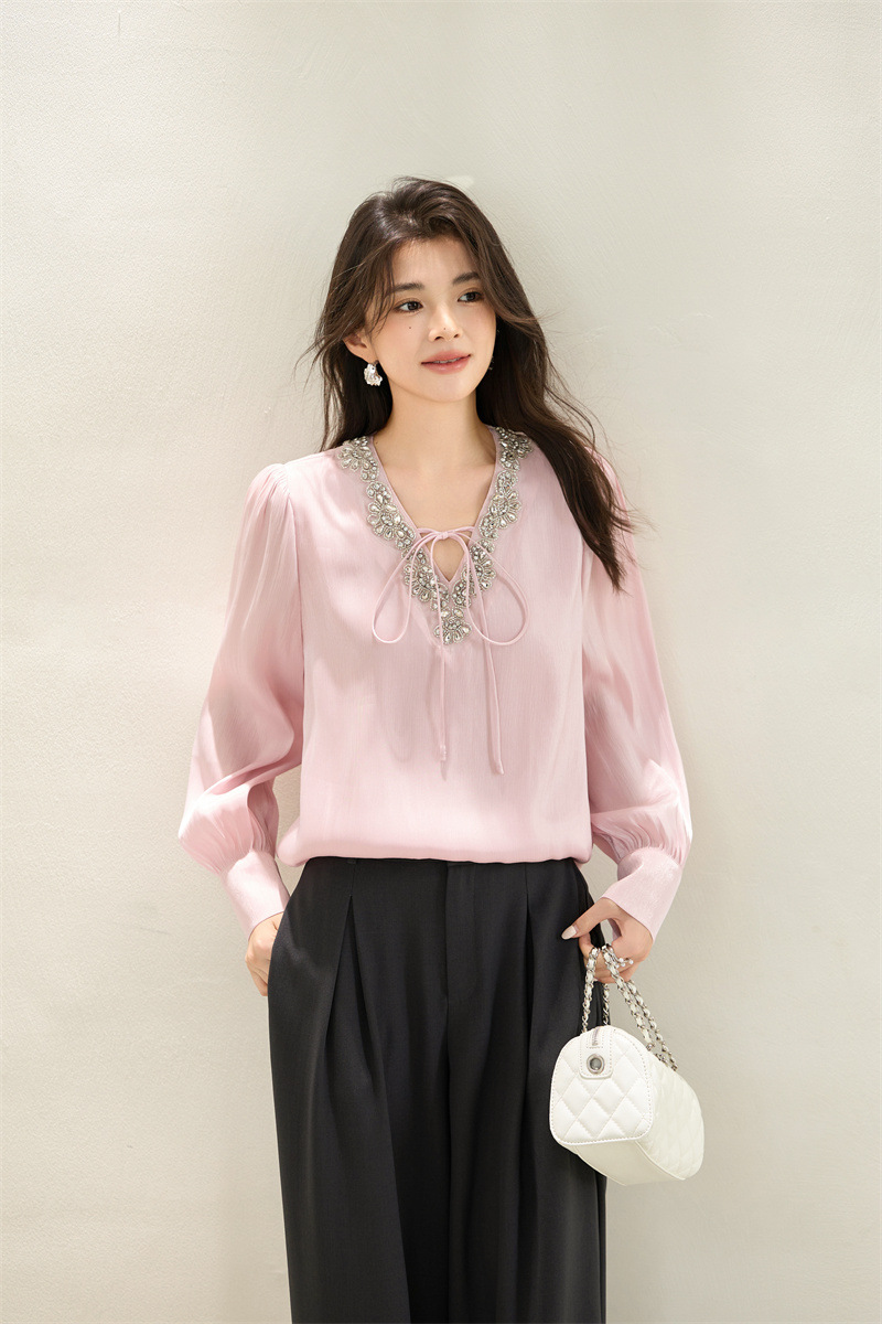 「自」全新升级【铂金会员165/天猫219/差价54】(21337)洛诗琳法式温柔重工水钻衬衫2025秋季气质V领显瘦雪纺上衣女