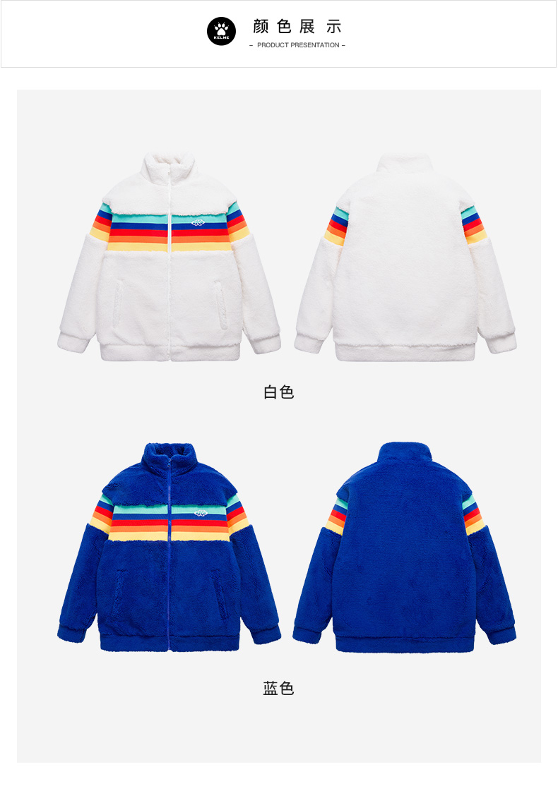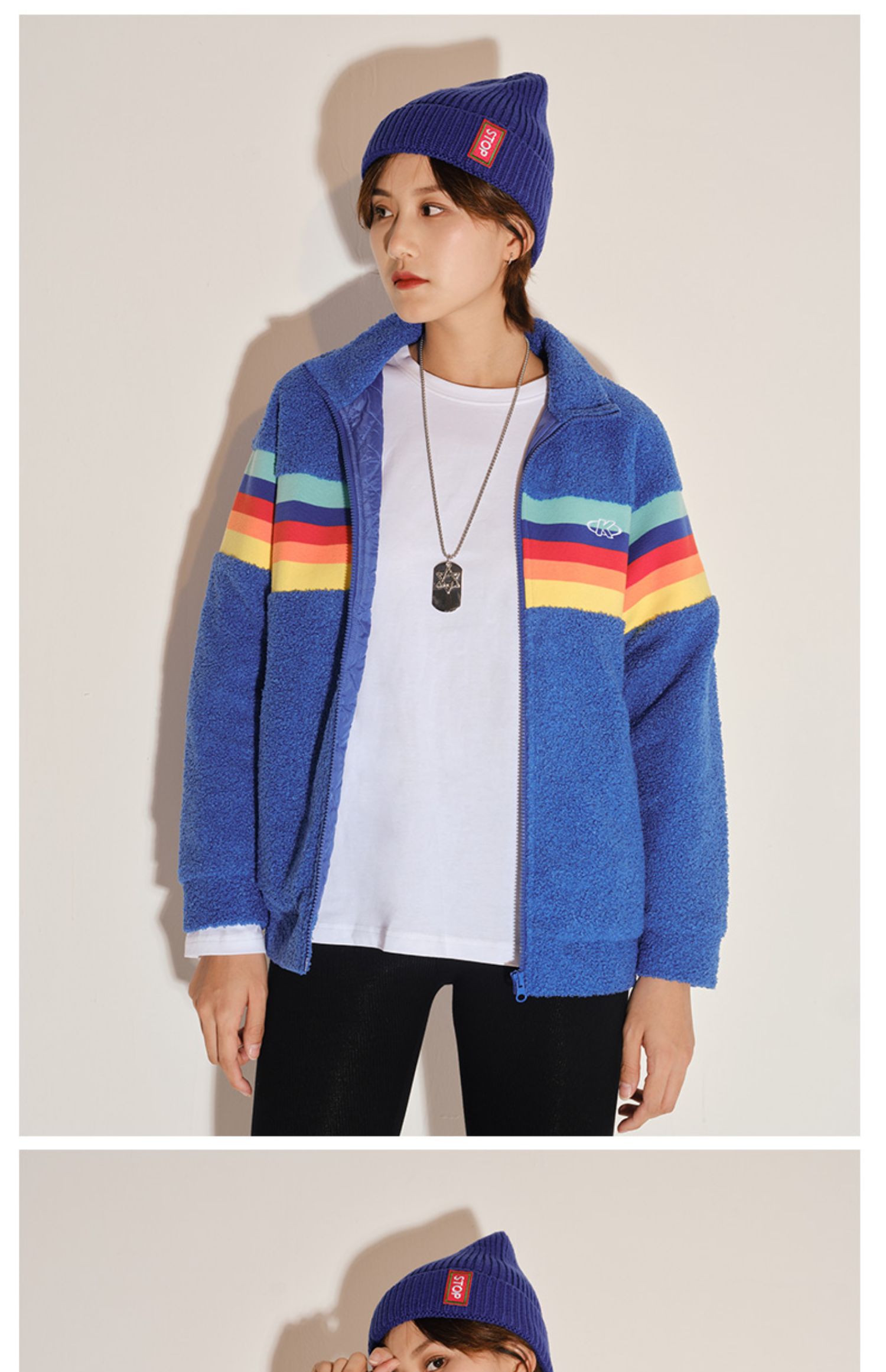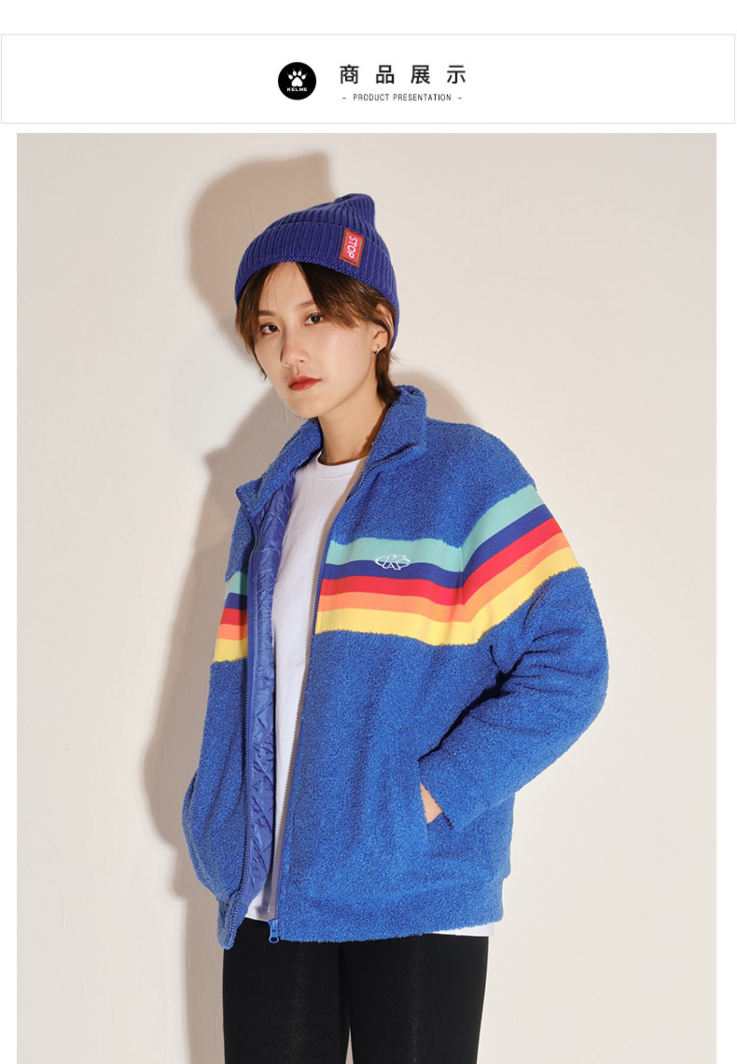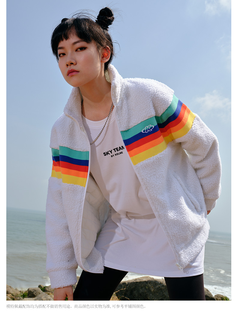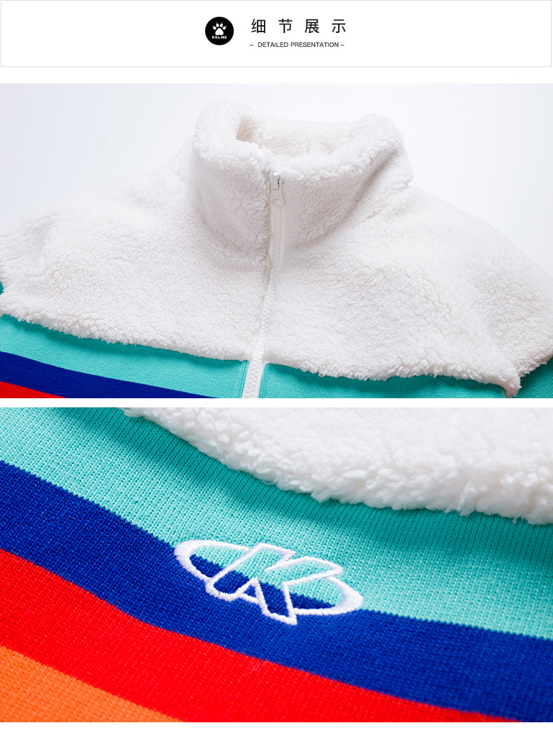 KELME卡尔美彩虹羊羔绒外套女秋冬撞色开衫翻领保暖茄克上衣