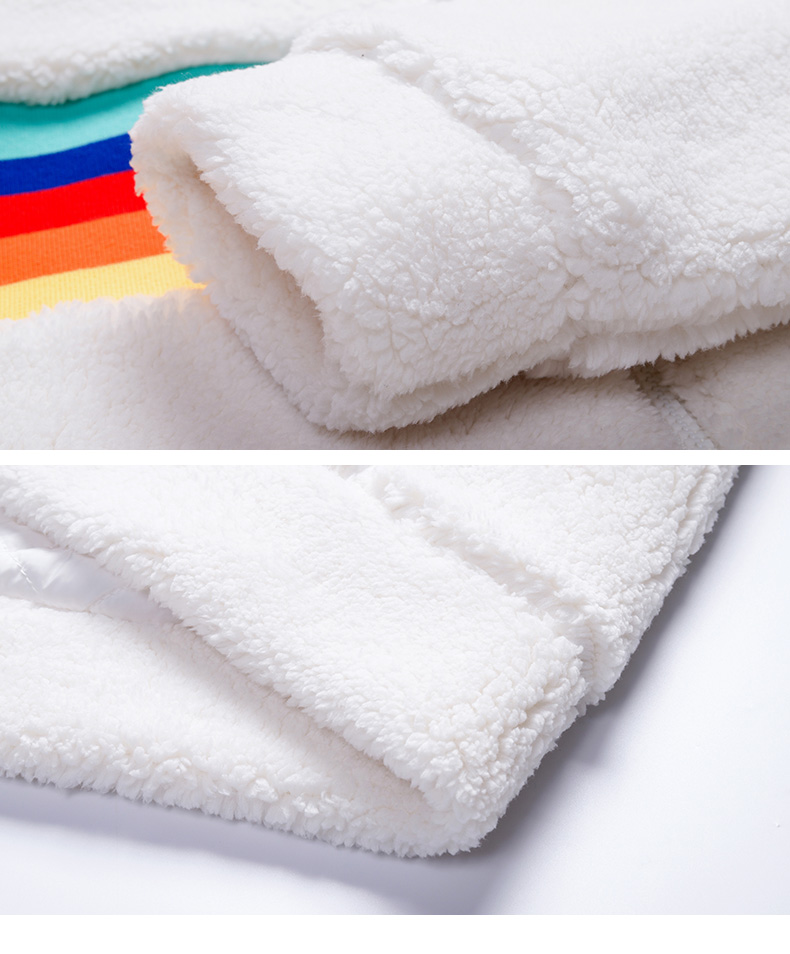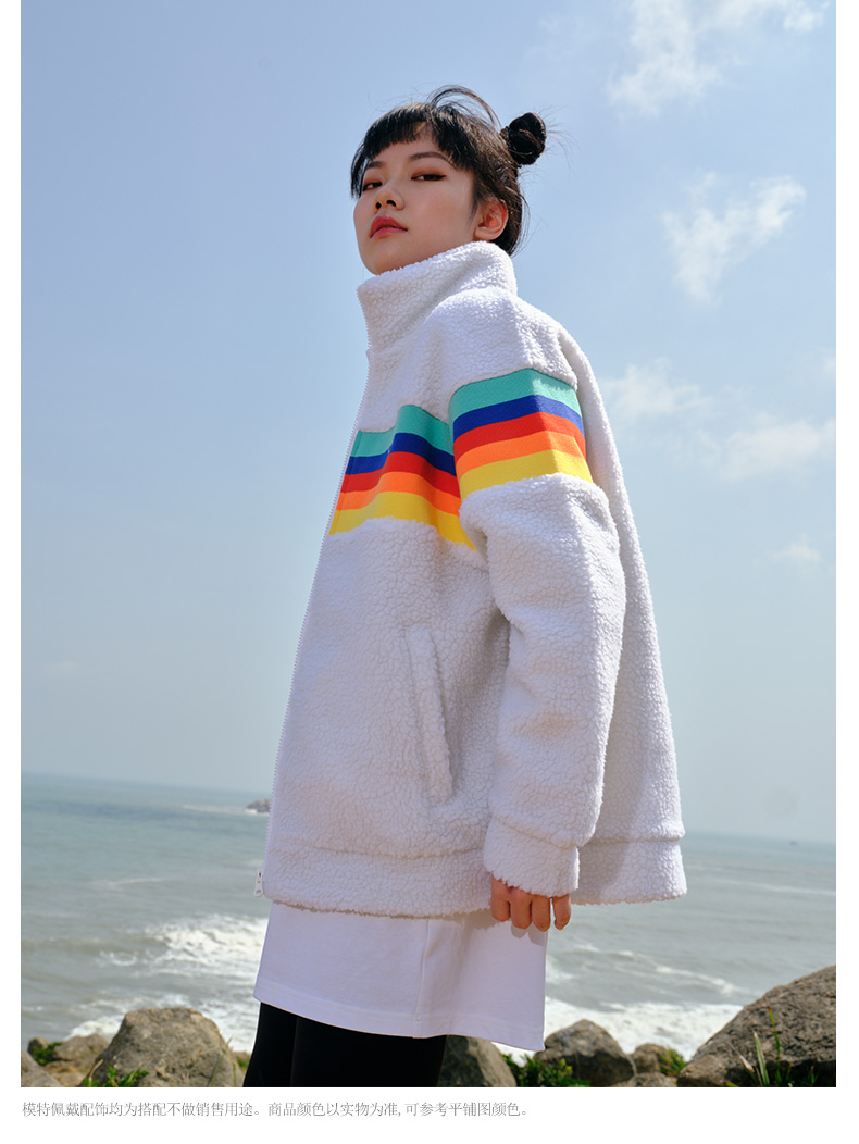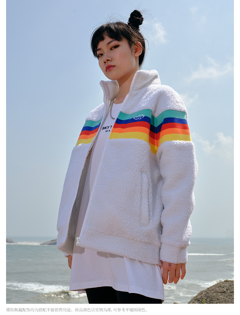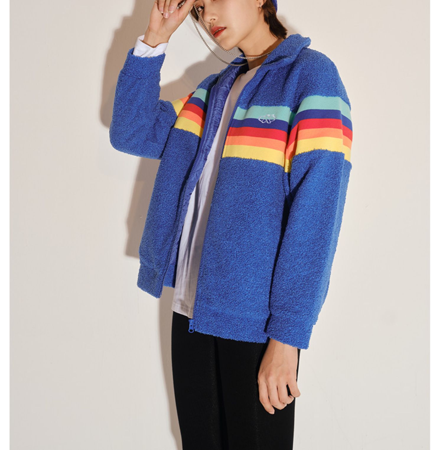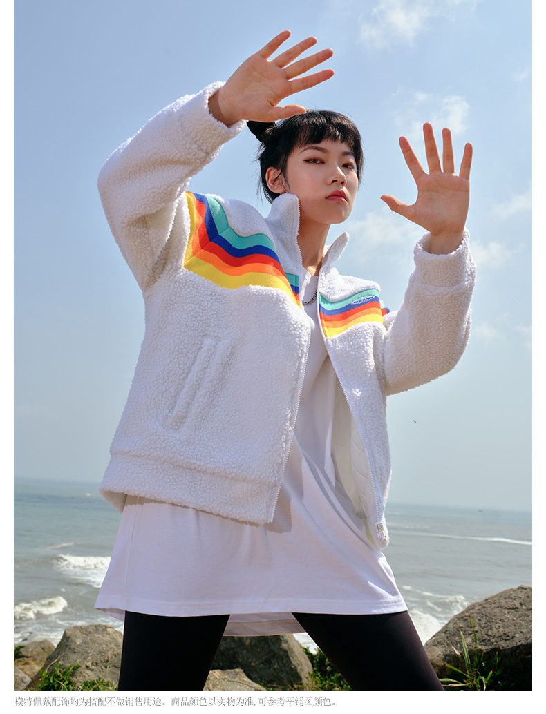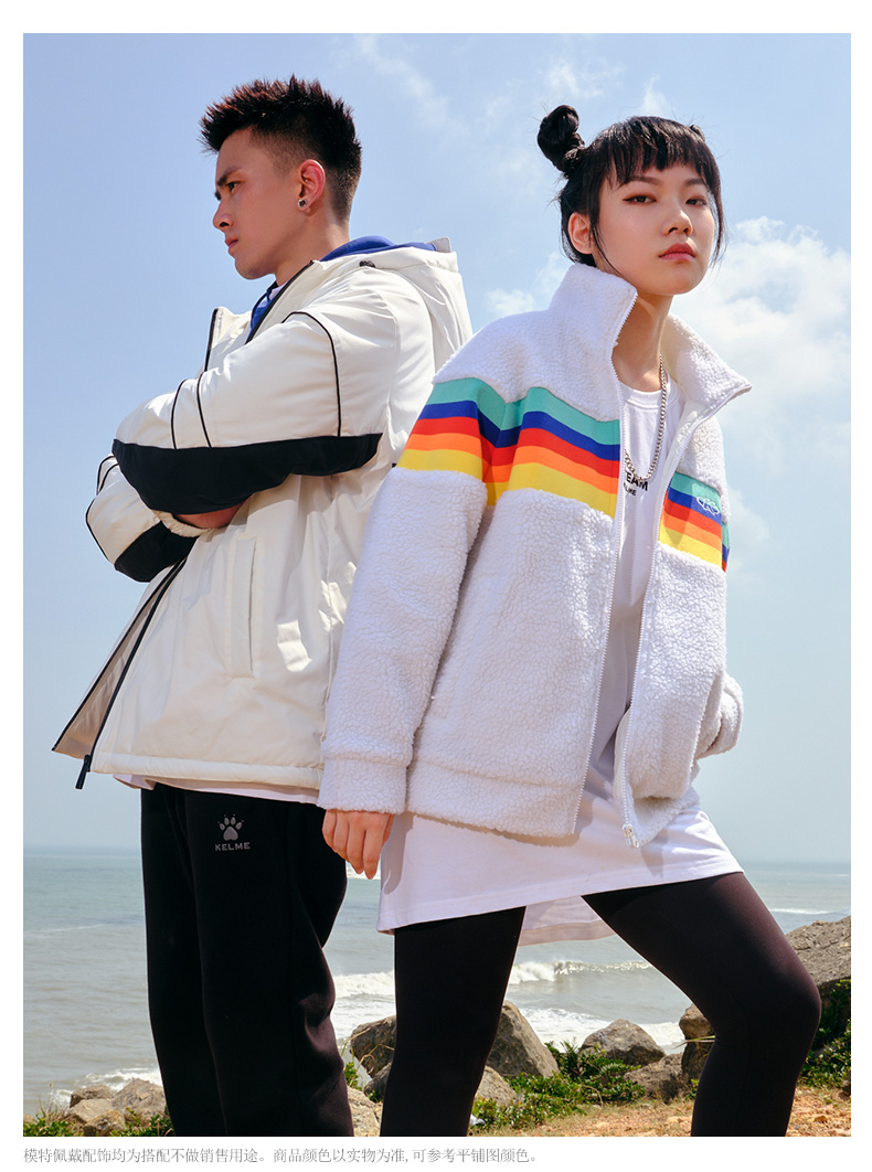 KELME卡尔美彩虹羊羔绒外套女秋冬撞色开衫翻领保暖茄克上衣