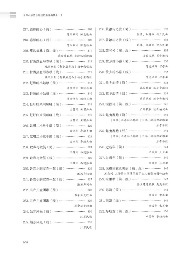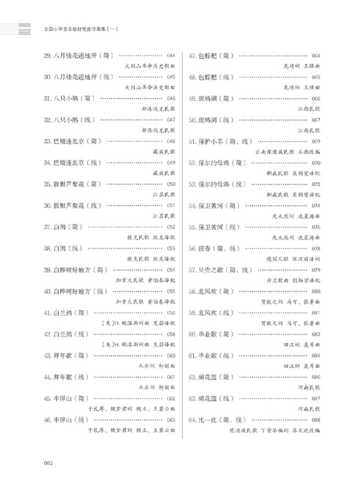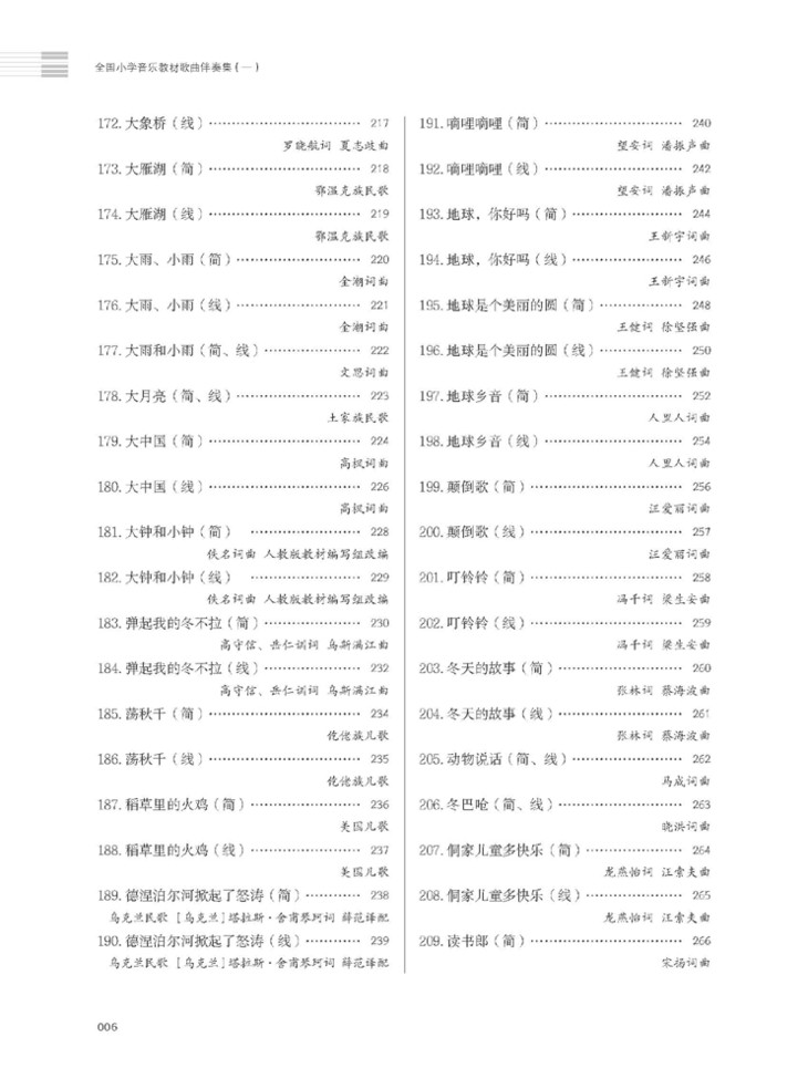 歌曲弹唱是小学音乐教学中最主要的教学活动,是一门理论与实践相结合的技能技巧课,具有很强的实用性;也是小学音乐教师知识、技术、能力与素质的综合体现,是每位音乐教师必备的能力!然而,现实中歌曲弹唱却是很多老师的短板,特别是在伴奏方面,鉴于此,我们推出了这一套《全国小学音乐教材歌曲伴奏集》,旨在用最简单好听的伴奏,让老师们快速上手,弹唱自如,轻松教学。本套曲集选取了全国最新修订的小学音乐课标教材的“歌曲”部分,包括人音版、人教版、西师版、湘艺版、花城版、接力版、冀少版、苏少版等,精选出627首编配成钢琴弹唱谱,无缝对接全国各地小学音乐歌唱教学活动,非常实用。曲集共四册,本册是第一册,选取了《阿里里》《布娃娃弹琴》《地球是个美丽的圆》《赶海的小姑娘》等154首歌曲,有如下几个特点:一是选曲全面,精选了全国入选的8套音乐课标教材中,共同出现的、频率高的经典歌曲,以及各版本有代表性的、优秀的地方民歌、儿歌等;二是曲目量大,包括全国绝大部分小学音乐课标教材中出现的歌曲,全国各地学生均可使用;三是内容实用,考虑到全国各地一线教师不同的读谱习惯,每首歌曲均以五线谱和简谱对照呈现,并按照适合小学生歌唱的音域范围给歌曲定调进行编配,使小朋友们能够在老师的琴声中同步歌唱;四是配套资料丰富,我们为每首歌曲录制了示范音频,以二维码的形式呈现,学生可即扫即听即学即唱。