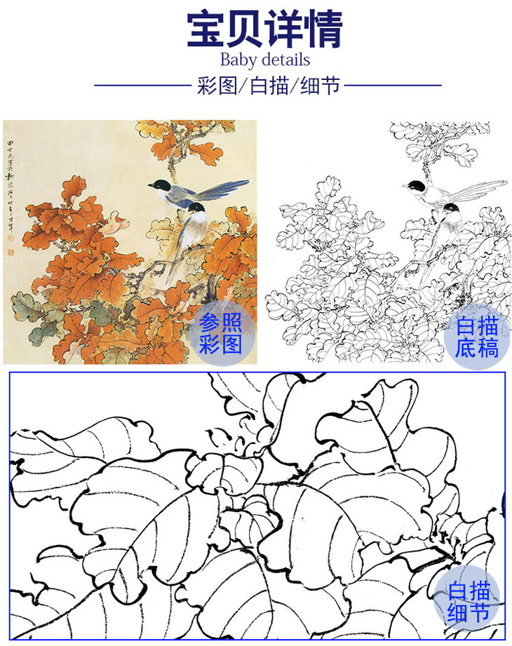 田世光工笔花鸟白描底稿-《秋艳双栖图》斗方小品册页-多种白描尺寸可选 -SG05