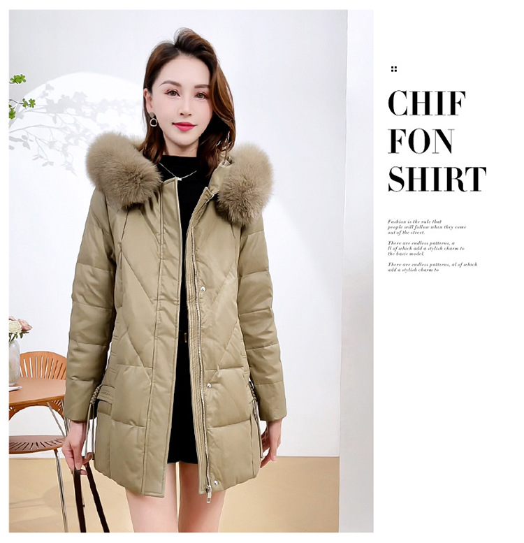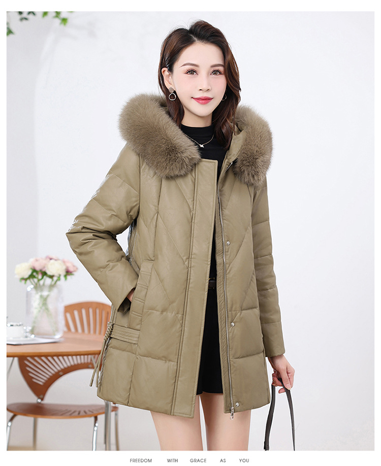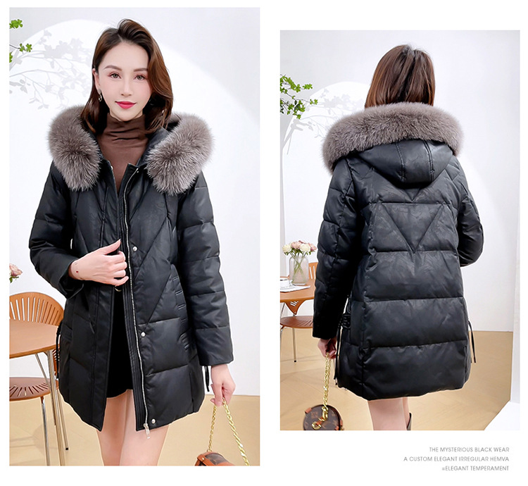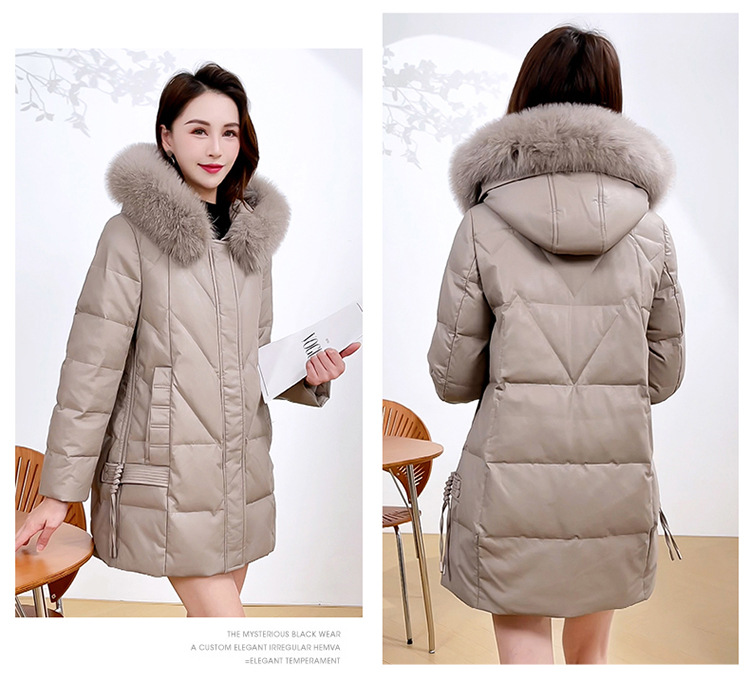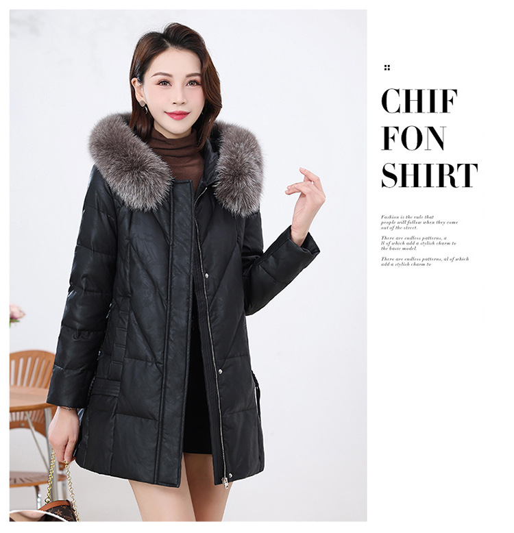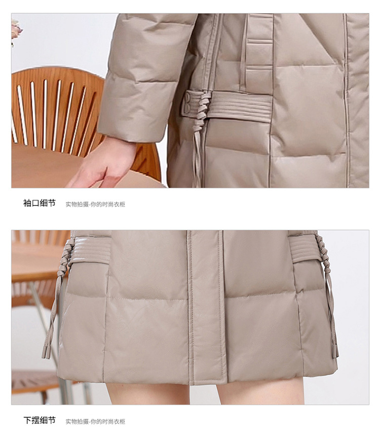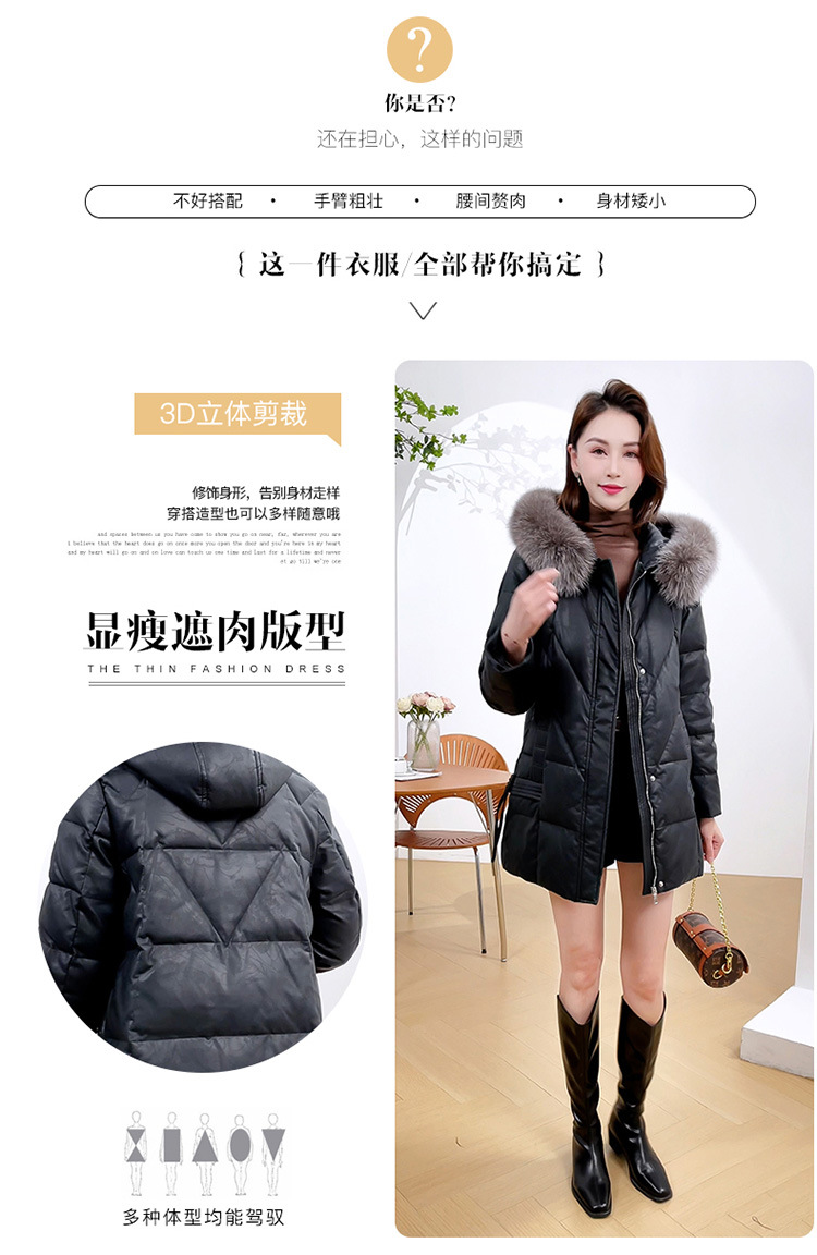QYM 4B11休闲中长款休闲连帽PU皮白鸭绒毛领加厚保暖外套