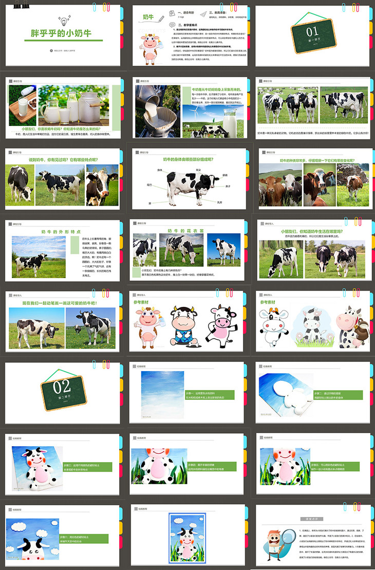 通过观察和欣赏有关奶牛的图片素材,说一说奶牛的外形有哪些特点,有哪些色彩变化?在课程中,运用超轻粘土来表现出奶牛外形的基本特点,可以添加夸张和卡通拟人的方法,让奶牛看起来更加的活泼可爱。微信公众号:创意少儿美术馆。