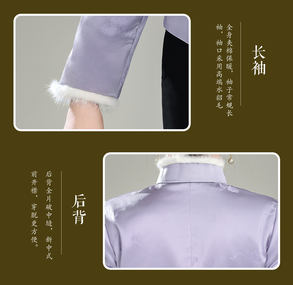 【紫映】提花毛领新中式开襟,夹棉旗袍唐装上衣外套XGT-T25169