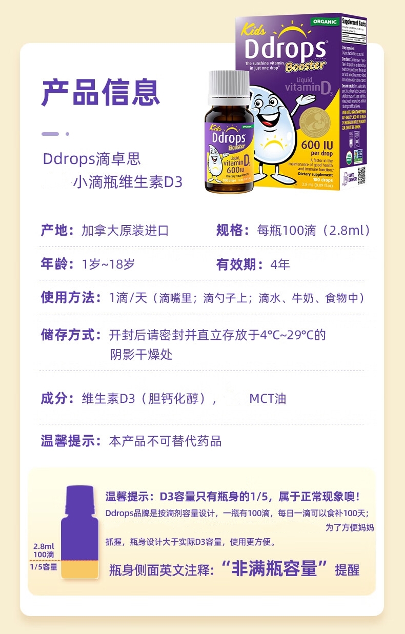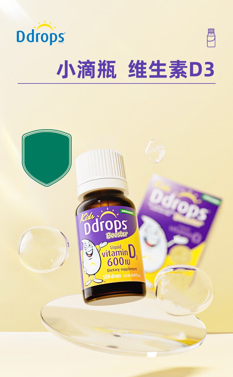 【跨境】加拿大Ddrops 滴卓思 婴幼儿童营养vd3维生素D3滴剂 600IU*2.8ml/瓶(1岁-18岁)