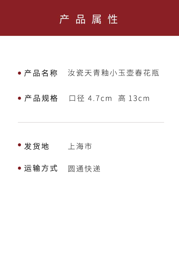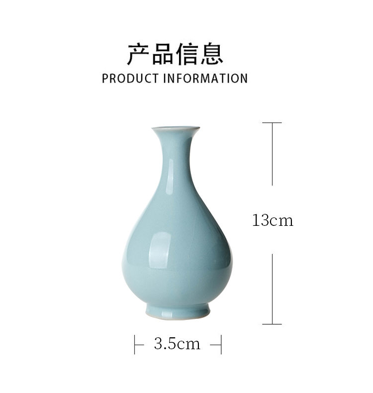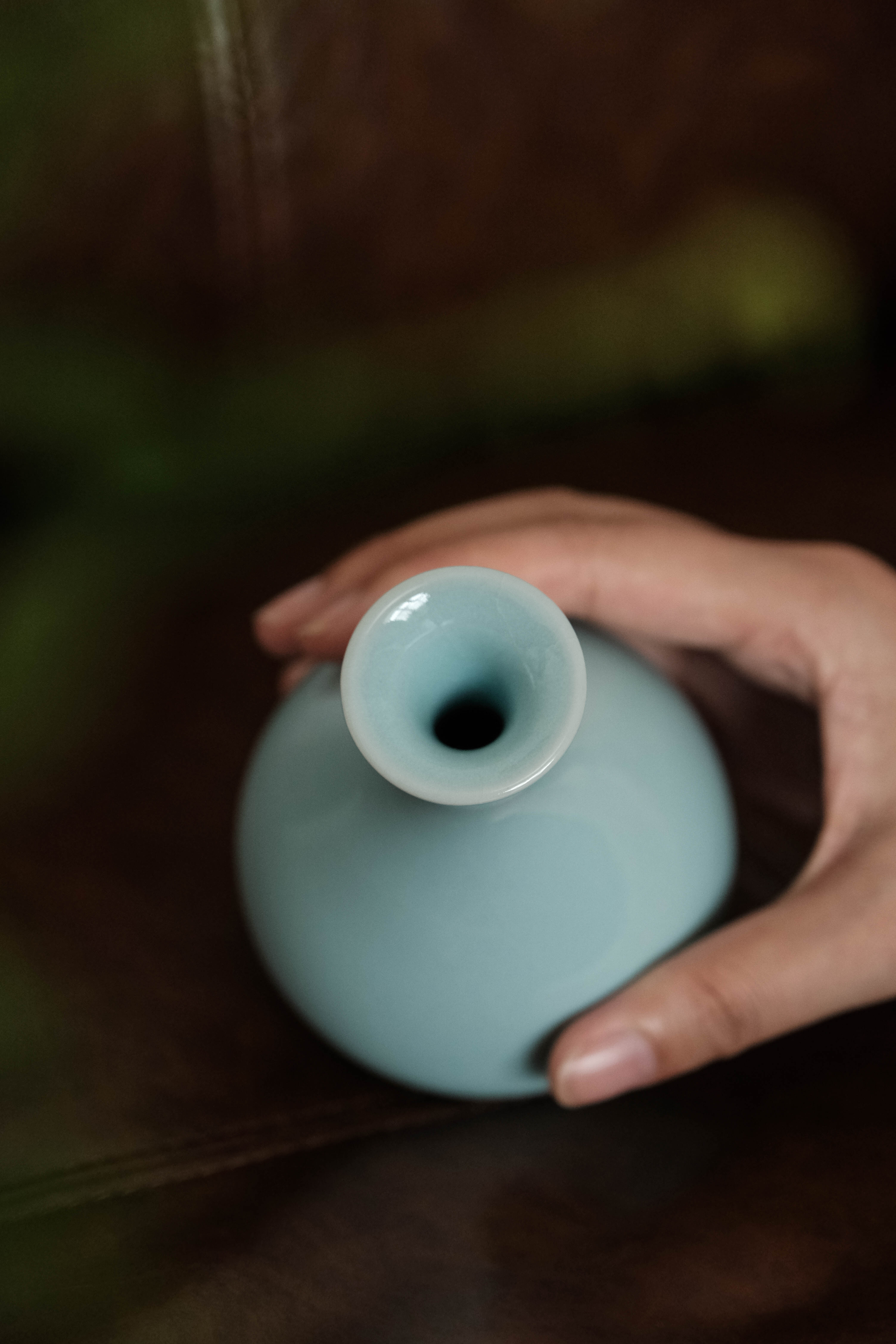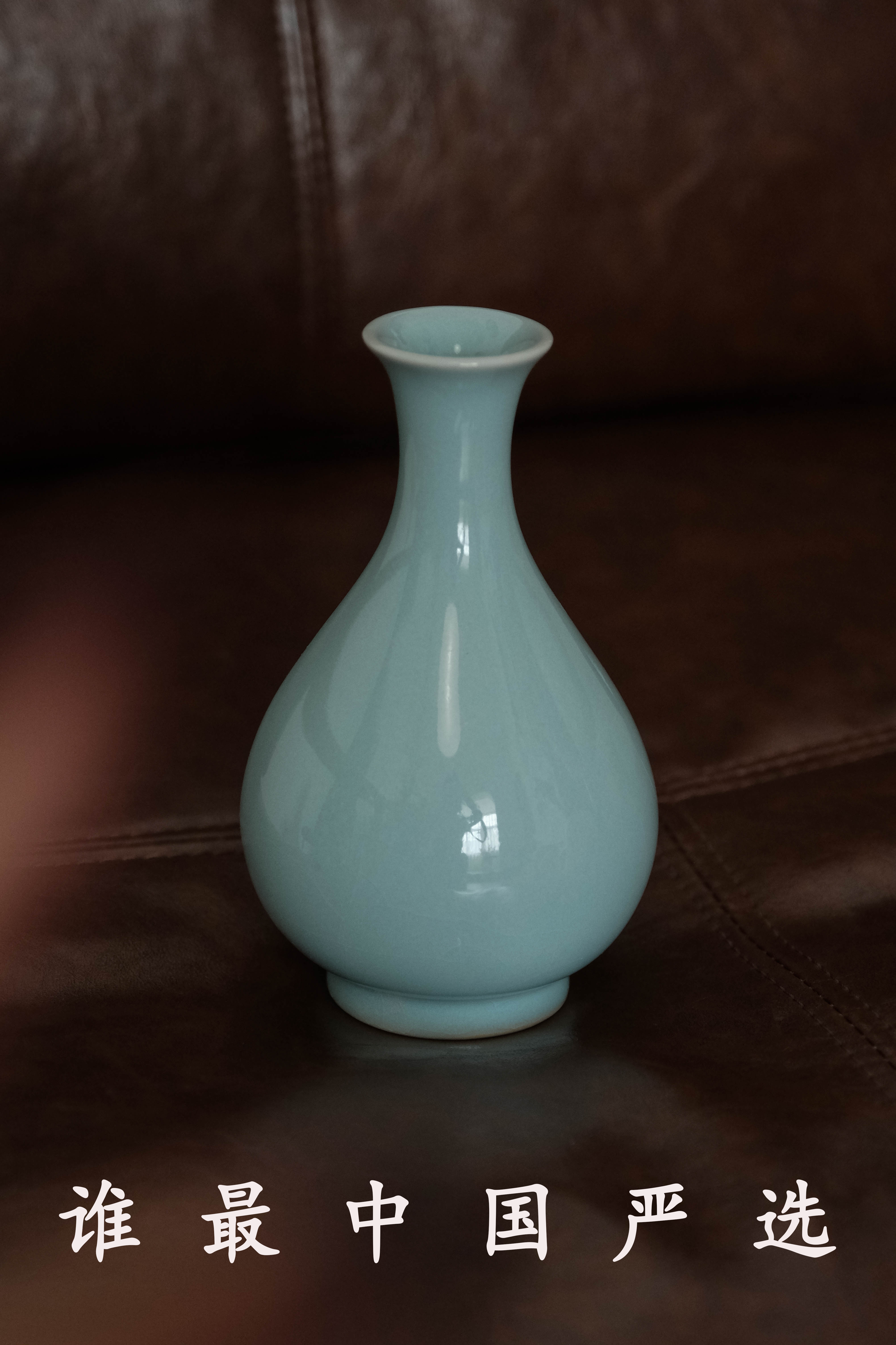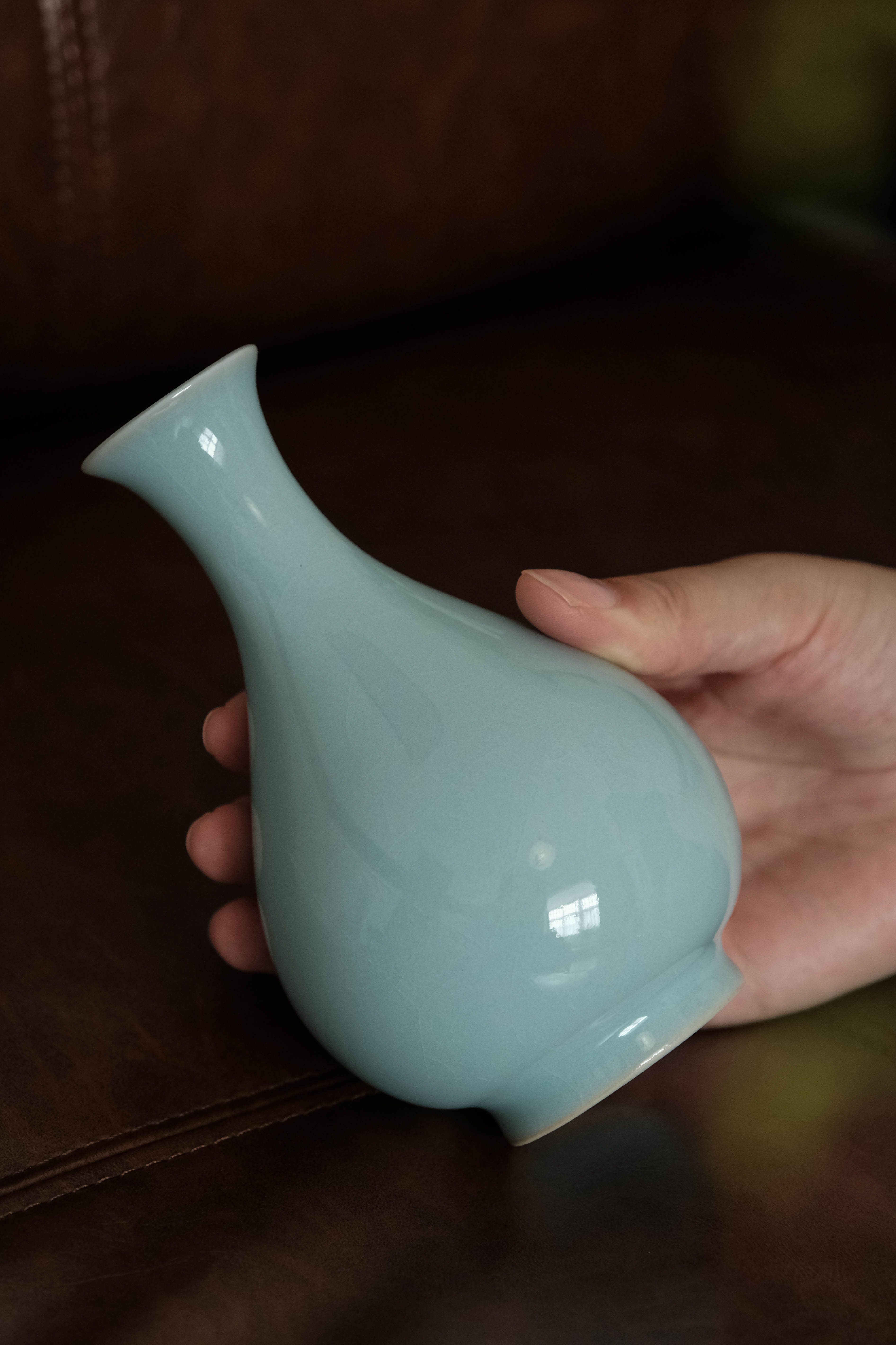 汝瓷天青釉小玉壶春花瓶 器型承袭宋式经典,颈项纤秀, 腹部丰盈,线条流畅如凝脂 釉色温润似雨后初晴