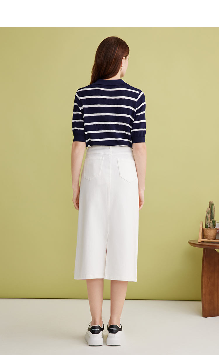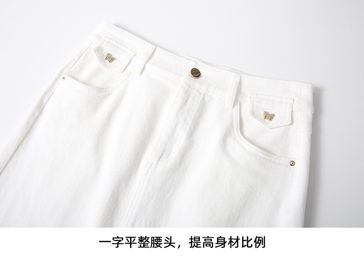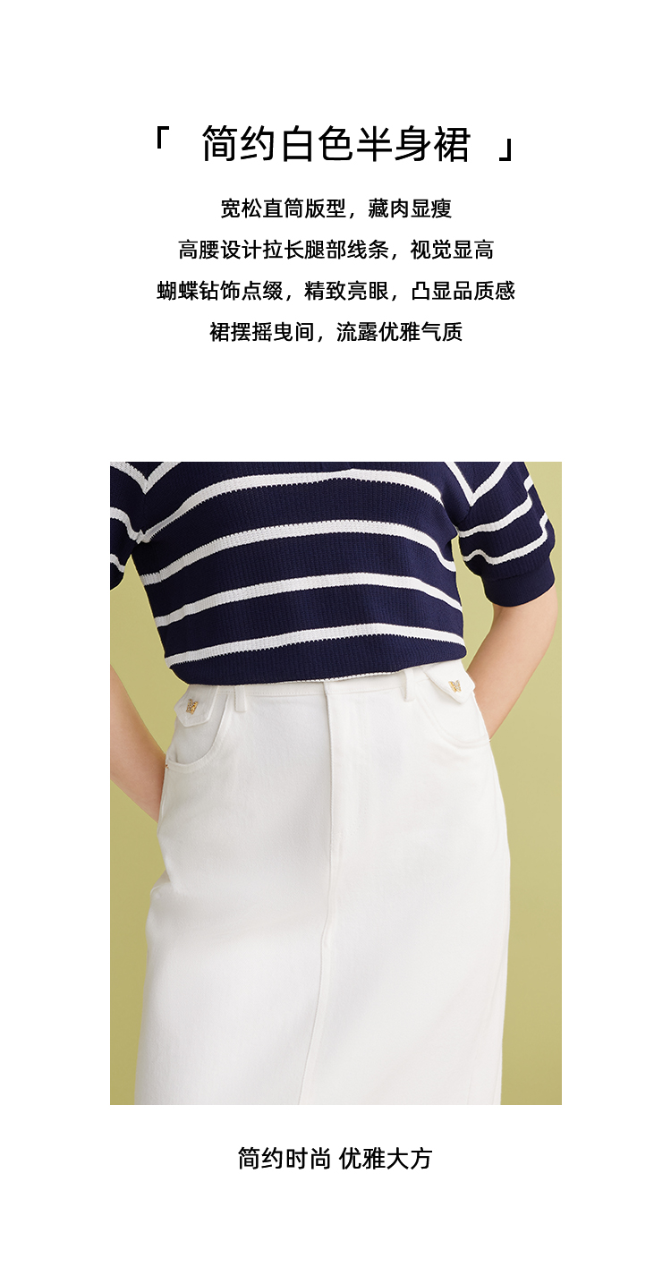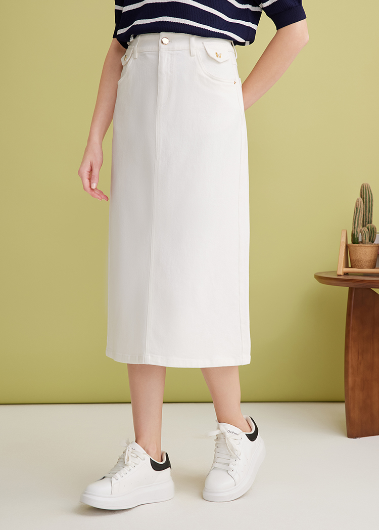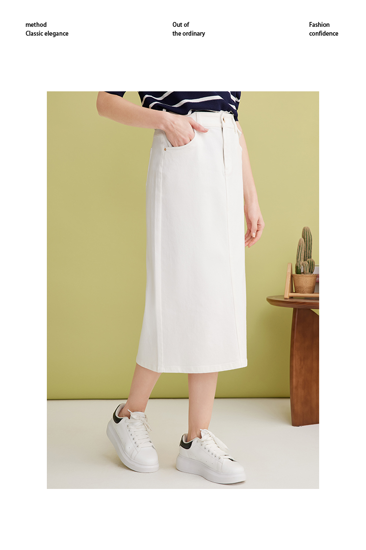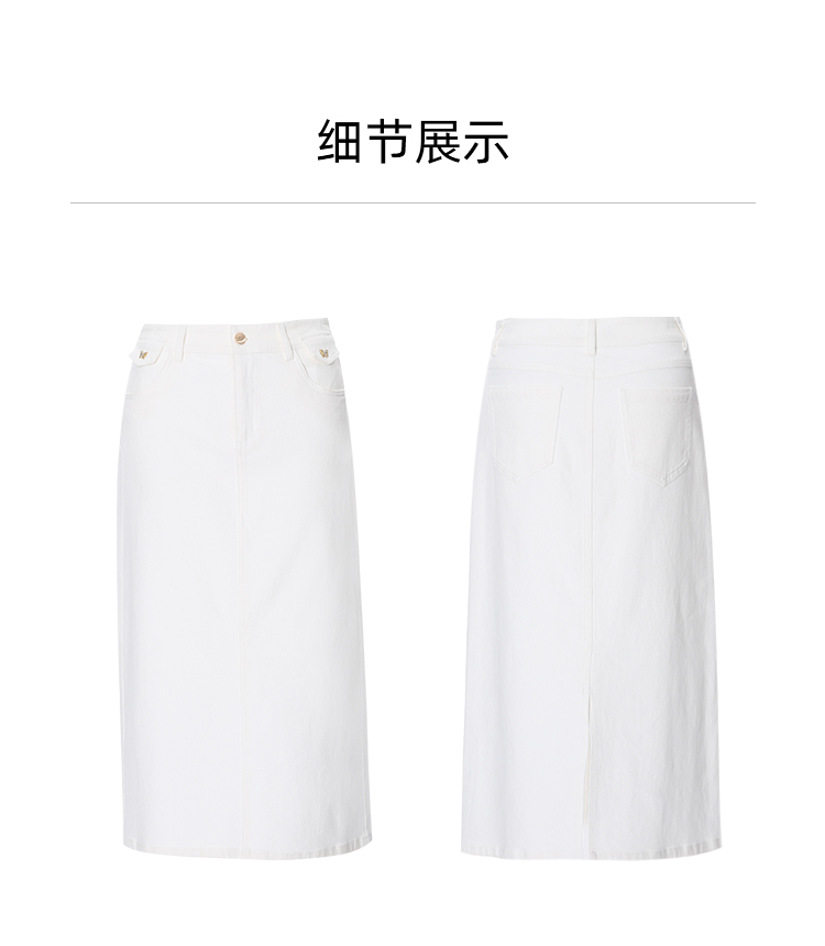 EITIE爱特爱简约白色显瘦高腰开叉a字过膝牛仔半身裙春季新款A2506515