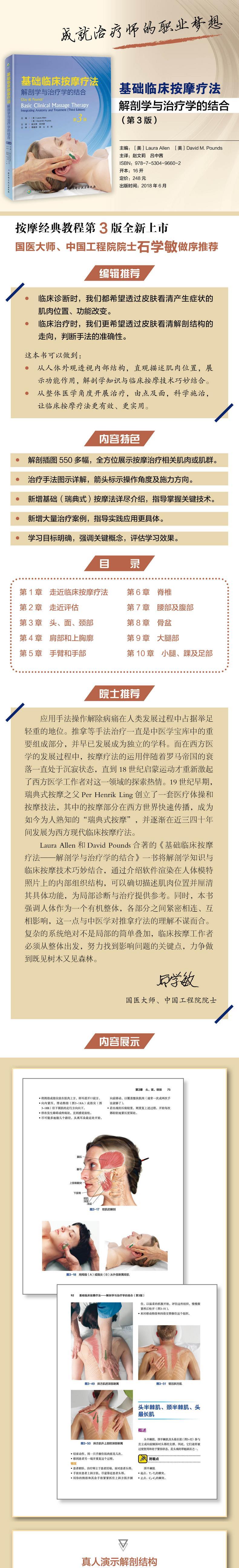 临床诊断时,我们都希望透过皮肤看清产生症状的肌肉位置、功能改变;临床治疗时,我们更希望透过皮肤看清解剖结构的走向,判断手法的准确性。本书注重从人体外观透视内部结构,直观描述肌肉位置,展示功能作用,巧妙结合解剖学知识与临床按摩技术。从整体医学角度开展治疗,由点及面,科学施治,让临床按摩疗法更生动、更实用。