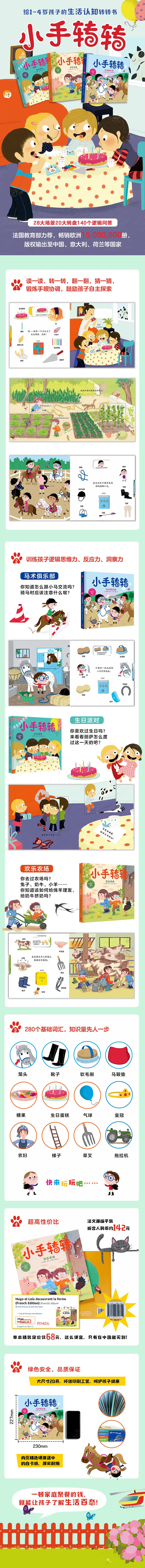 《小手转转》,不光是知识百宝箱,还是玩具书,也是一套故事书。 ★能玩起来的知识百宝箱,让孩子从2岁玩到7岁。 2岁孩子转转、翻翻,享受动手的乐趣;大孩子学知识、答问题,获得在玩中学的成就感。 ★帮孩子认识世界的套转转书,很特别的是它的转盘设计,体验感品质!把职业场景知识用问答的形式呈现在转盘上,让孩子感受当小侦探的乐趣。电影“小荧幕”式的转盘镂空设计,转一下就有新画面。读一读,转一转、翻一翻、猜一猜,把学习变成游戏。 ★一本书多方面了解不同职业特点,只需转一转,该了解的知识一个都不少。 ★法国教育部力荐,畅销欧洲600万册。 法国原版一经上市就征服了欧洲的年轻妈妈们,在fnac网站(雅客)迅速成为机关玩具书名。
