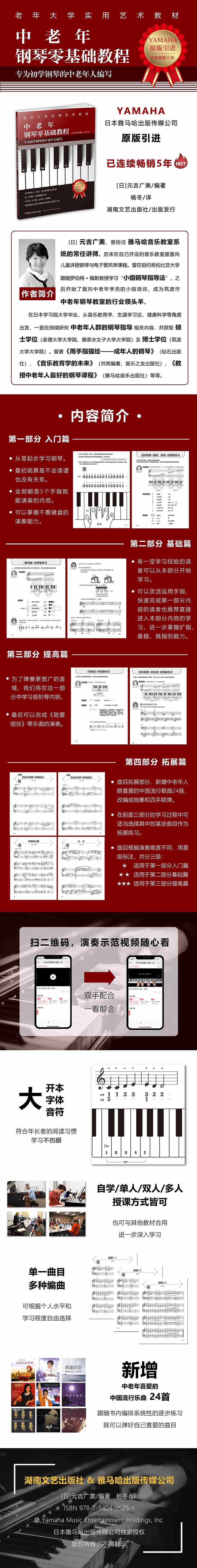 此部分为曲目拓展部分,编写了一些根据中老年人群喜爱的歌曲改编成的独奏和四手联弹,在前面三部分的学习过程中可适当选择其中的某些曲目作为拓展练习。