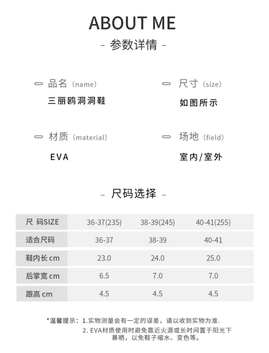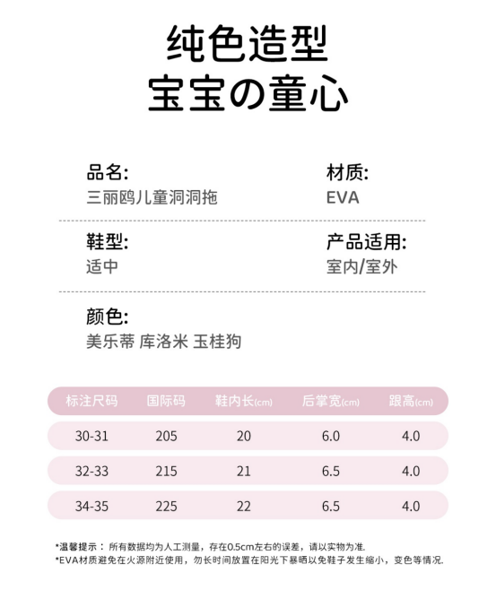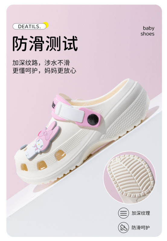 高品质 eva ,质地柔软如同棉花糖 软底设计贴合儿童稚嫩脚丫 洞洞鞋经典透气设计,时刻保持鞋内干爽 鞋底独特防滑纹路,湿滑地面也能稳步前行, 一鞋两穿满足孩子多样活动需求