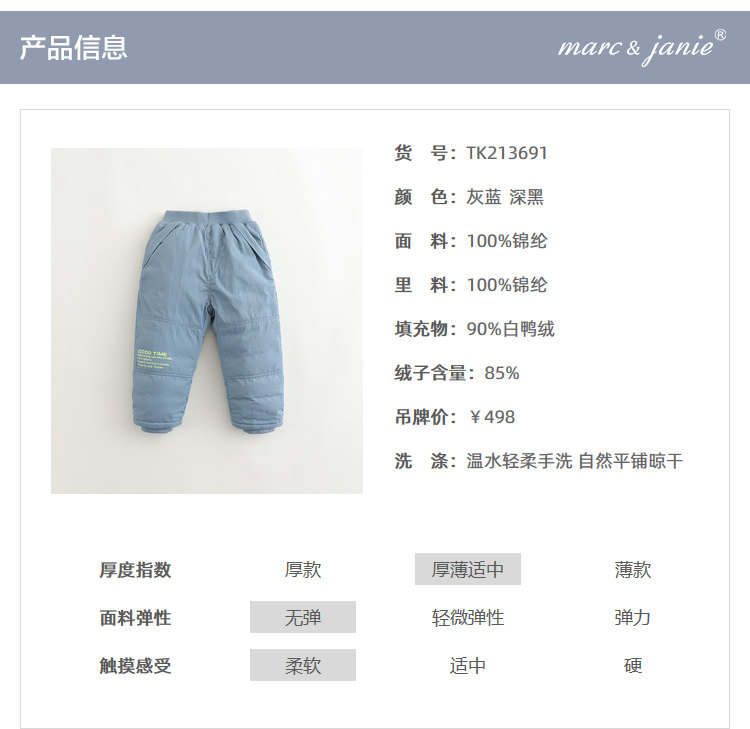 【加厚保暖】马克珍妮新款冬装 男童羽绒裤 儿童裤子213691