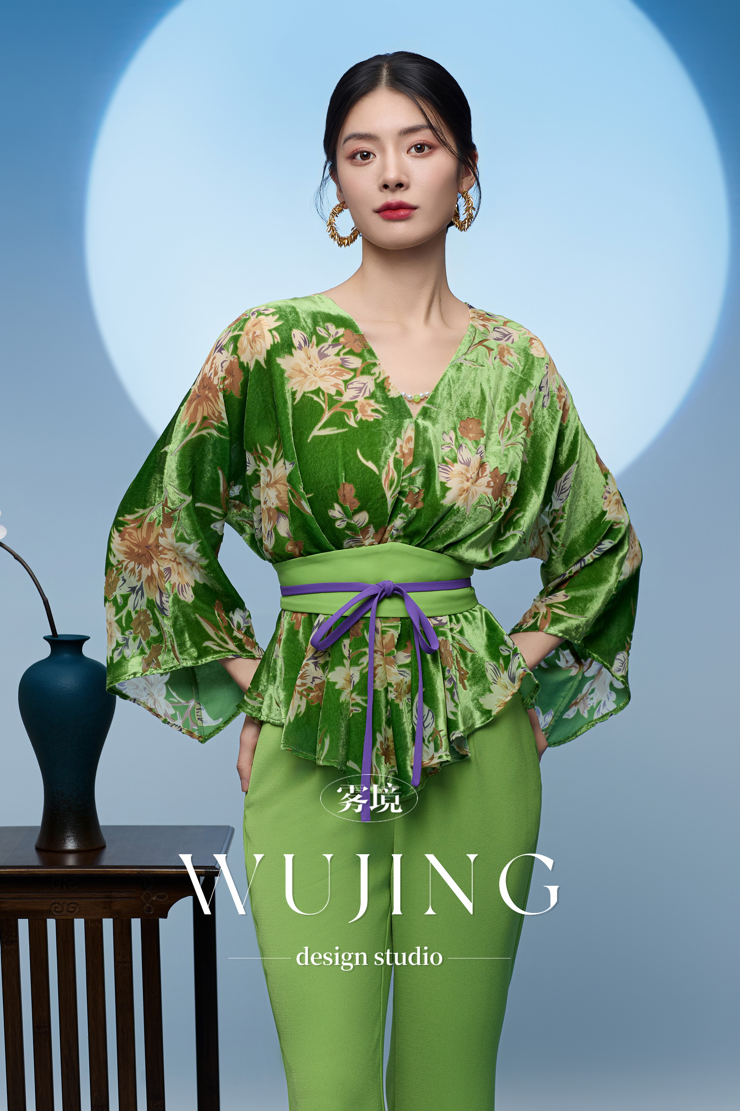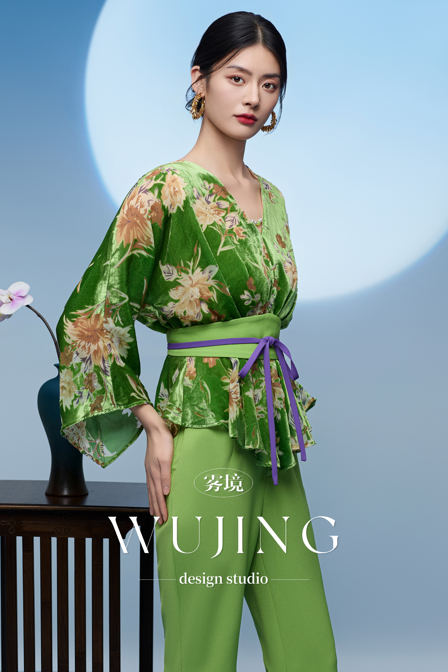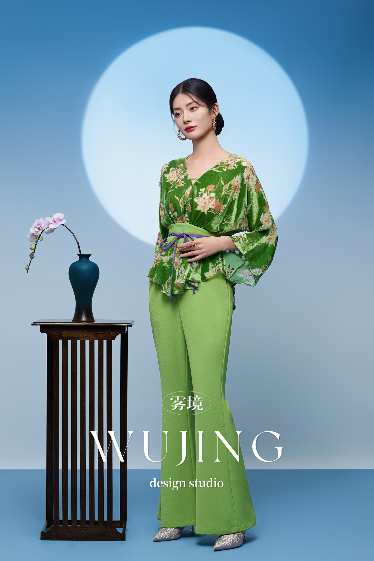 3205034 柳碧青梅 进口纹理蜂窝缎裤子 雾境