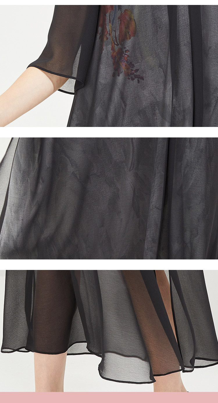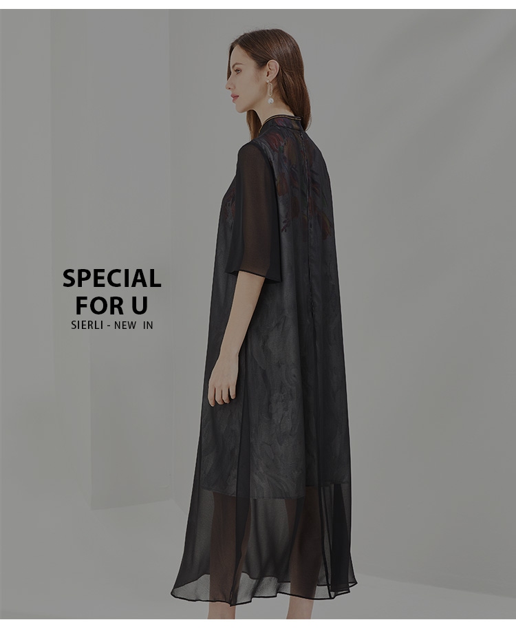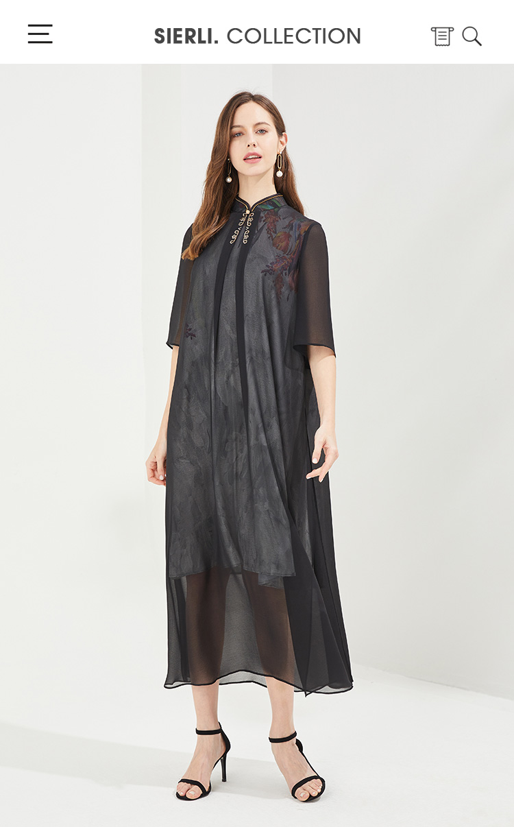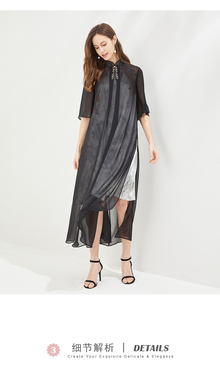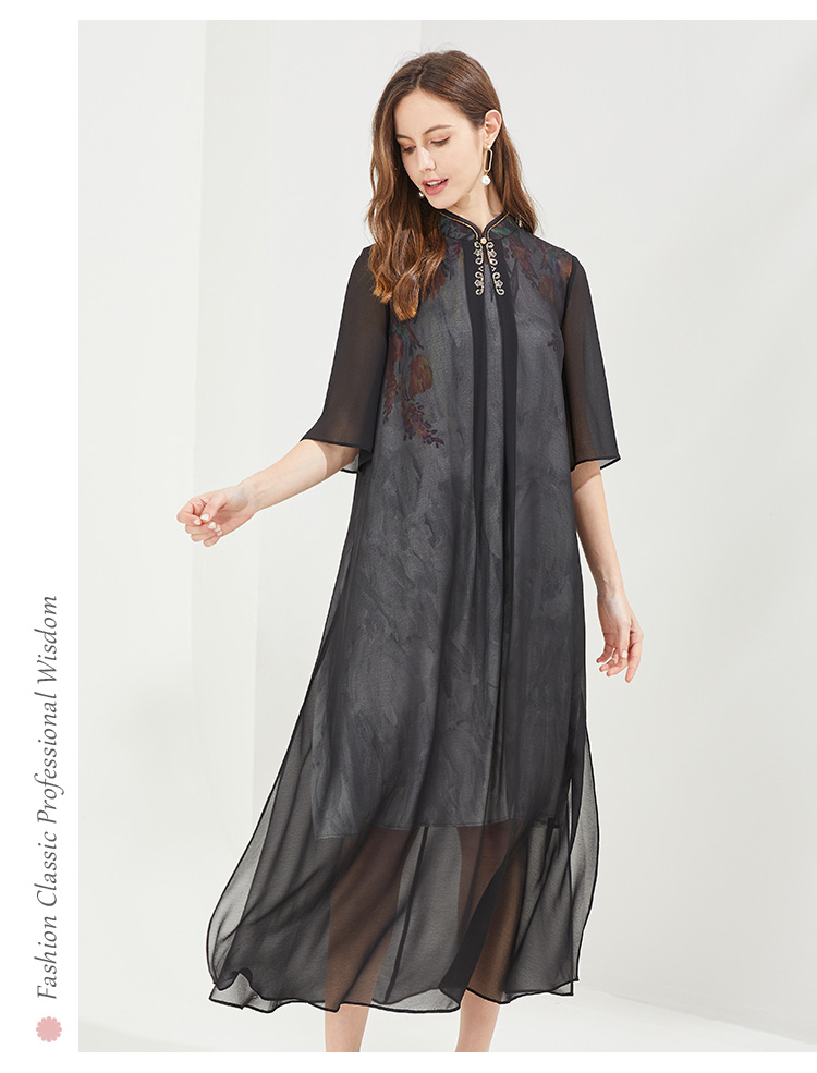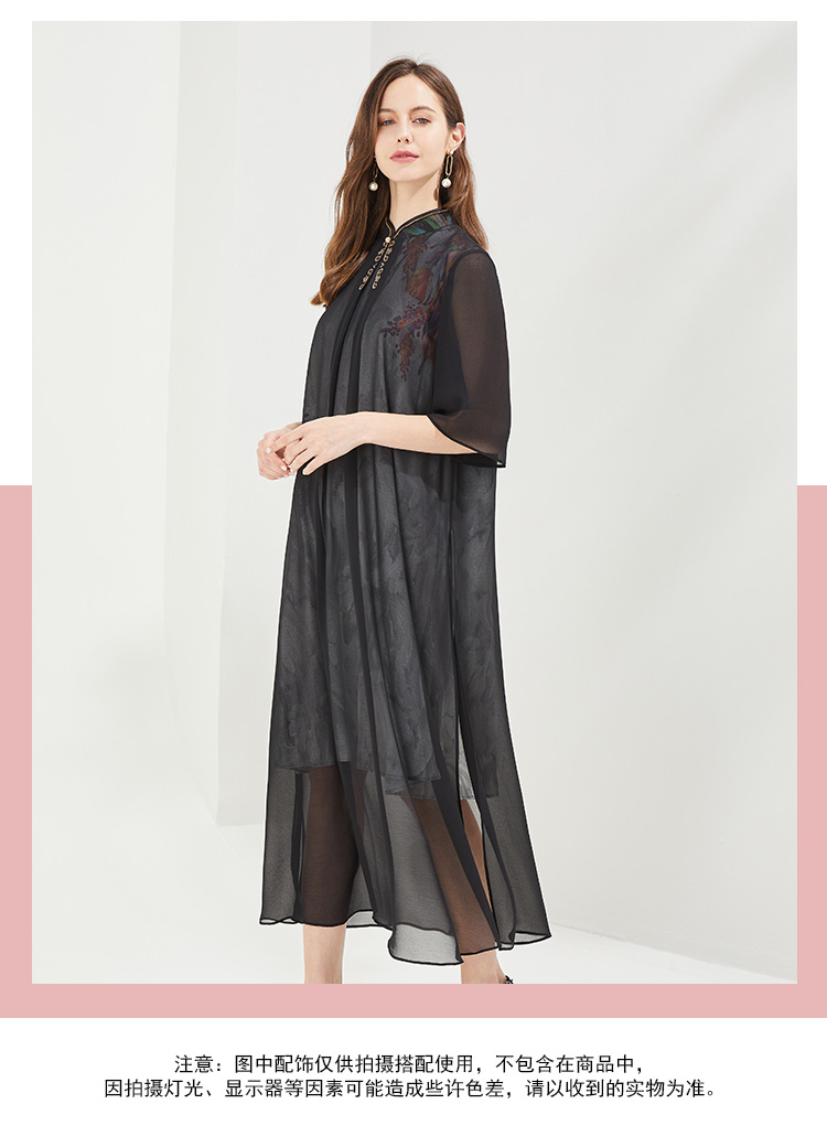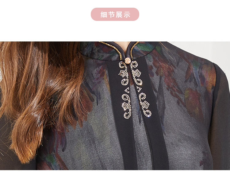 PG87E斯尔丽瑟俪旗立领定位花烫钻中式撞色长款连衣裙