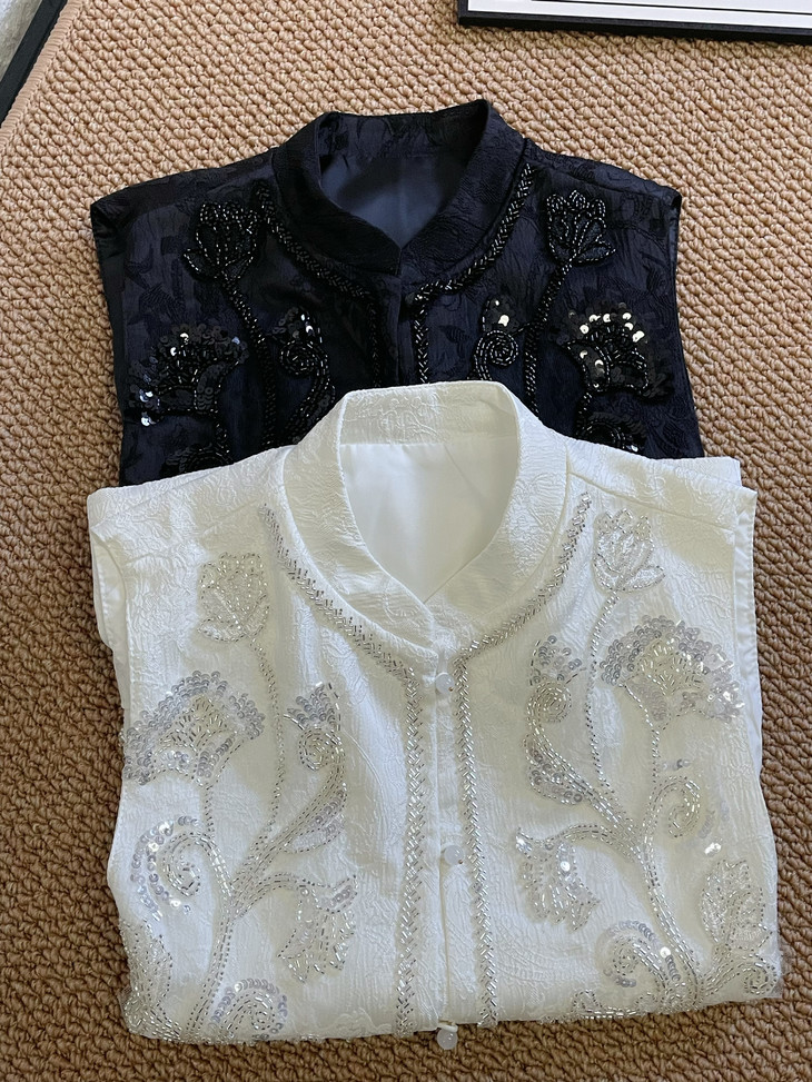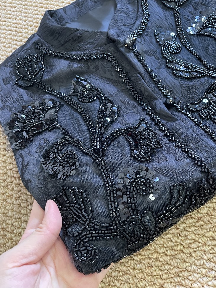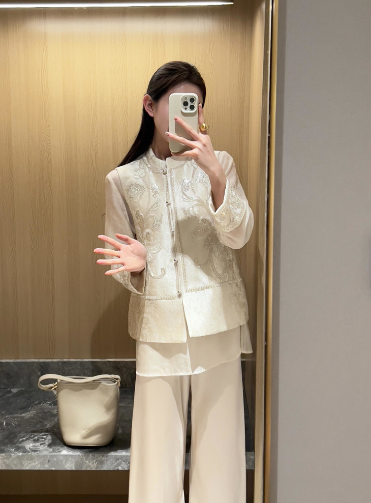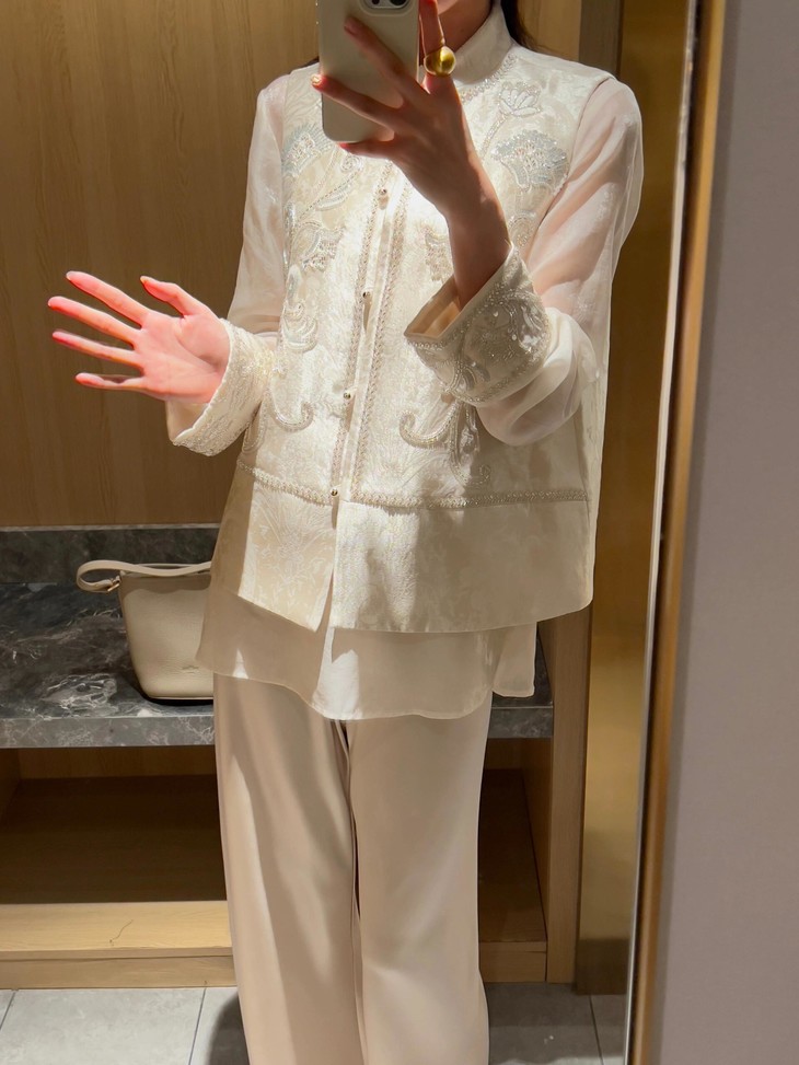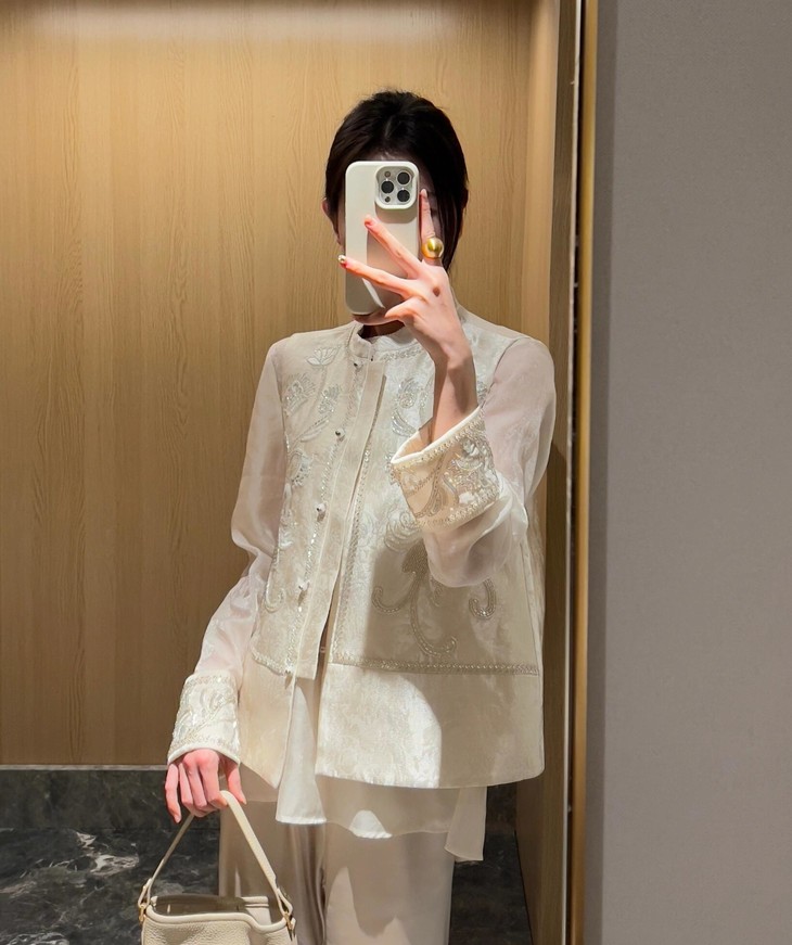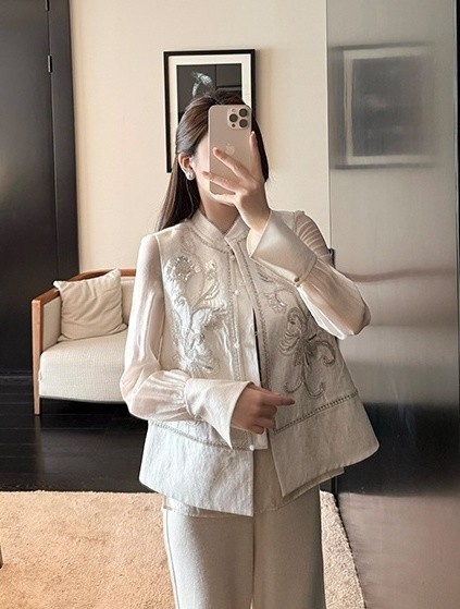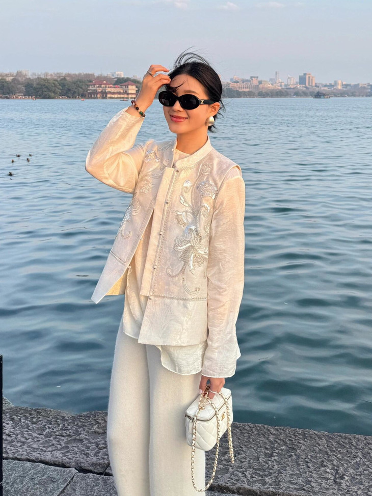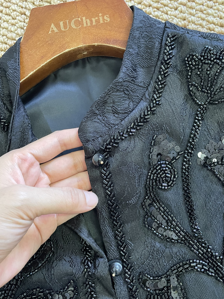 别致的立领设计时髦有型 修饰脸型显脸小 相比常见的领型更温暖脖颈 同时给人端庄秀丽 古风韵味自然流露 前面整片都是刺绣的珠片和小米珠 华丽又精致 搭配门襟单排米色系的玉石扣子复古细腻 兼顾了方便与细节美感 细节满满 为单调平添古韵 敞开或是单穿都很洋气~