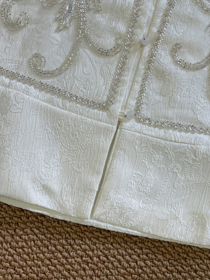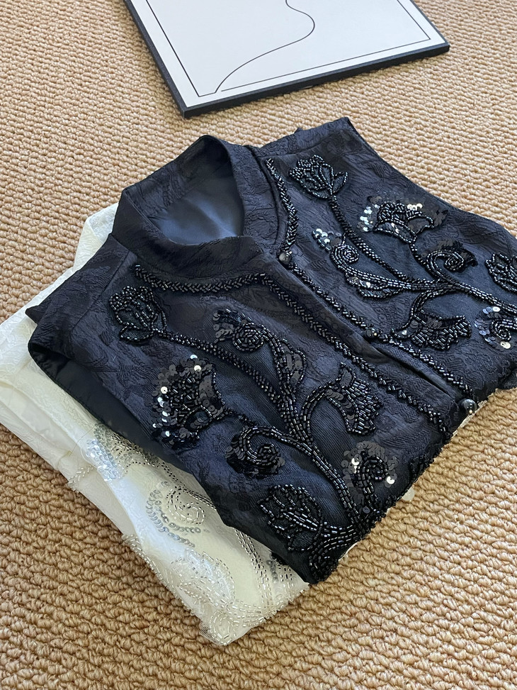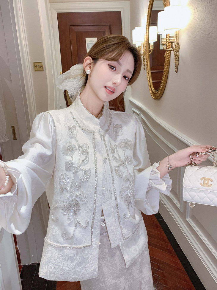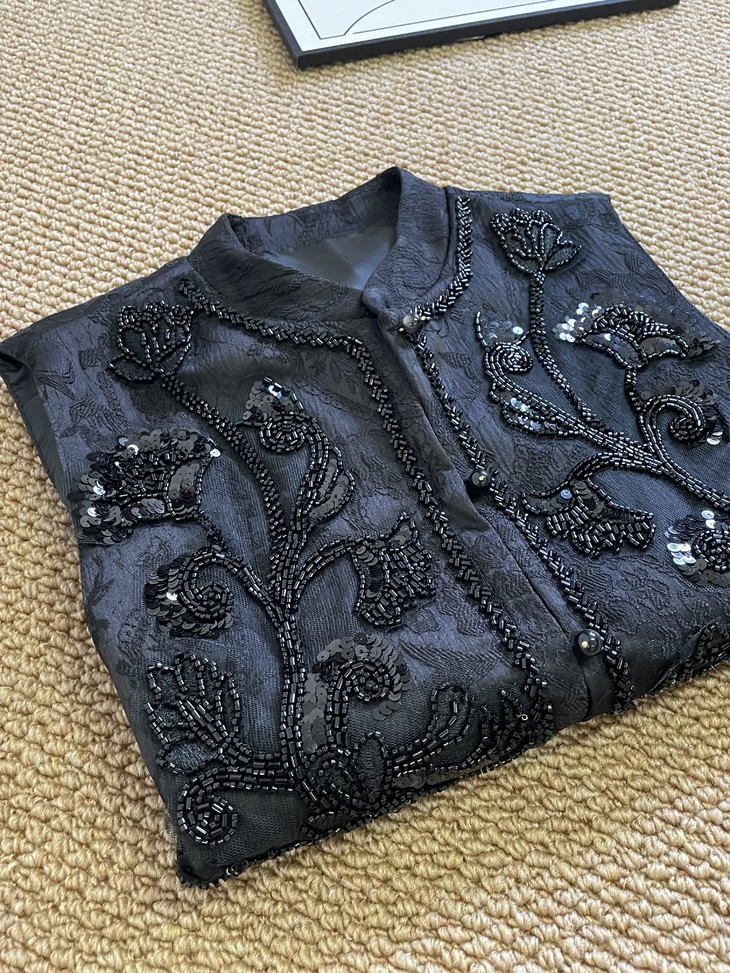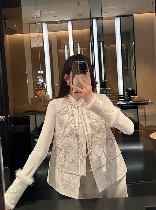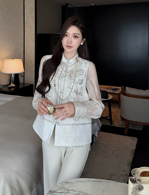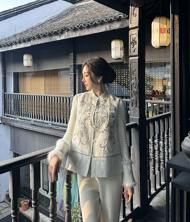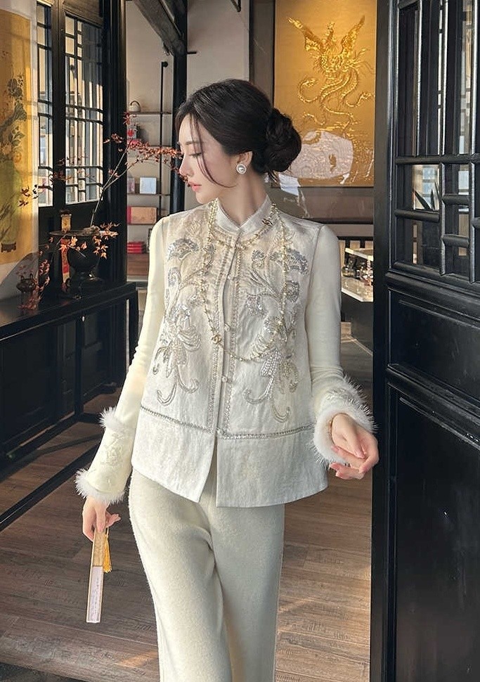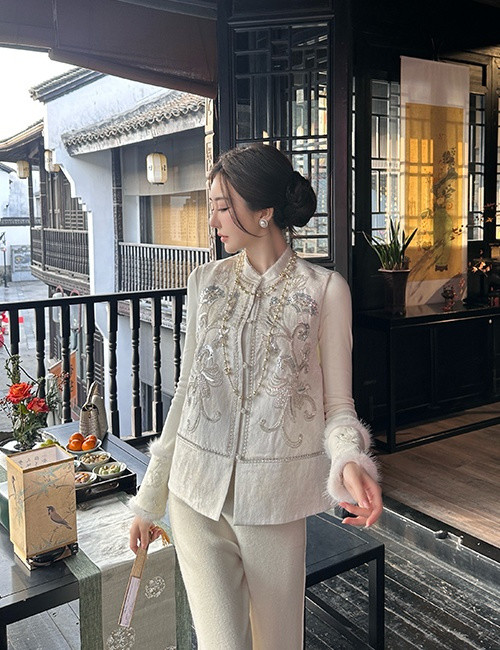 别致的立领设计时髦有型 修饰脸型显脸小 相比常见的领型更温暖脖颈 同时给人端庄秀丽 古风韵味自然流露 前面整片都是刺绣的珠片和小米珠 华丽又精致 搭配门襟单排米色系的玉石扣子复古细腻 兼顾了方便与细节美感 细节满满 为单调平添古韵 敞开或是单穿都很洋气~