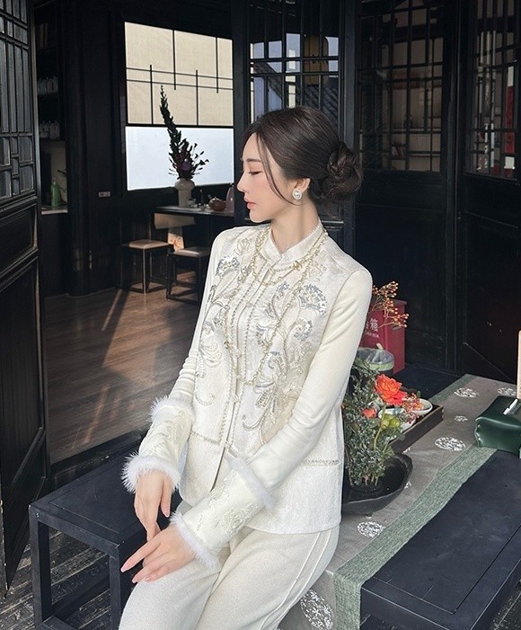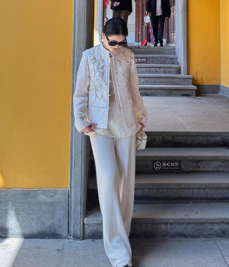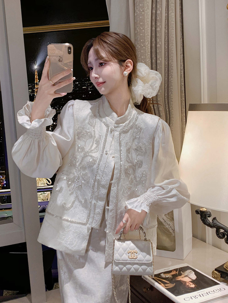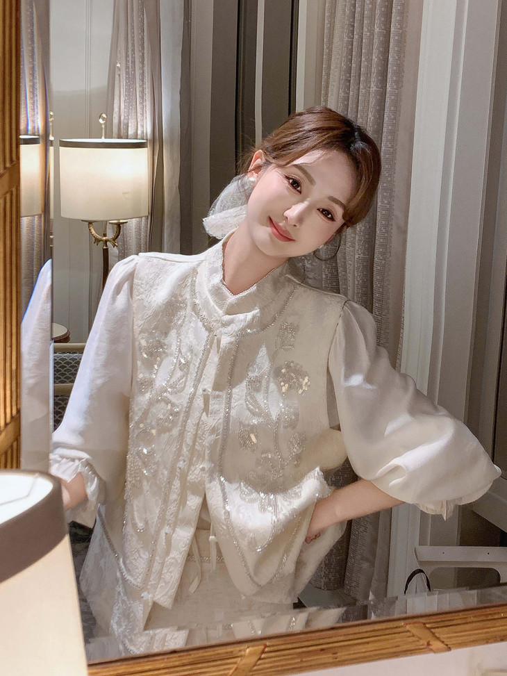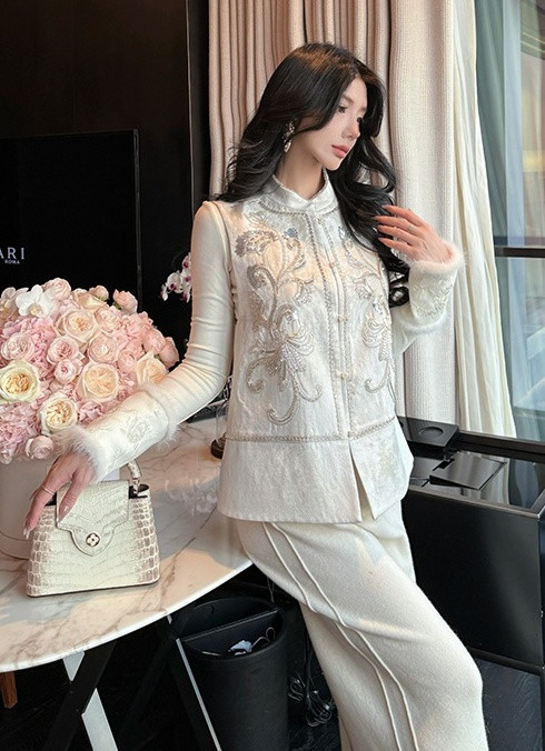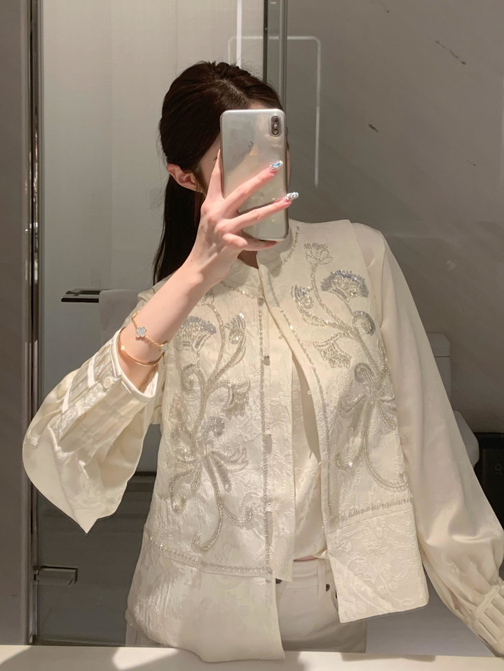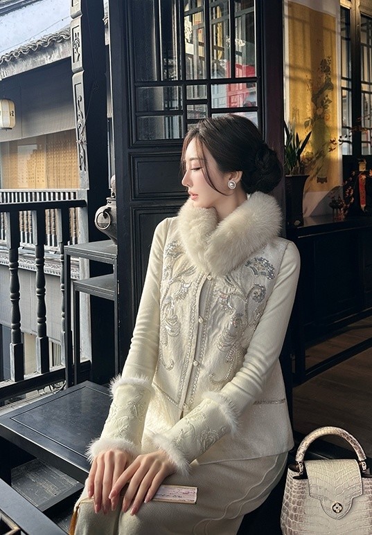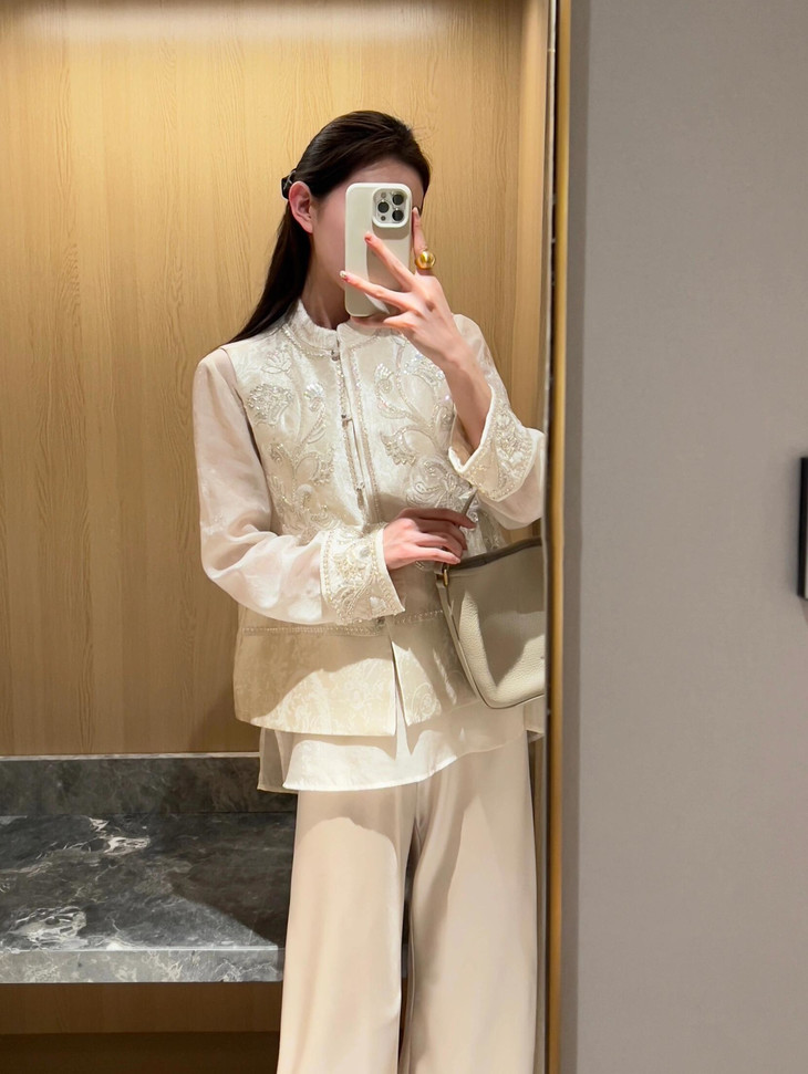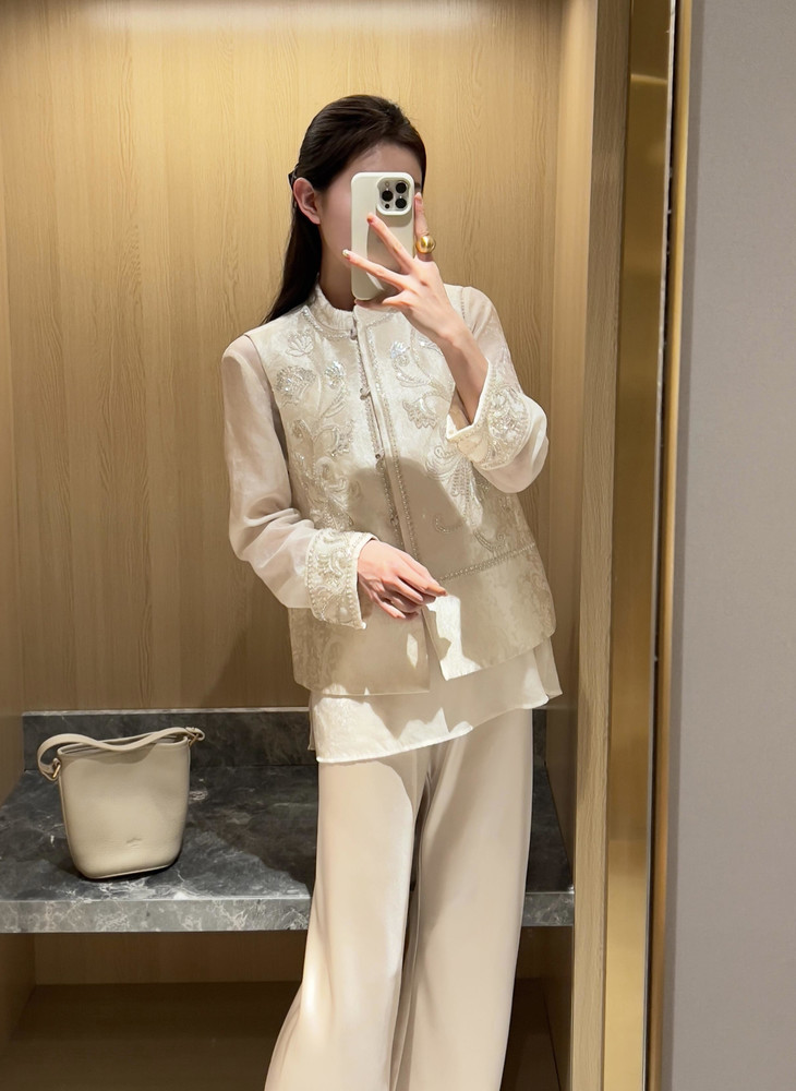 别致的立领设计时髦有型 修饰脸型显脸小 相比常见的领型更温暖脖颈 同时给人端庄秀丽 古风韵味自然流露 前面整片都是刺绣的珠片和小米珠 华丽又精致 搭配门襟单排米色系的玉石扣子复古细腻 兼顾了方便与细节美感 细节满满 为单调平添古韵 敞开或是单穿都很洋气~